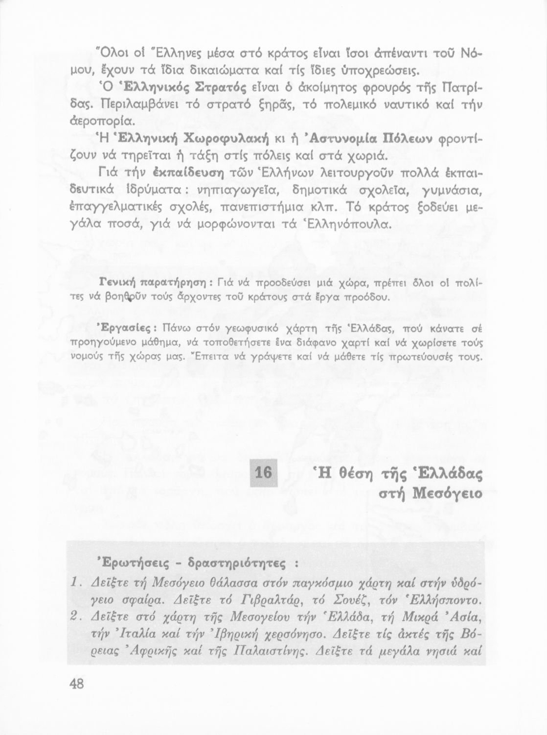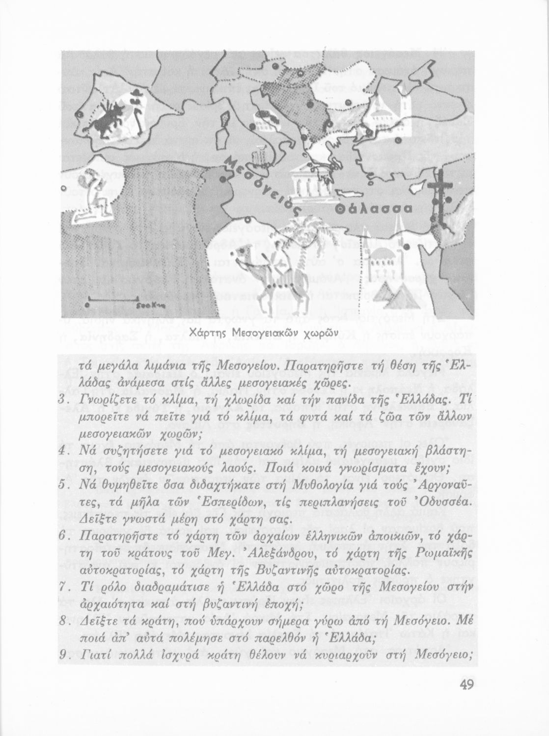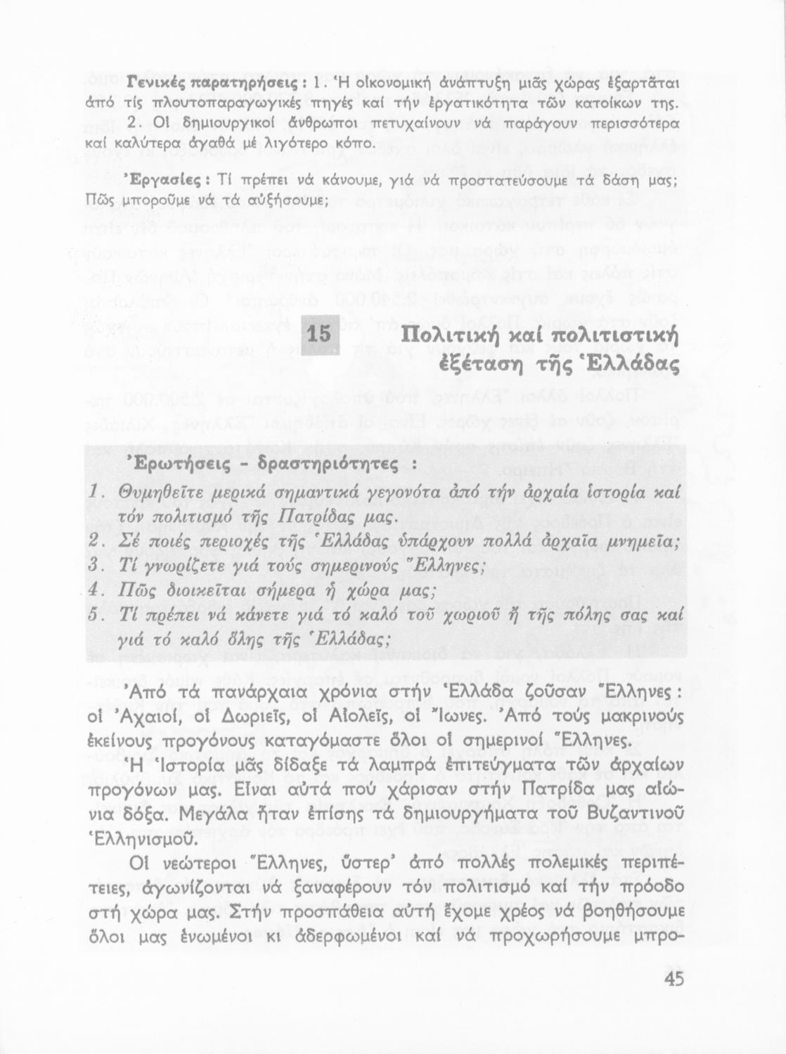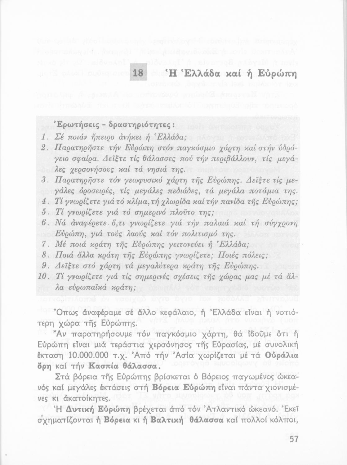 Σχολικό εγχειρίδιο Γεωγραφίας Ε΄ Δημοτικού που περιλαμβάνει εισαγωγή στη φυσική γεωγραφία εξετάζει την Ελλάδα και ενδεικτικές χώρες και περιοχές από τις πέντε ηπείρους, εκτός της Ευρώπης, από γεωφυσική και πολιτική άποψη.