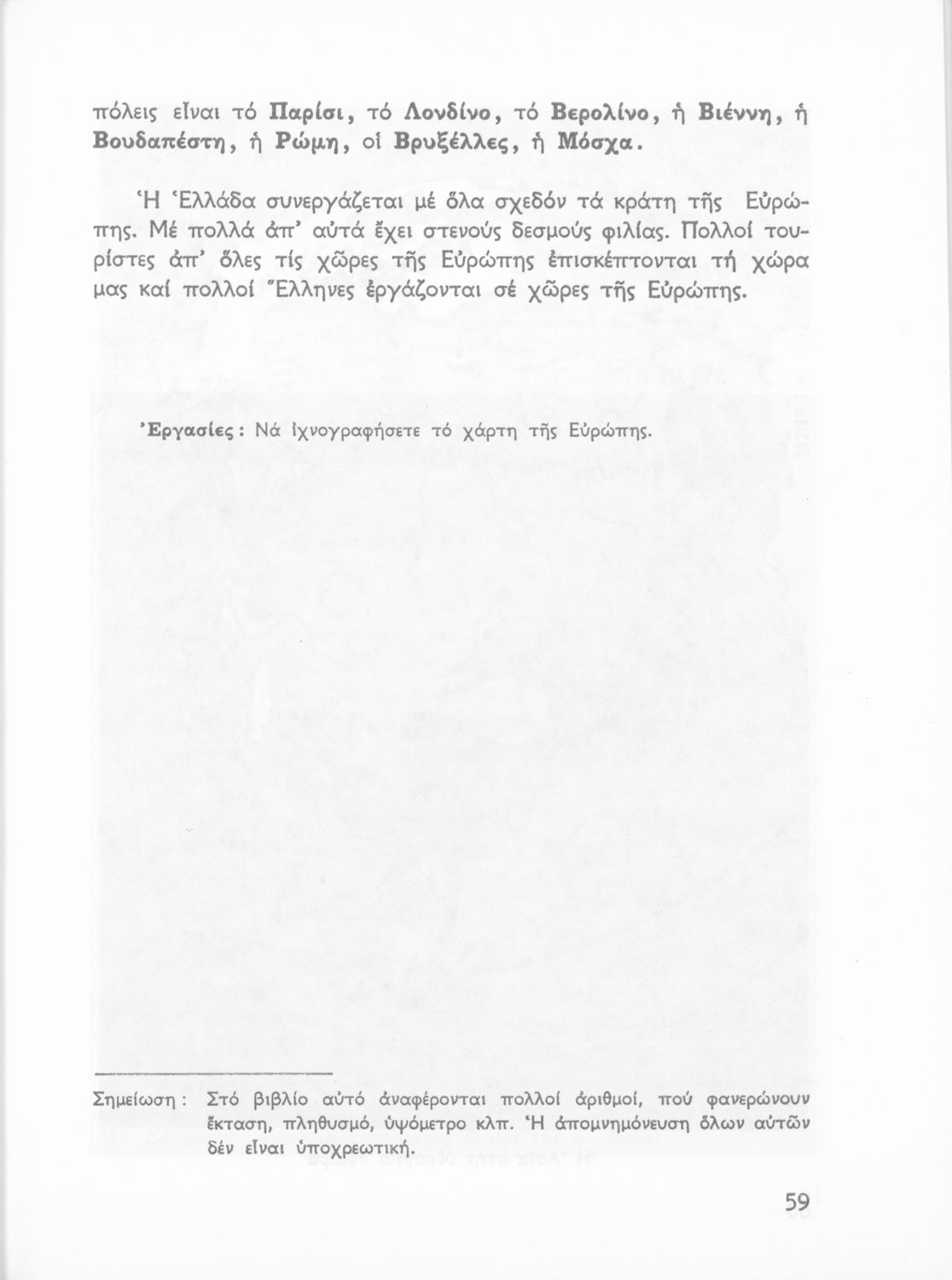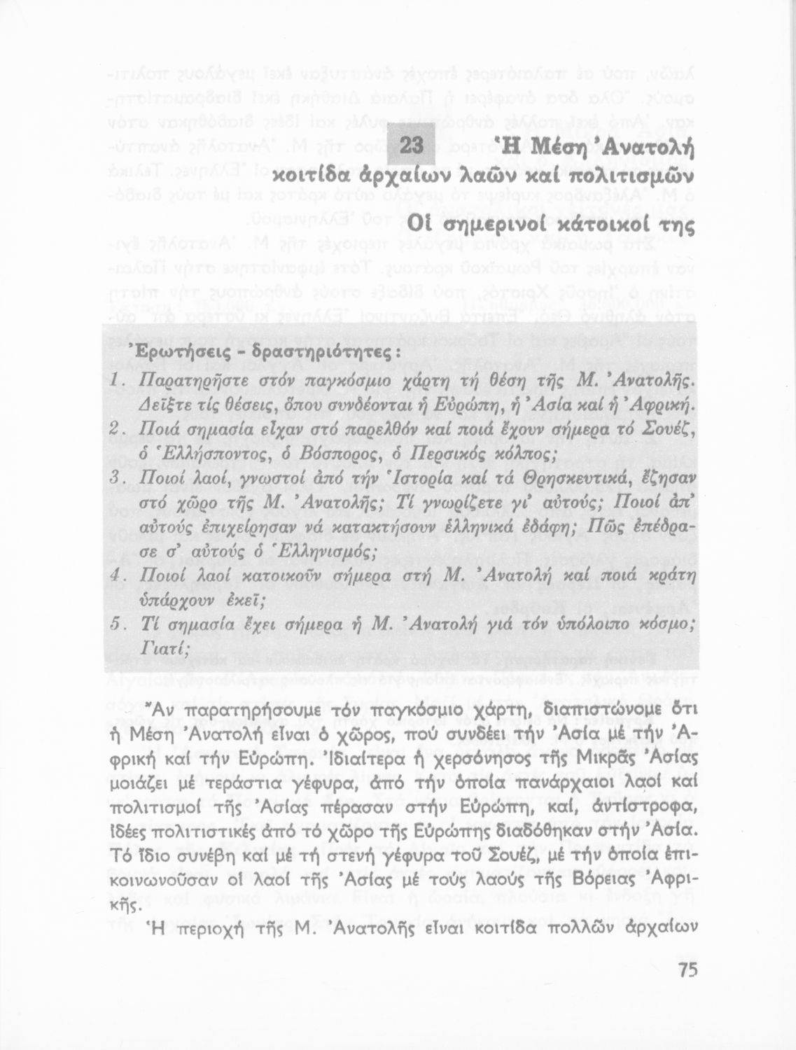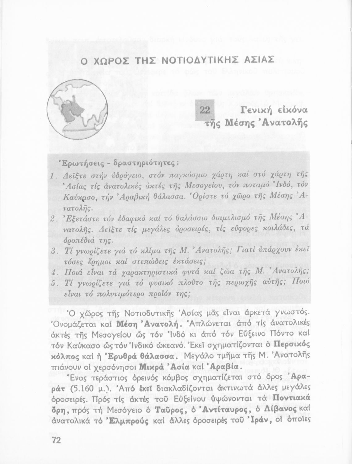 Σχολικό εγχειρίδιο Γεωγραφίας Ε΄ Δημοτικού που περιλαμβάνει εισαγωγή στη φυσική γεωγραφία εξετάζει την Ελλάδα και ενδεικτικές χώρες και περιοχές από τις πέντε ηπείρους, εκτός της Ευρώπης, από γεωφυσική και πολιτική άποψη.