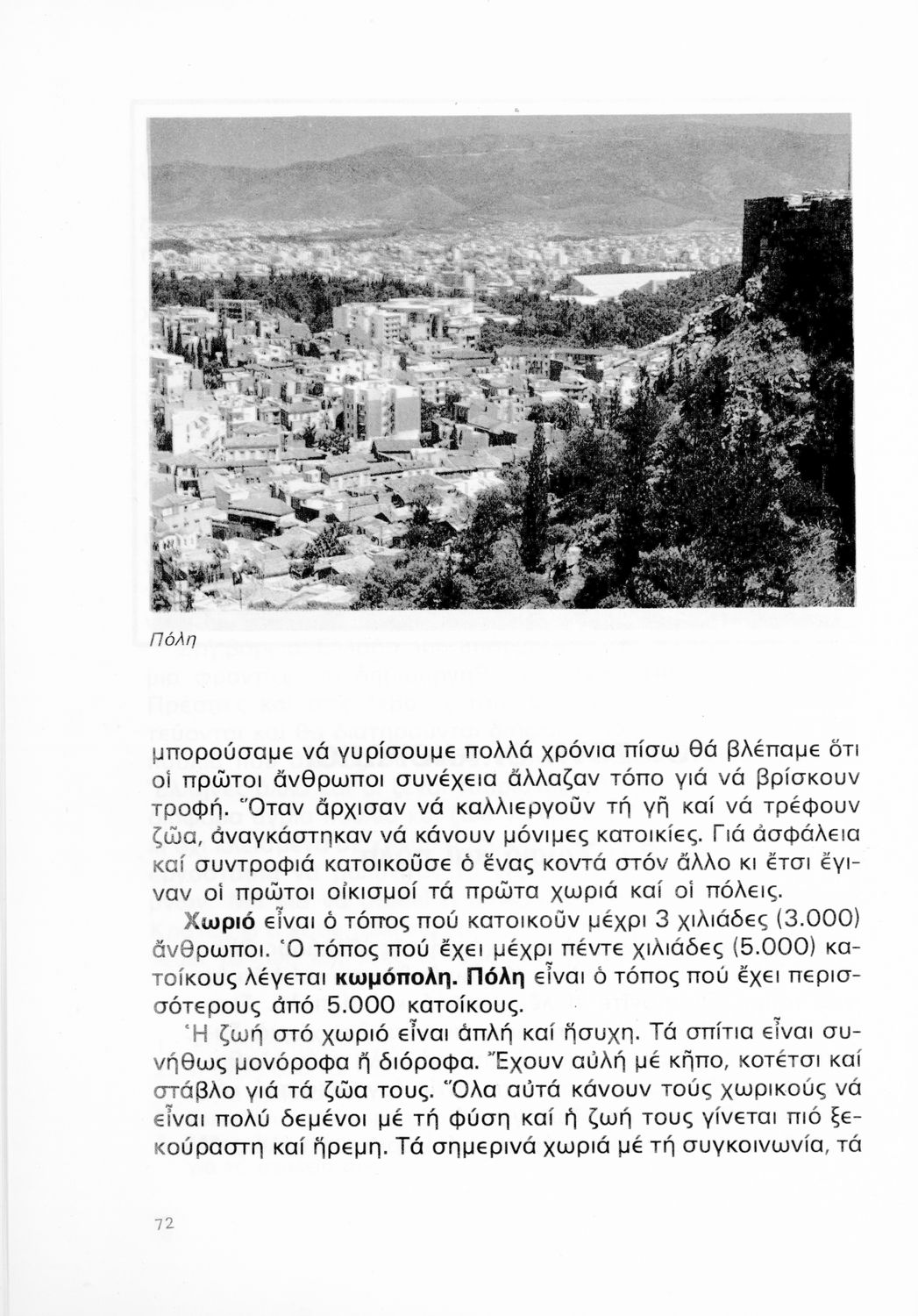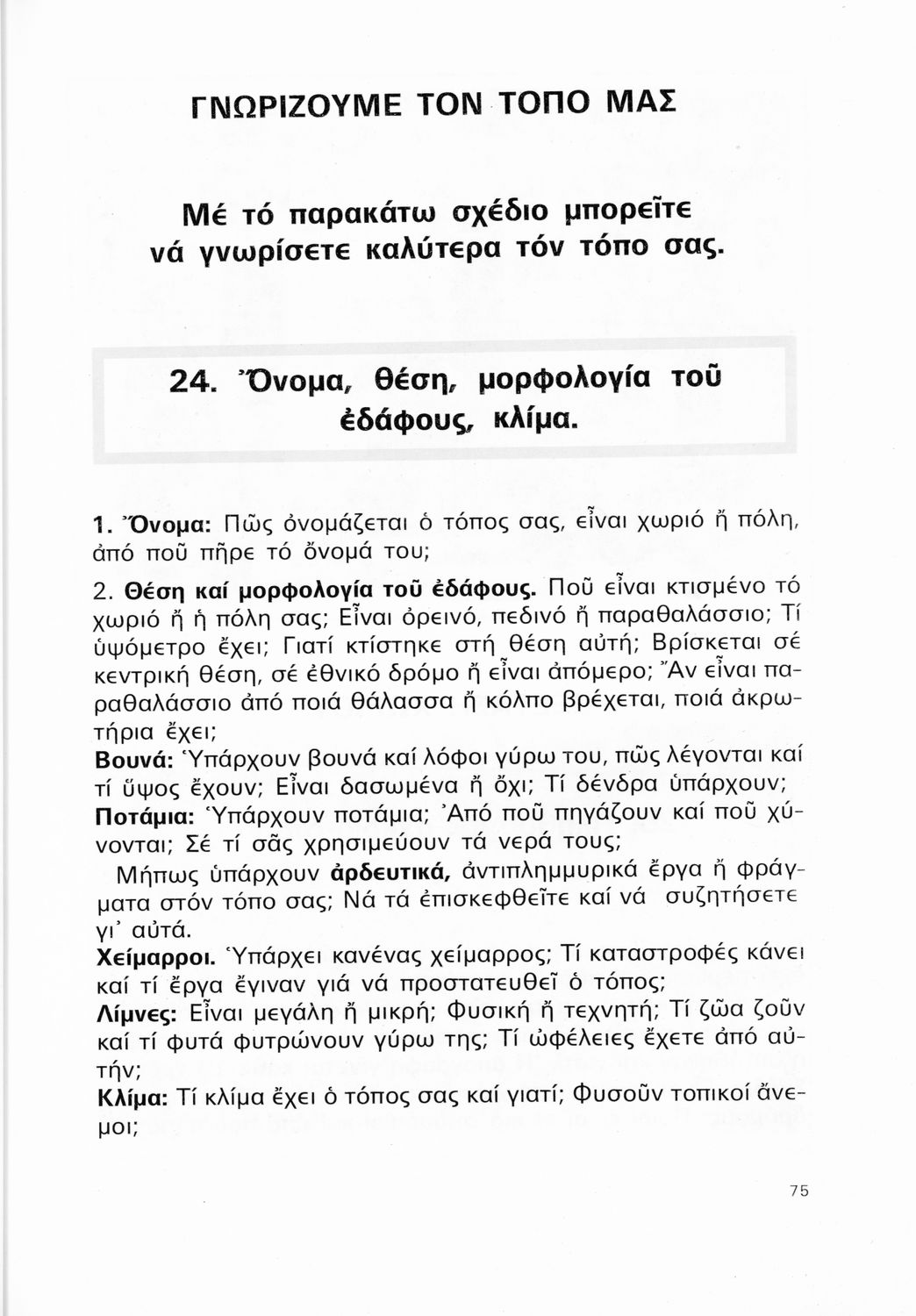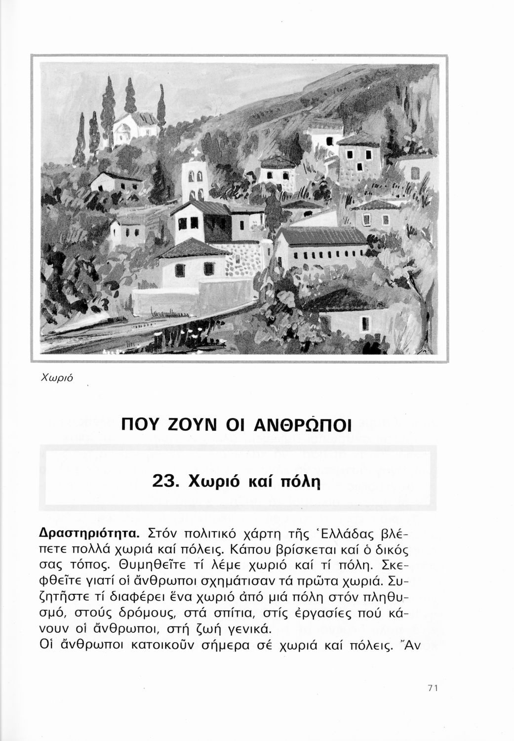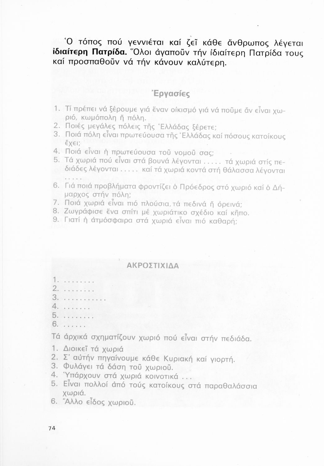 Σχολικό εγχειρίδιο Γεωγραφίας για τη Γ΄, Δ΄ Δημοτικού. Μελετά την Ελλάδα ανά γεωγραφικό νομό με πληροφορίες από το χάρτη της περιοχής και στοιχεία της ιστορίας και της οικονομικής ζωής.