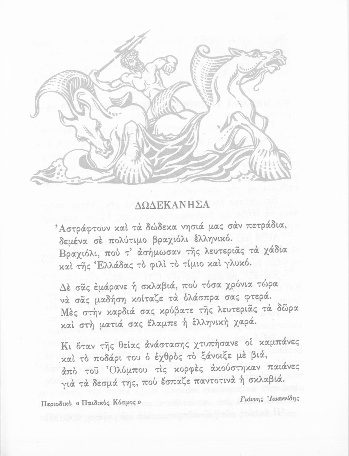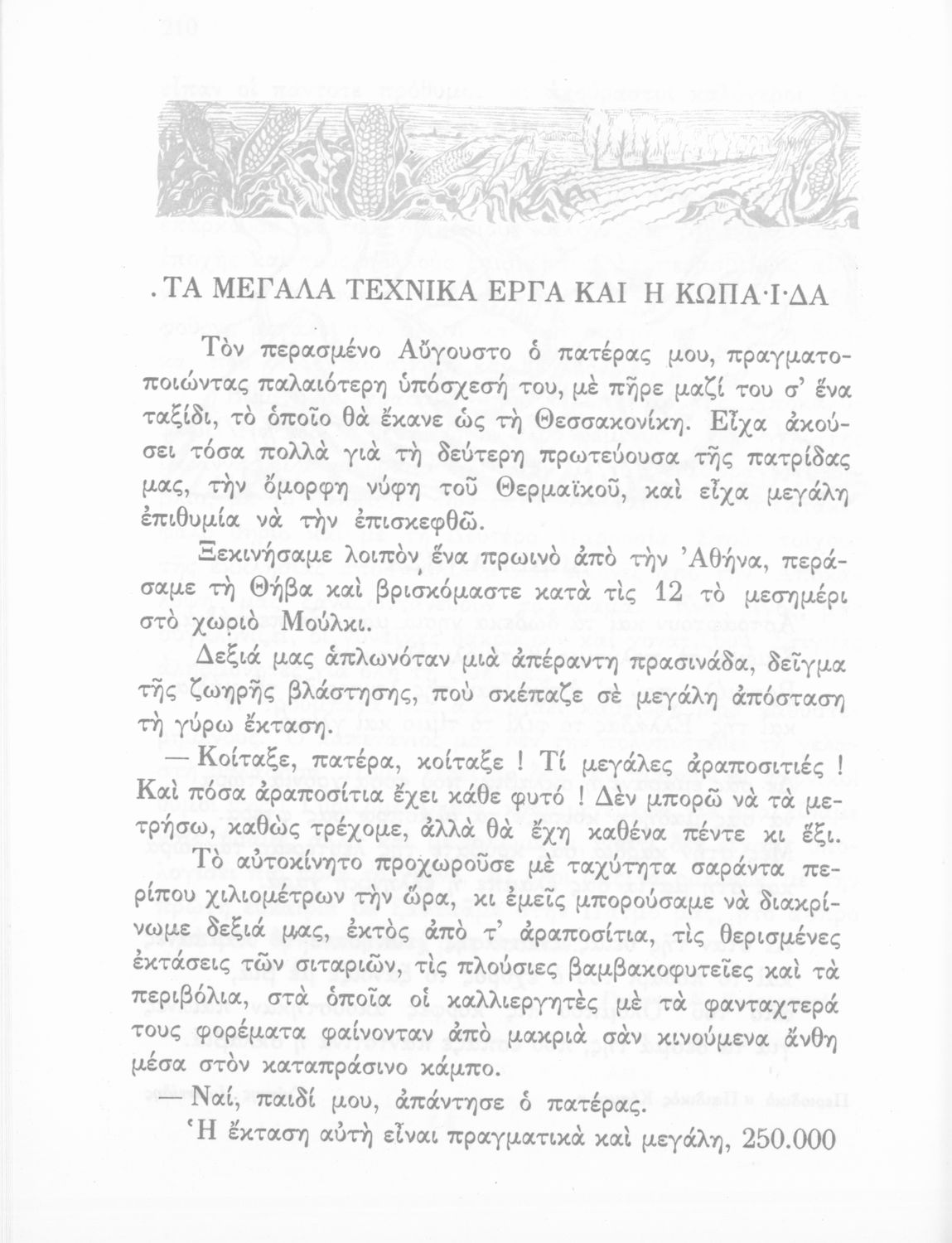 Αναγνωστικό Ε΄ Δημοτικού που περιέχει κείμενα εμπνευσμένα από την εθνική, κοινωνική και οικογενειακή ζωή και την ελληνική φύση, μυθολογία και ιστορία.
