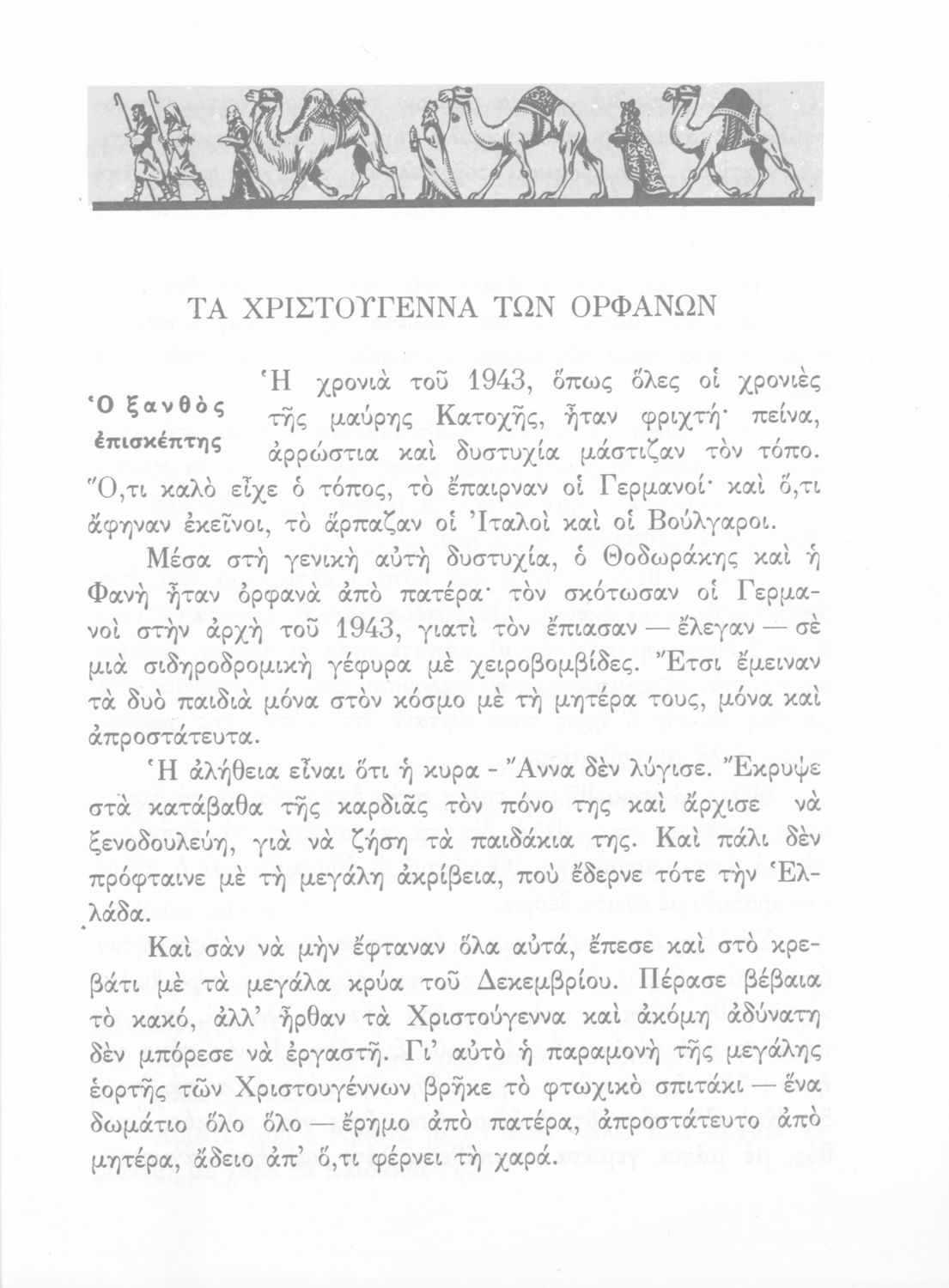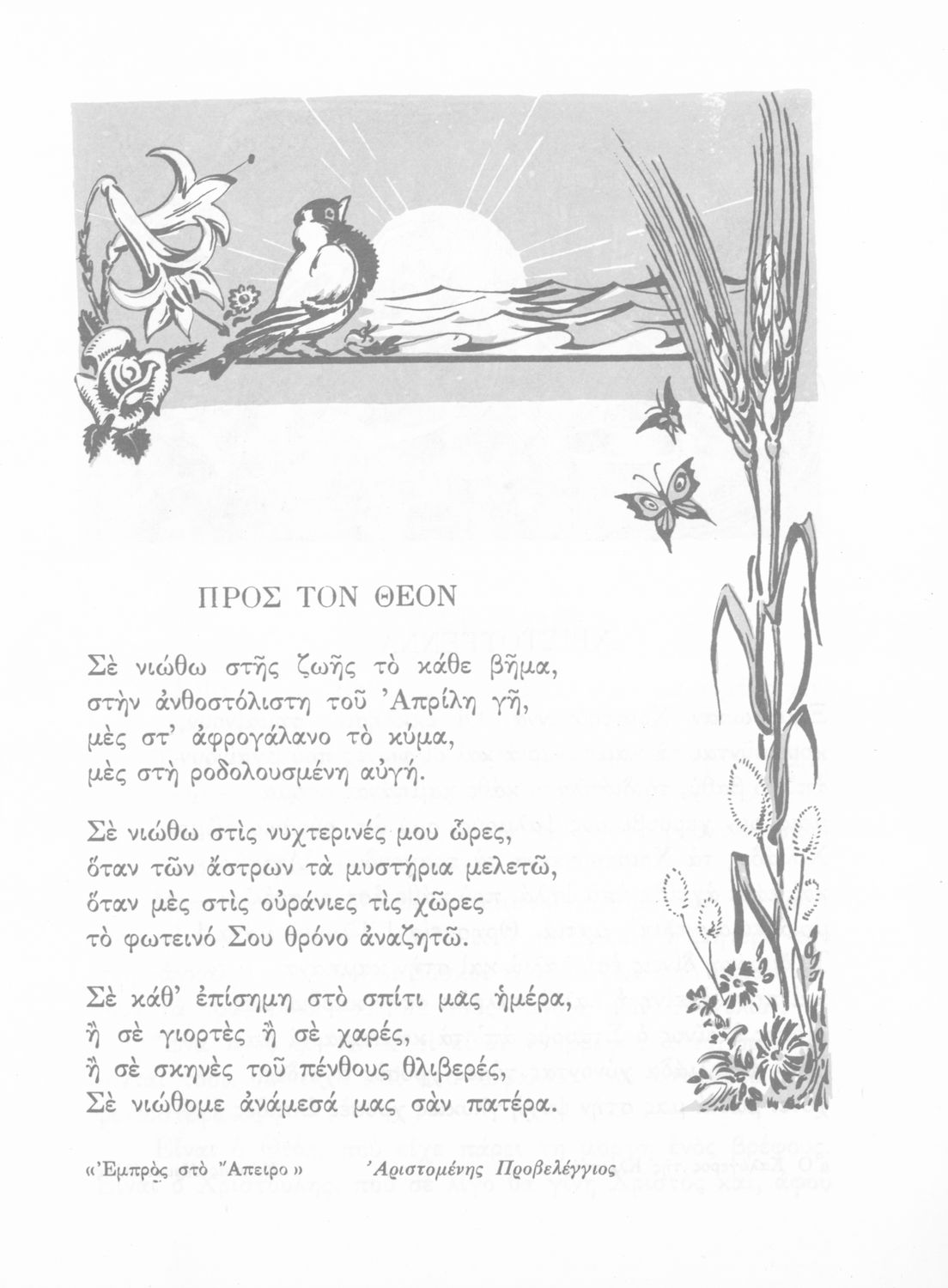 Αναγνωστικό Ε΄ Δημοτικού που περιέχει κείμενα εμπνευσμένα από την εθνική, κοινωνική και οικογενειακή ζωή και την ελληνική φύση, μυθολογία και ιστορία. Φέρει το σύμβολο της δικτατορίας.