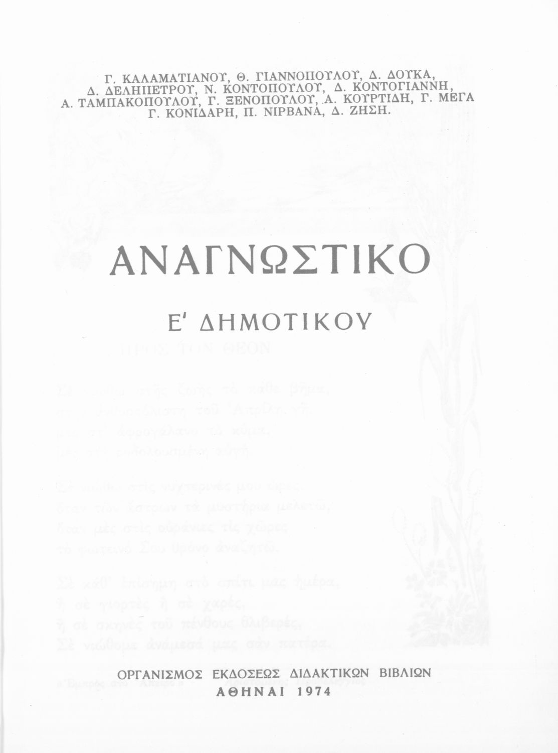 Αναγνωστικό Ε΄ Δημοτικού που περιέχει πεζά και ποιήματα Ελλήνων λογοτεχνών για την εκμάθηση της ελληνικής γλώσσας.