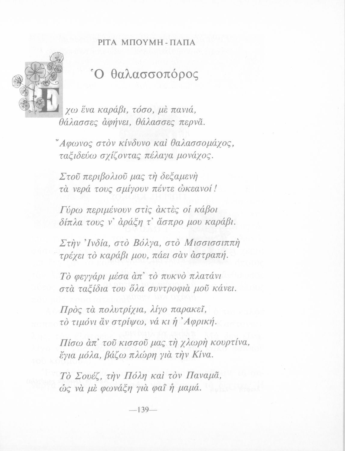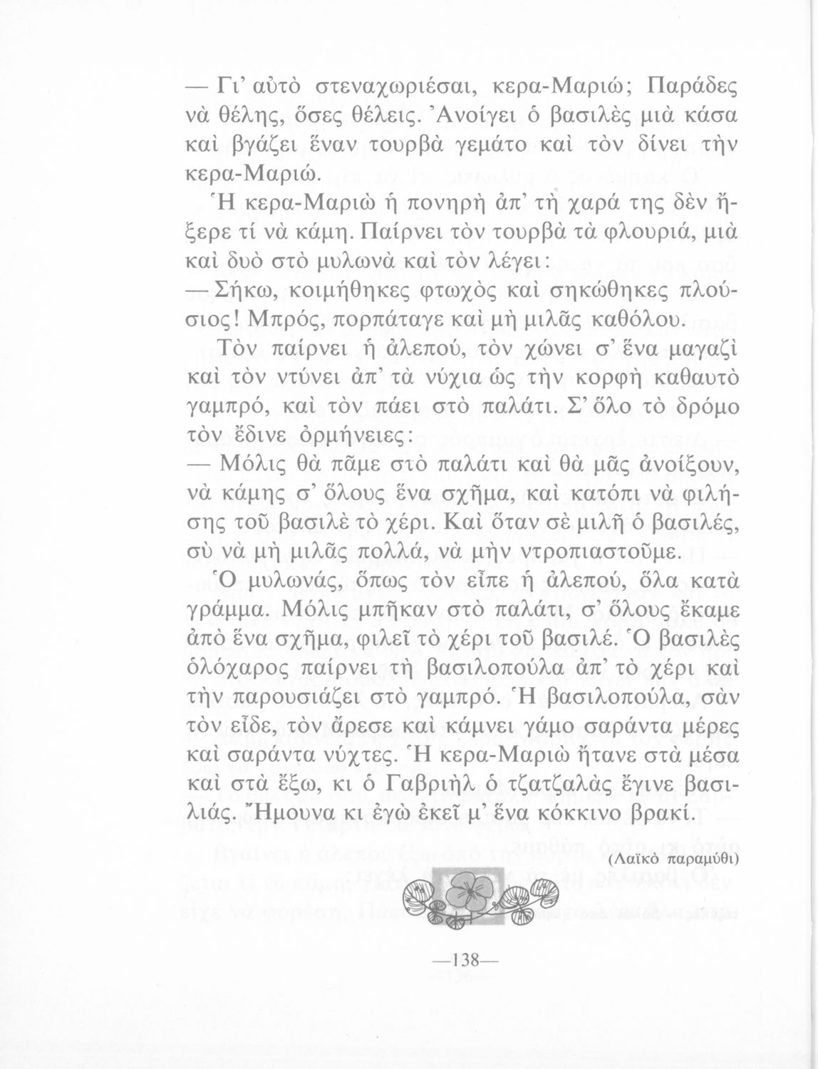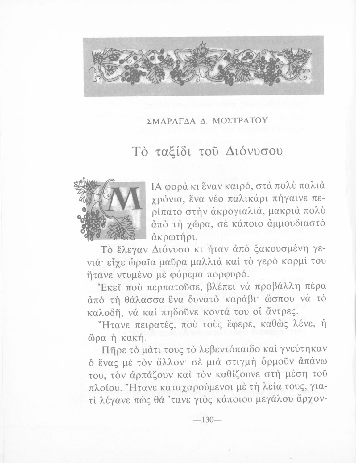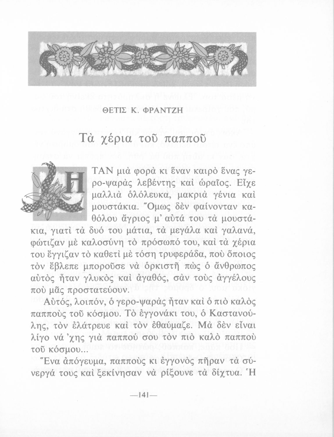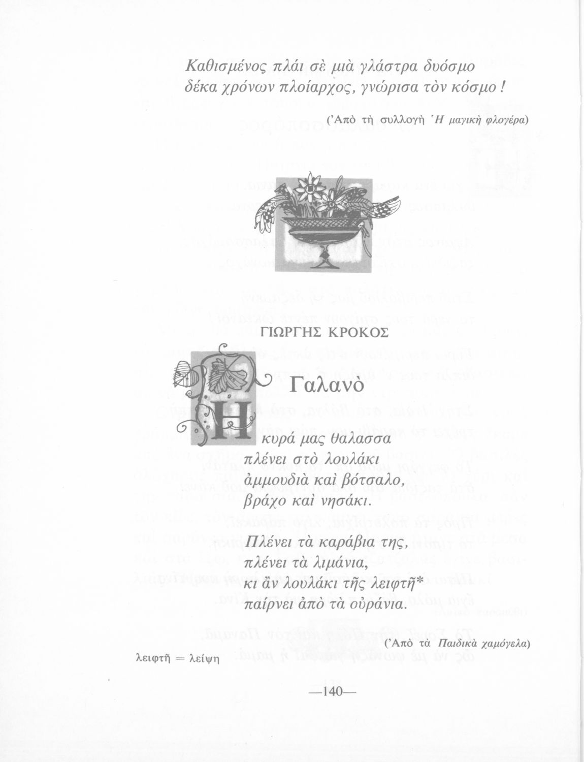 Αναγνωστικό για τους μαθητές της Γ΄ και Δ΄ Δημοτικού που περιλαμβάνει με πεζά και ποιήματα της νέας ελληνικής λογοτεχνίας εμπνευσμένα από την καθημερινότητα των παιδιών και των οικογενειών τους, την ελληνική ιστορία, τις οικογενειακές στιγμές και εορτές, το παιχνίδι, τα επαγγέλματα και τις ασχολίες των ανθρώπων. Το βιβλίο είναι αφιερωμένο στη μνήμη του Γρηγορίου Ξενόπουλου.