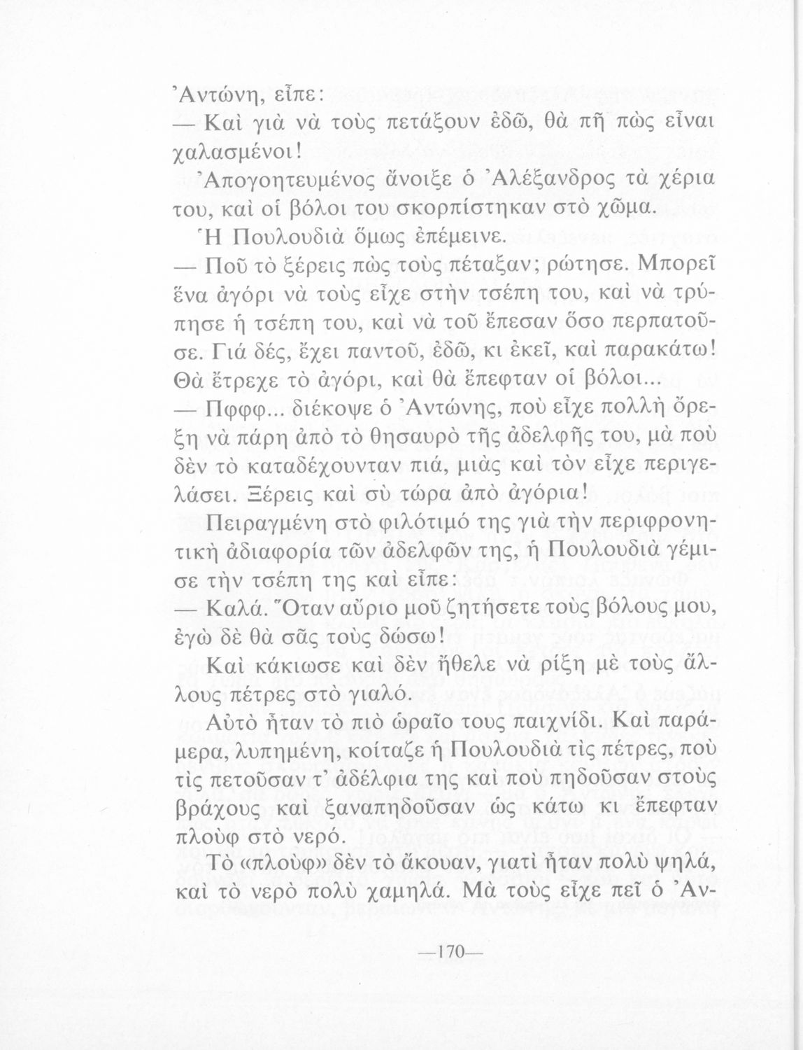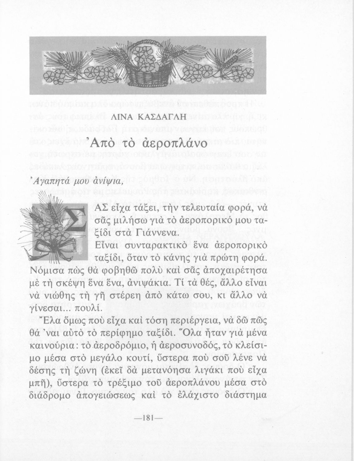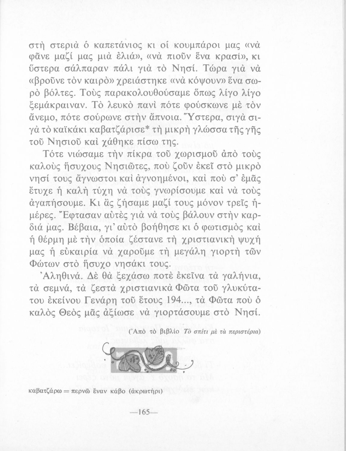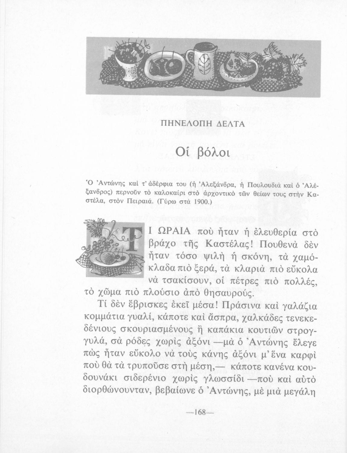 Αναγνωστικό για τους μαθητές της Γ΄ και Δ΄ Δημοτικού που περιλαμβάνει με πεζά και ποιήματα της νέας ελληνικής λογοτεχνίας εμπνευσμένα από την καθημερινότητα των παιδιών και των οικογενειών τους, την ελληνική ιστορία, τις οικογενειακές στιγμές και εορτές, το παιχνίδι, τα επαγγέλματα και τις ασχολίες των ανθρώπων. Το βιβλίο είναι αφιερωμένο στη μνήμη του Γρηγορίου Ξενόπουλου.