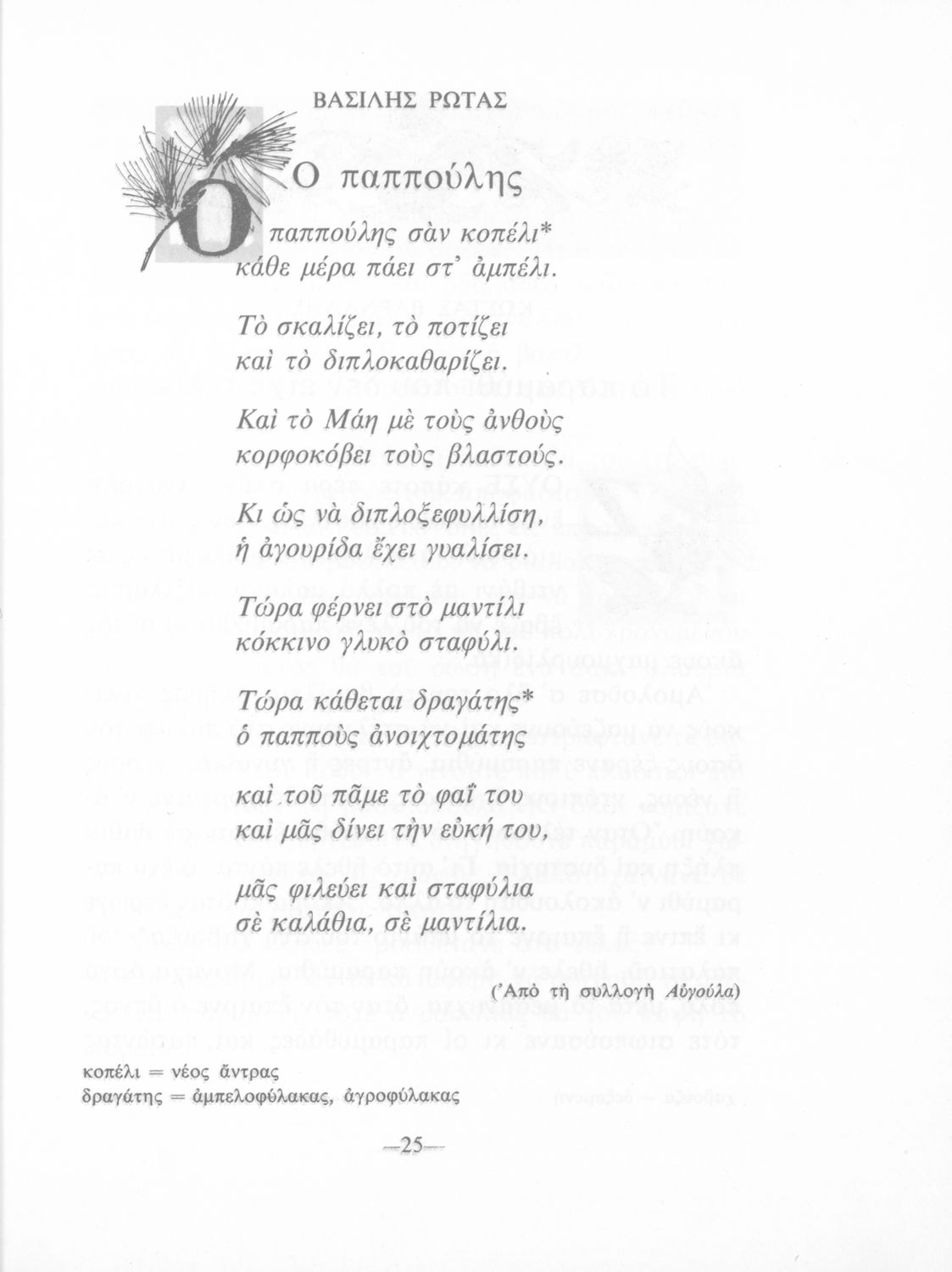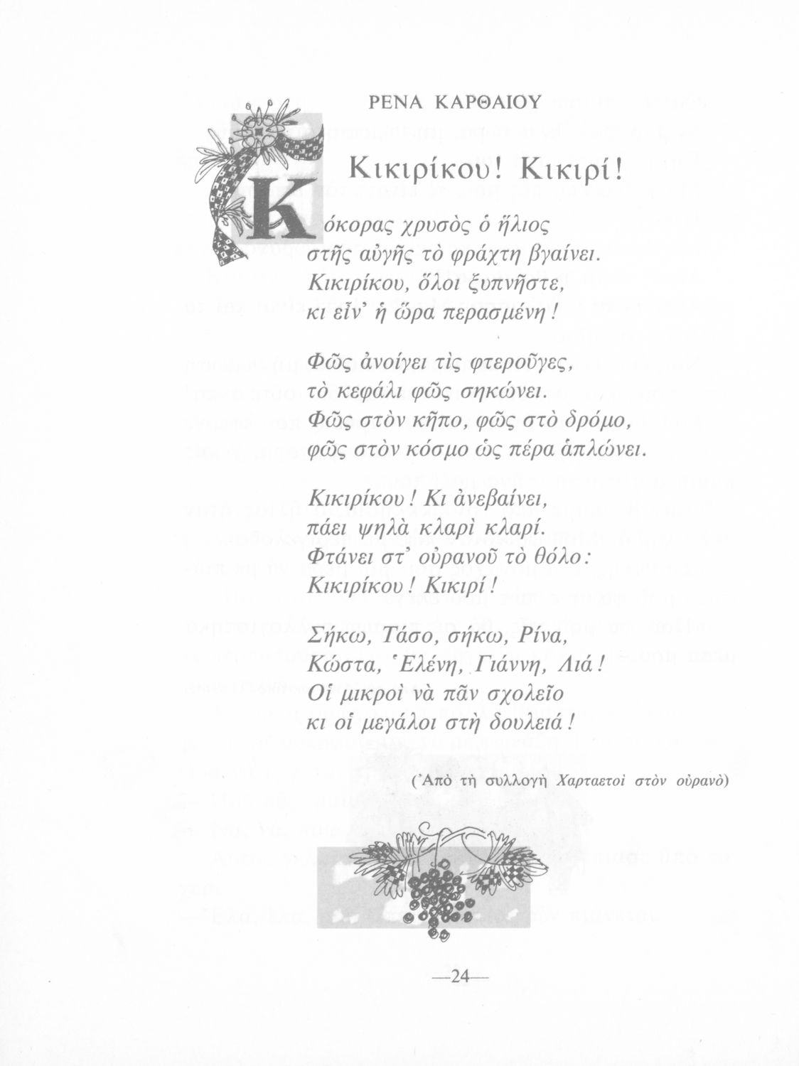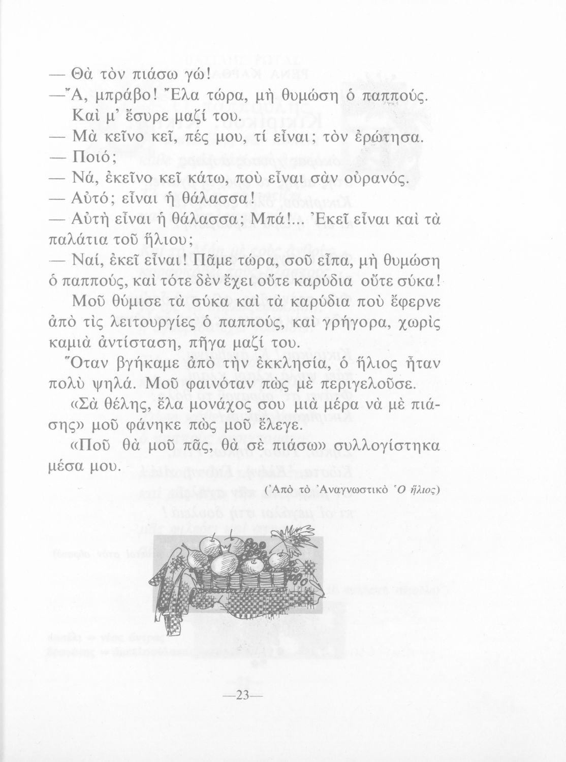 Αναγνωστικό για τους μαθητές της Γ΄ και Δ΄ Δημοτικού που περιλαμβάνει με πεζά και ποιήματα της νέας ελληνικής λογοτεχνίας εμπνευσμένα από την καθημερινότητα των παιδιών και των οικογενειών τους, την ελληνική ιστορία, τις οικογενειακές στιγμές και εορτές, το παιχνίδι, τα επαγγέλματα και τις ασχολίες των ανθρώπων. Το βιβλίο είναι αφιερωμένο στη μνήμη του Γρηγορίου Ξενόπουλου.