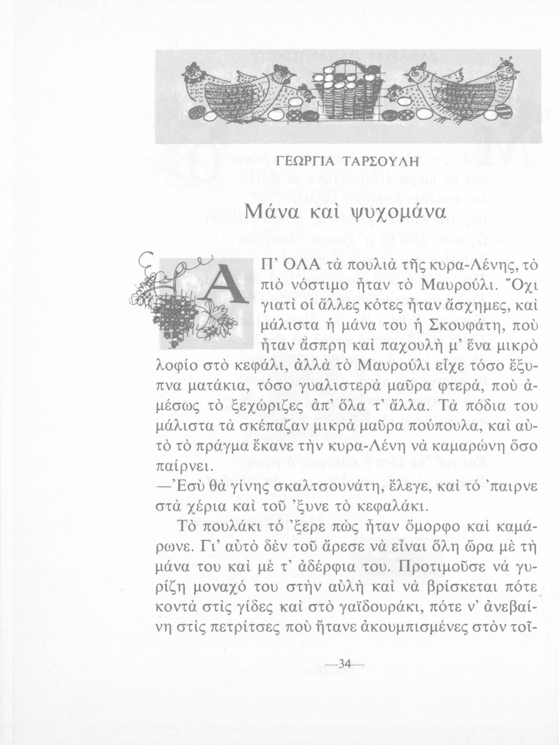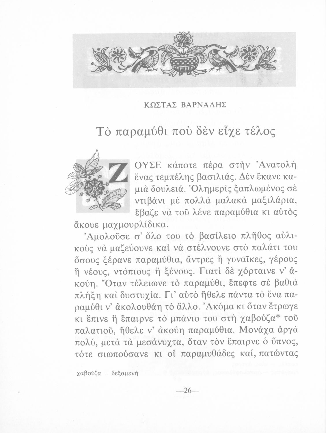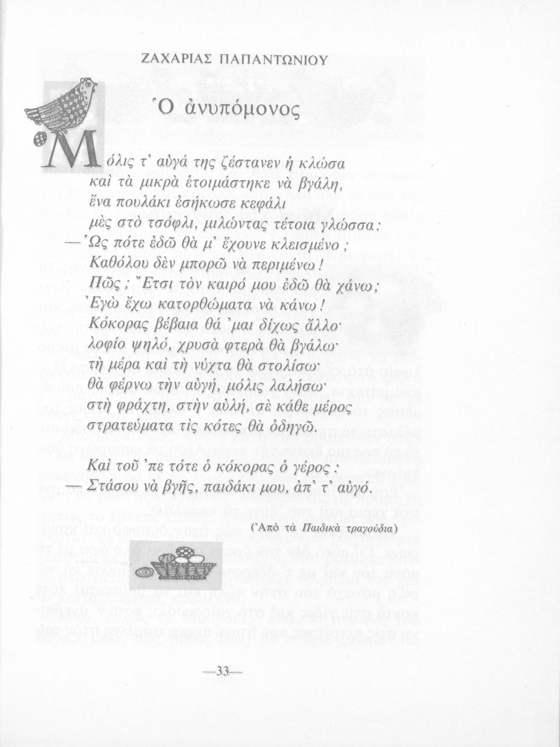 Αναγνωστικό για τους μαθητές της Γ΄ και Δ΄ Δημοτικού που περιλαμβάνει με πεζά και ποιήματα της νέας ελληνικής λογοτεχνίας εμπνευσμένα από την καθημερινότητα των παιδιών και των οικογενειών τους, την ελληνική ιστορία, τις οικογενειακές στιγμές και εορτές, το παιχνίδι, τα επαγγέλματα και τις ασχολίες των ανθρώπων. Το βιβλίο είναι αφιερωμένο στη μνήμη του Γρηγορίου Ξενόπουλου.