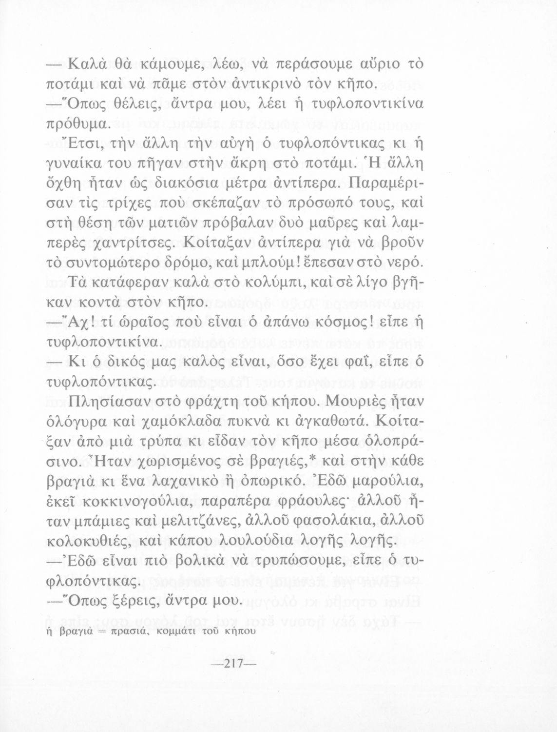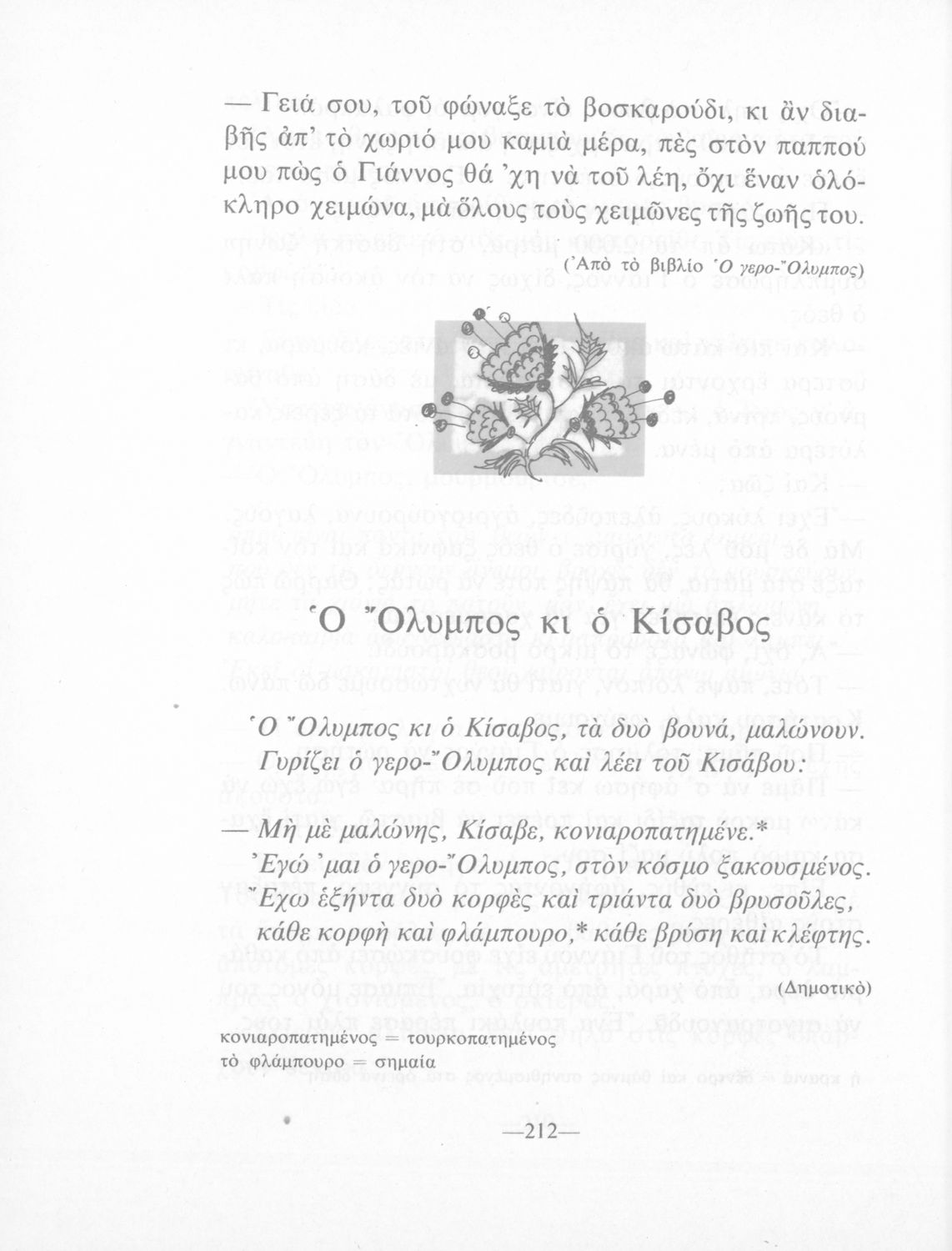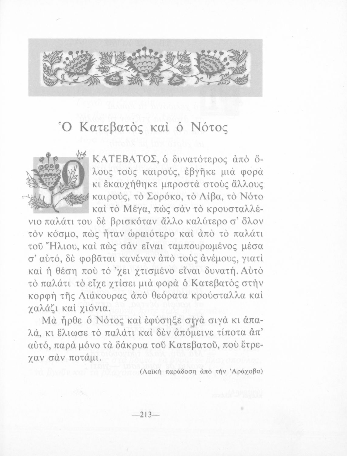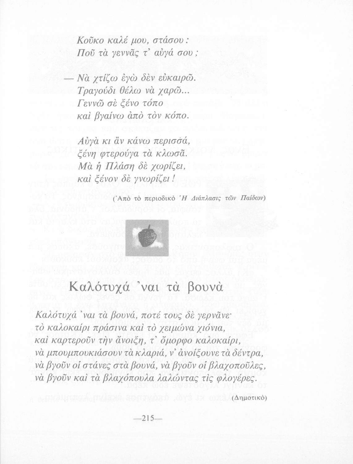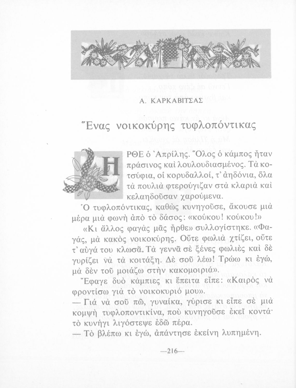 Αναγνωστικό για τους μαθητές της Γ΄ και Δ΄ Δημοτικού που περιλαμβάνει με πεζά και ποιήματα της νέας ελληνικής λογοτεχνίας εμπνευσμένα από την καθημερινότητα των παιδιών και των οικογενειών τους, την ελληνική ιστορία, τις οικογενειακές στιγμές και εορτές, το παιχνίδι, τα επαγγέλματα και τις ασχολίες των ανθρώπων. Το βιβλίο είναι αφιερωμένο στη μνήμη του Γρηγορίου Ξενόπουλου.