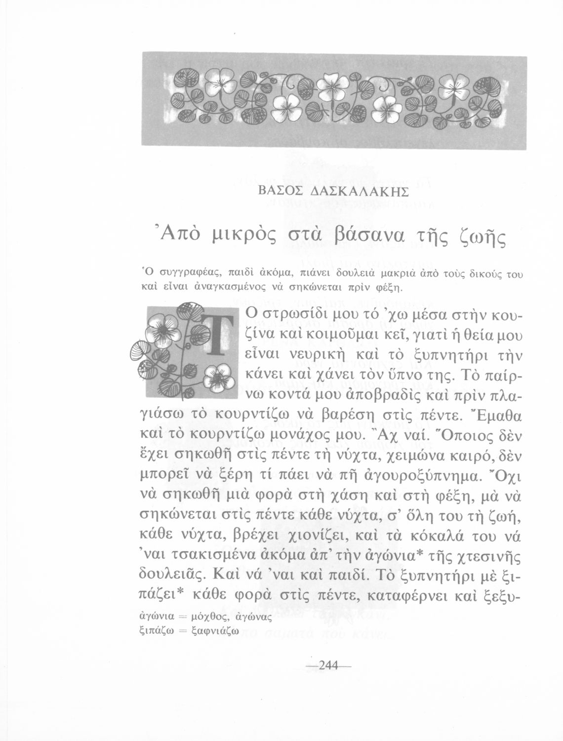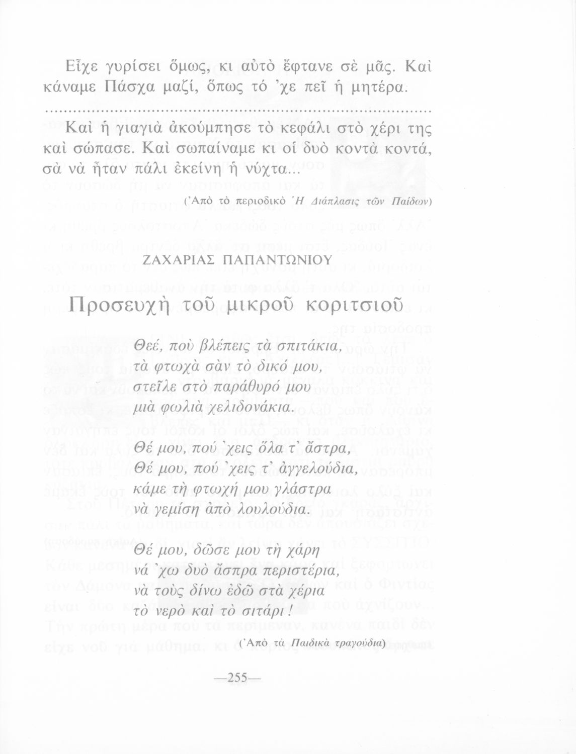 Αναγνωστικό για τους μαθητές της Γ΄ και Δ΄ Δημοτικού που περιλαμβάνει με πεζά και ποιήματα της νέας ελληνικής λογοτεχνίας εμπνευσμένα από την καθημερινότητα των παιδιών και των οικογενειών τους, την ελληνική ιστορία, τις οικογενειακές στιγμές και εορτές, το παιχνίδι, τα επαγγέλματα και τις ασχολίες των ανθρώπων. Το βιβλίο είναι αφιερωμένο στη μνήμη του Γρηγορίου Ξενόπουλου.