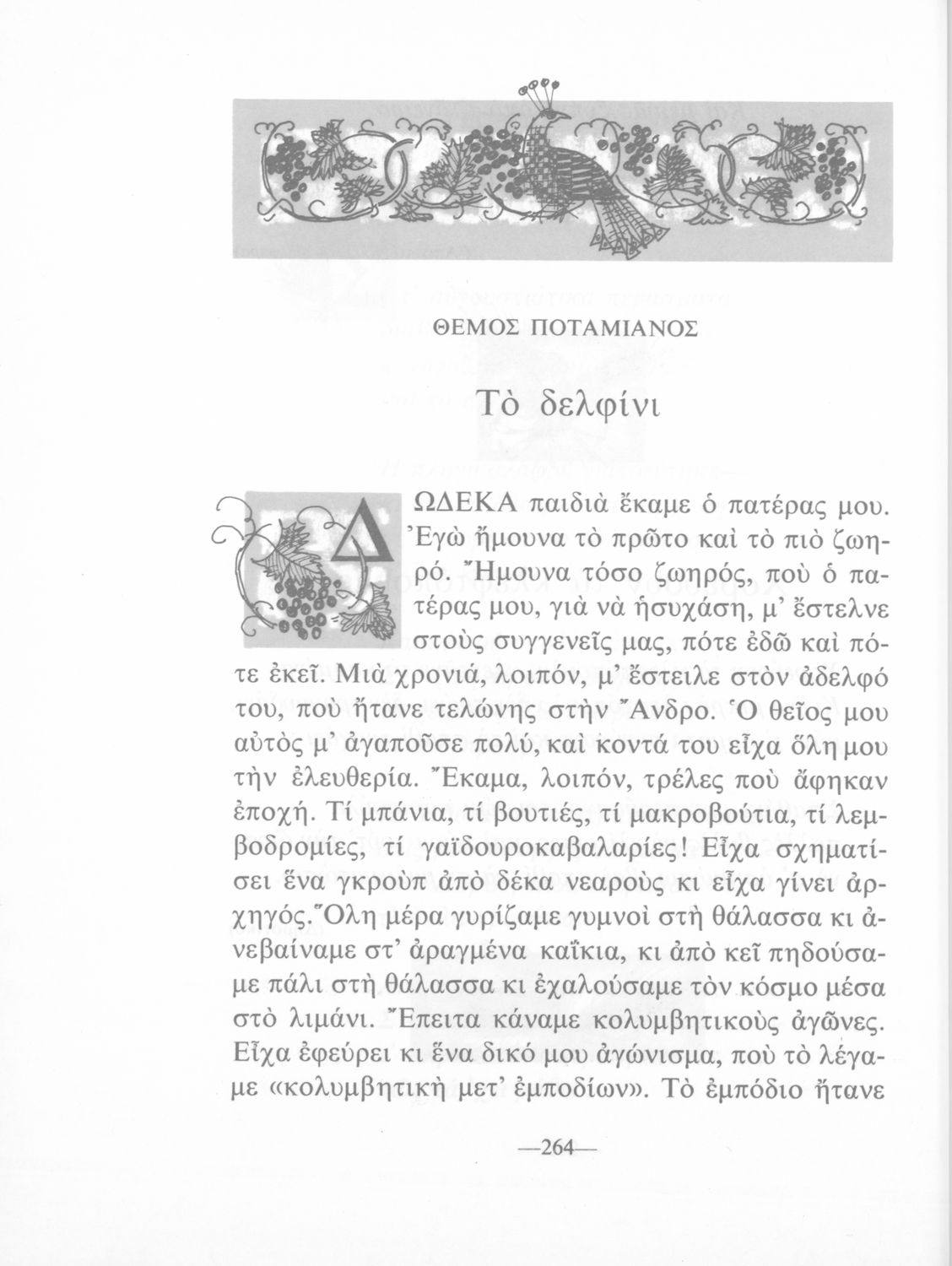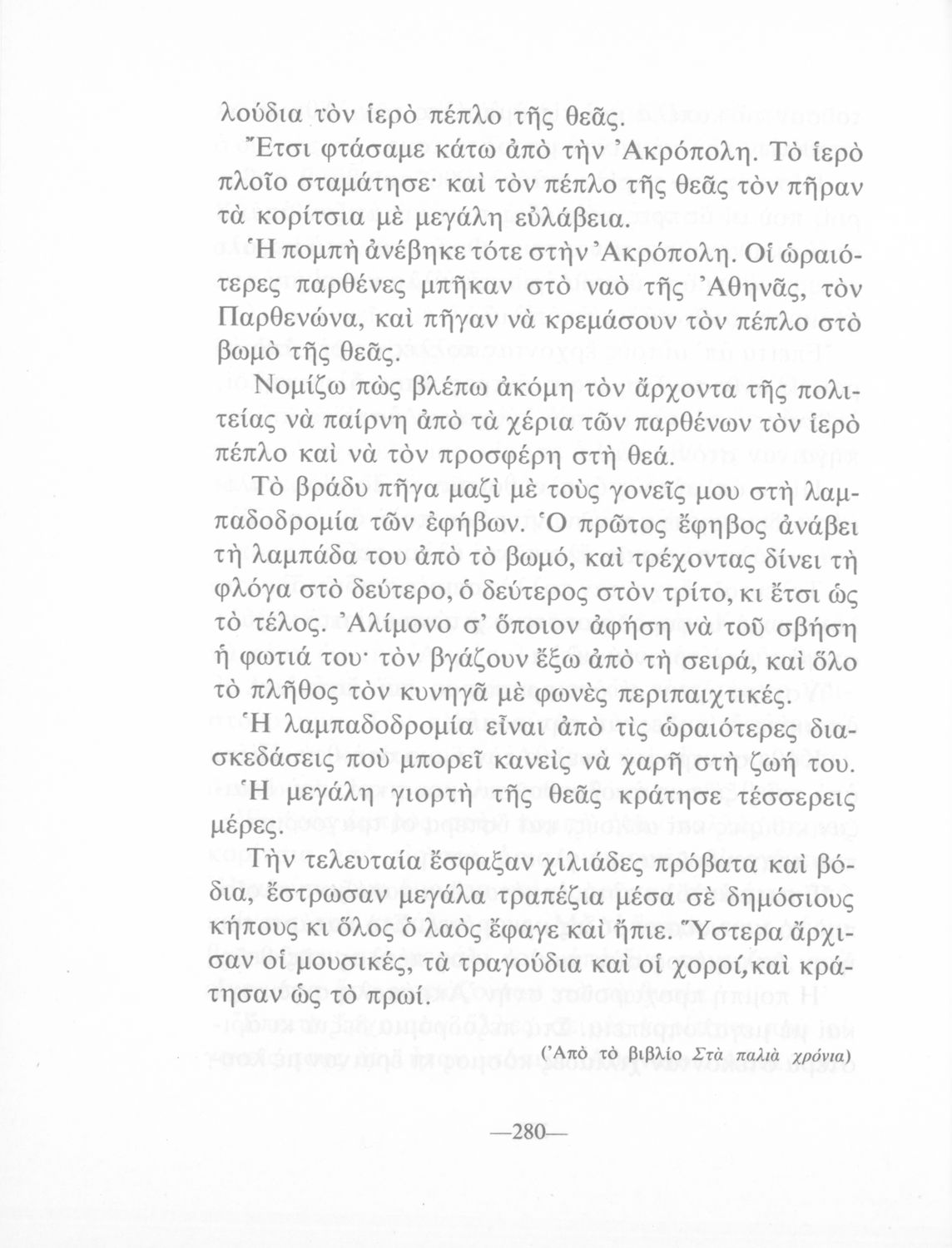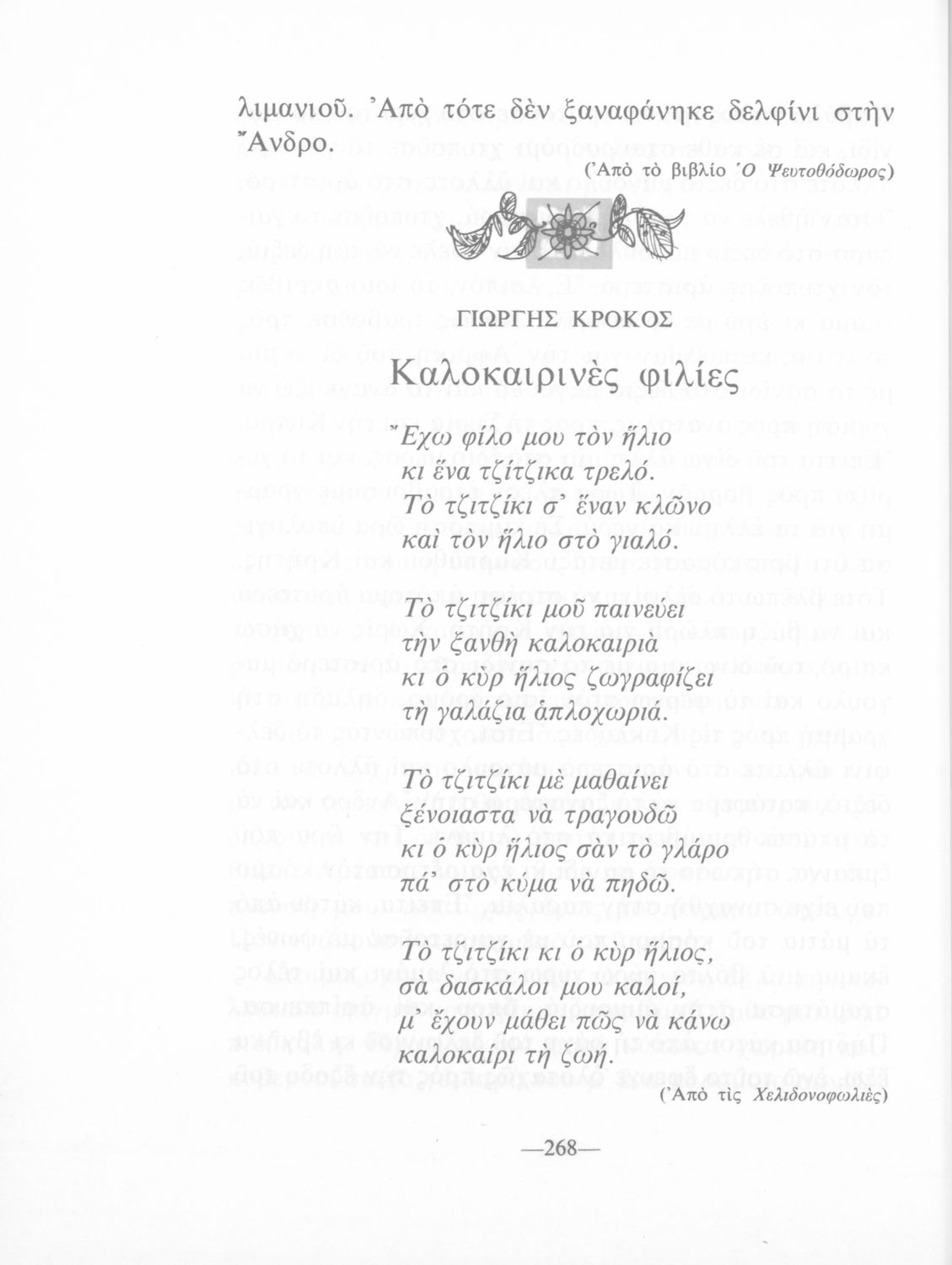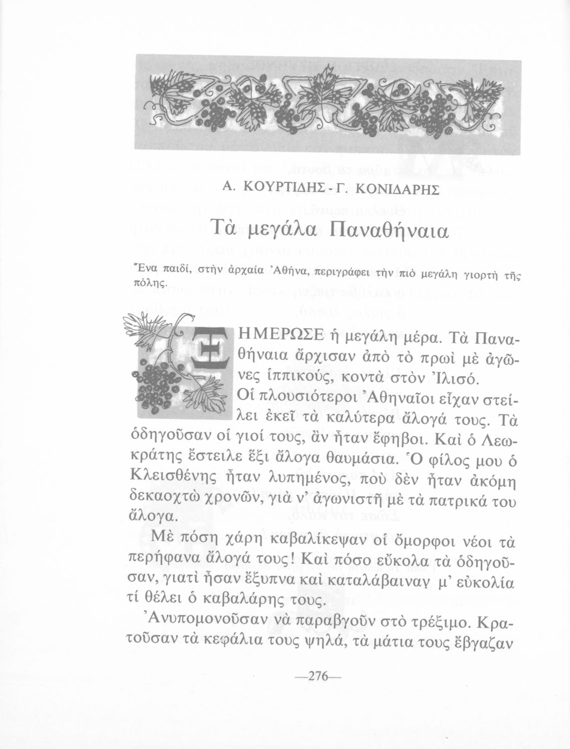 Αναγνωστικό για τους μαθητές της Γ΄ και Δ΄ Δημοτικού που περιλαμβάνει με πεζά και ποιήματα της νέας ελληνικής λογοτεχνίας εμπνευσμένα από την καθημερινότητα των παιδιών και των οικογενειών τους, την ελληνική ιστορία, τις οικογενειακές στιγμές και εορτές, το παιχνίδι, τα επαγγέλματα και τις ασχολίες των ανθρώπων. Το βιβλίο είναι αφιερωμένο στη μνήμη του Γρηγορίου Ξενόπουλου.