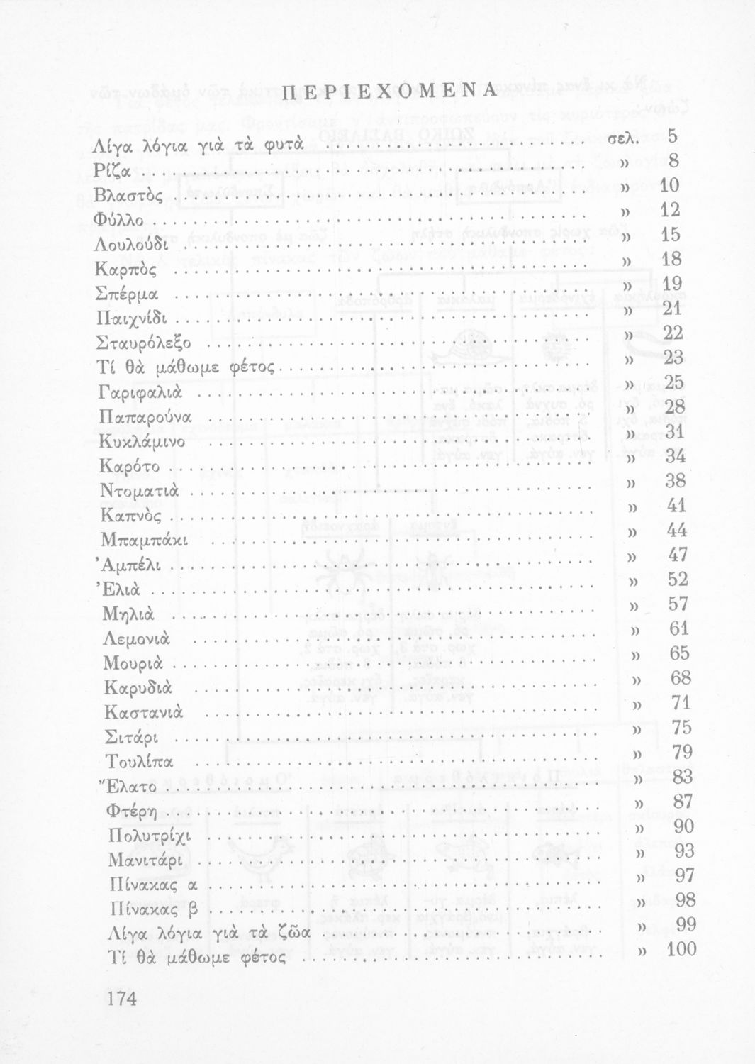 Πρόκειται για βιβλίο Φυτολογίας και Ζωολογίας για την Γ΄ Δημοτικού. Περιέχει στοιχεία για τα μέρη του φυτού, για φυτά και ζώα που υπάρχουν στον κήπο, τον ανθόκηπο και τον λαχανόκηπο.