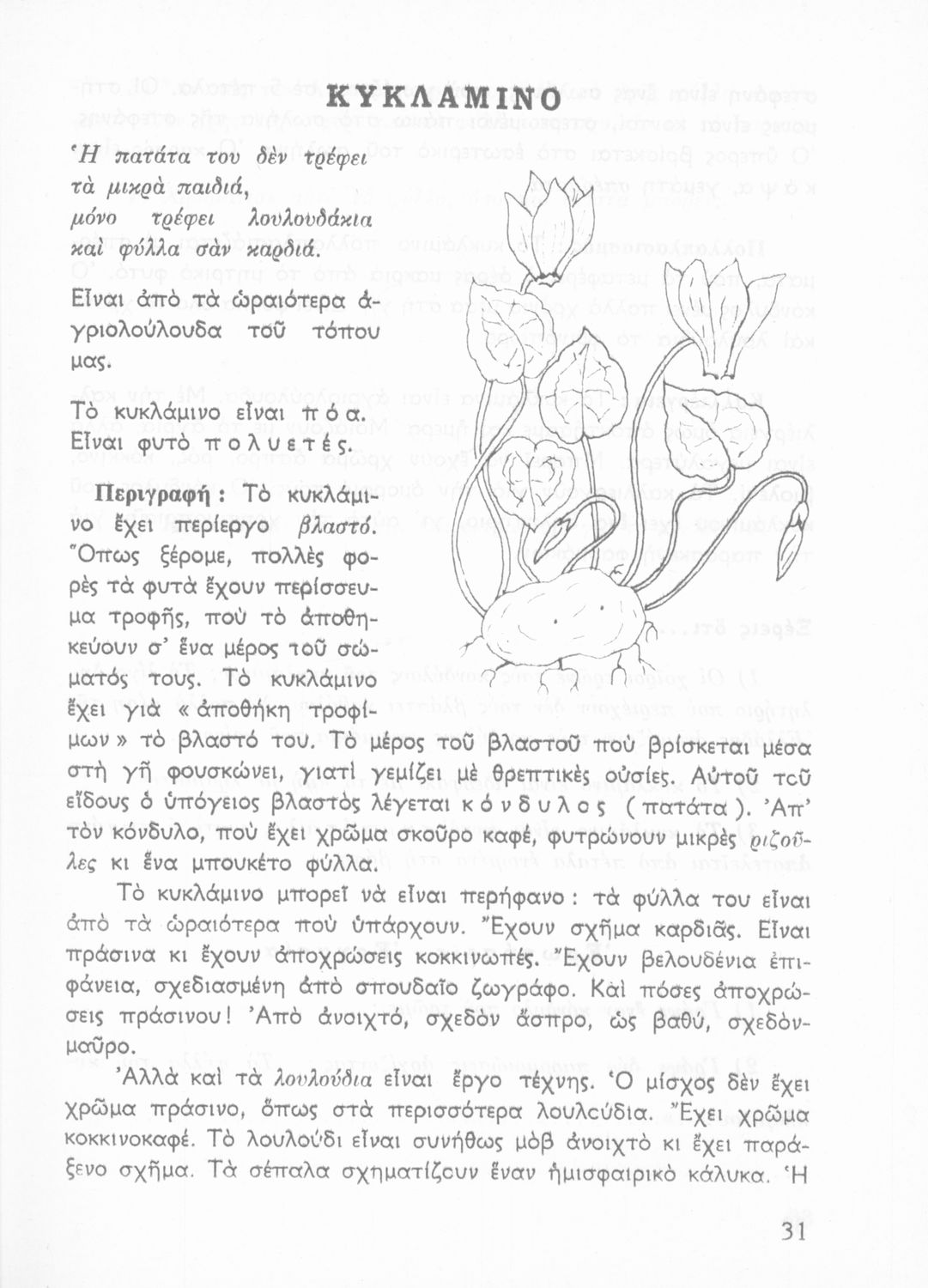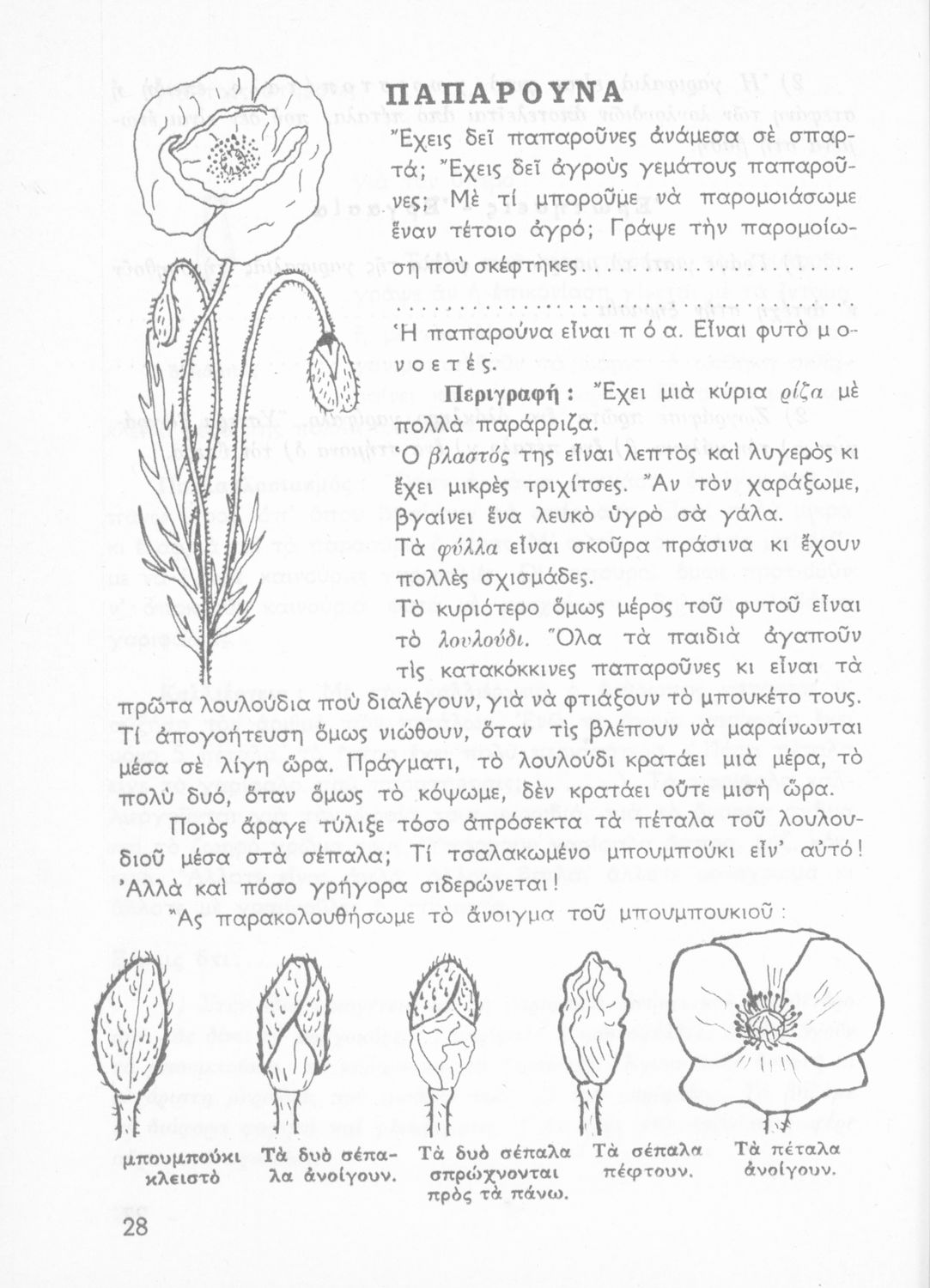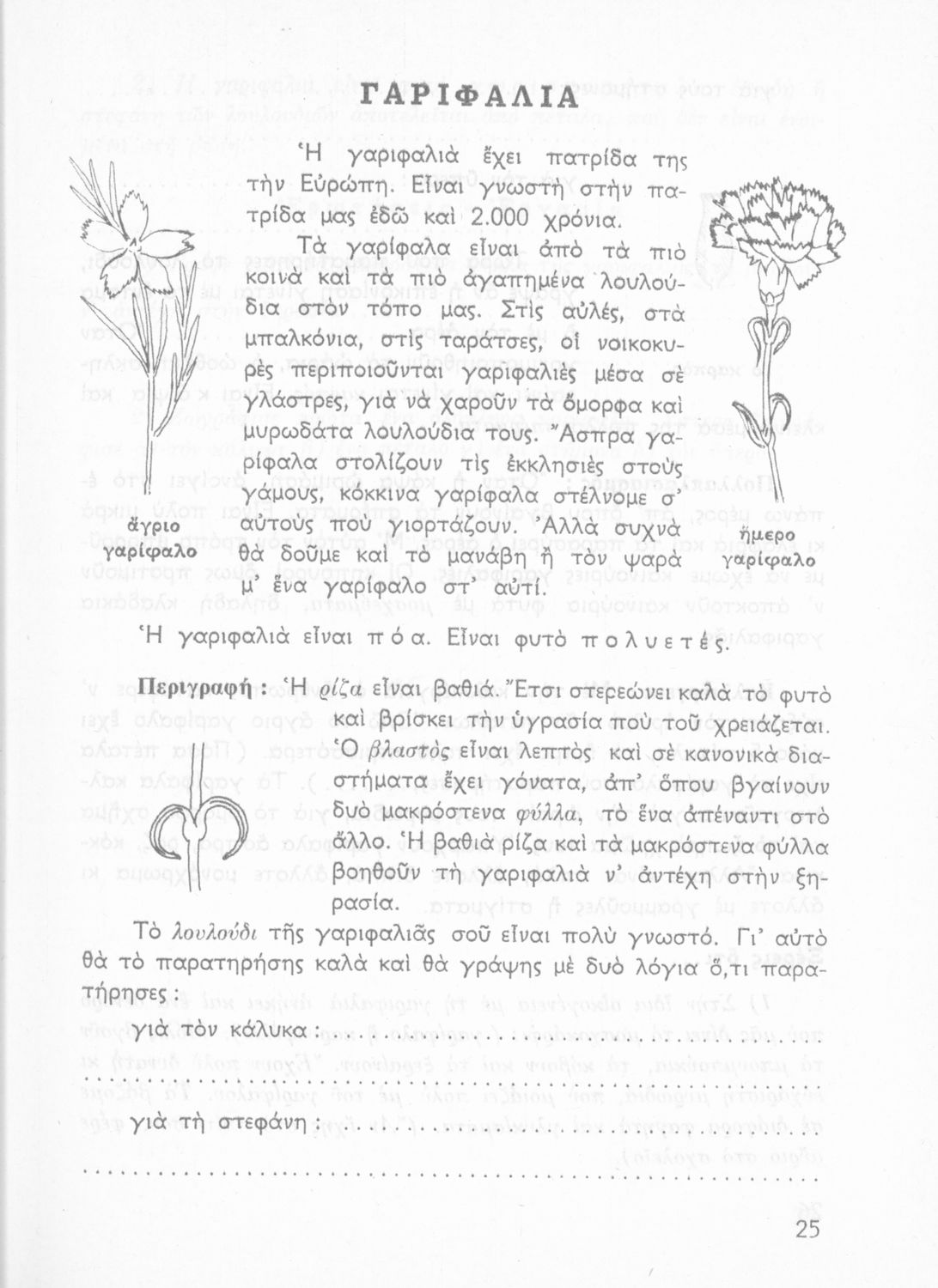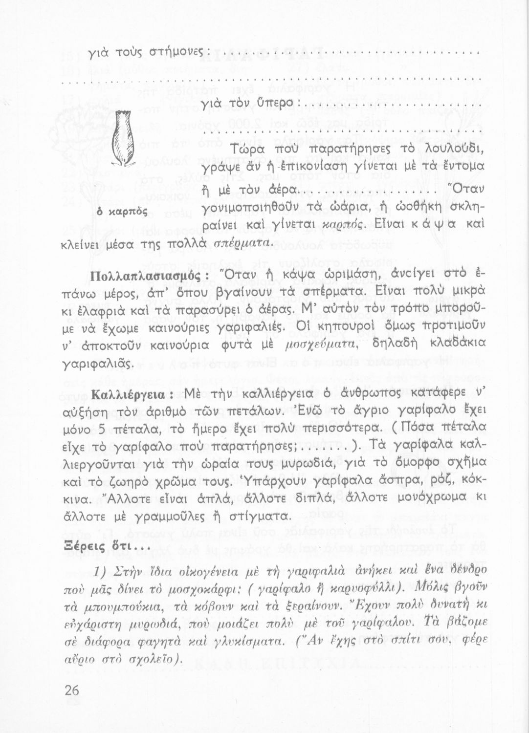 Πρόκειται για βιβλίο Φυτολογίας και Ζωολογίας για την Γ΄ Δημοτικού. Περιέχει στοιχεία για τα μέρη του φυτού, για φυτά και ζώα που υπάρχουν στον κήπο, τον ανθόκηπο και τον λαχανόκηπο.