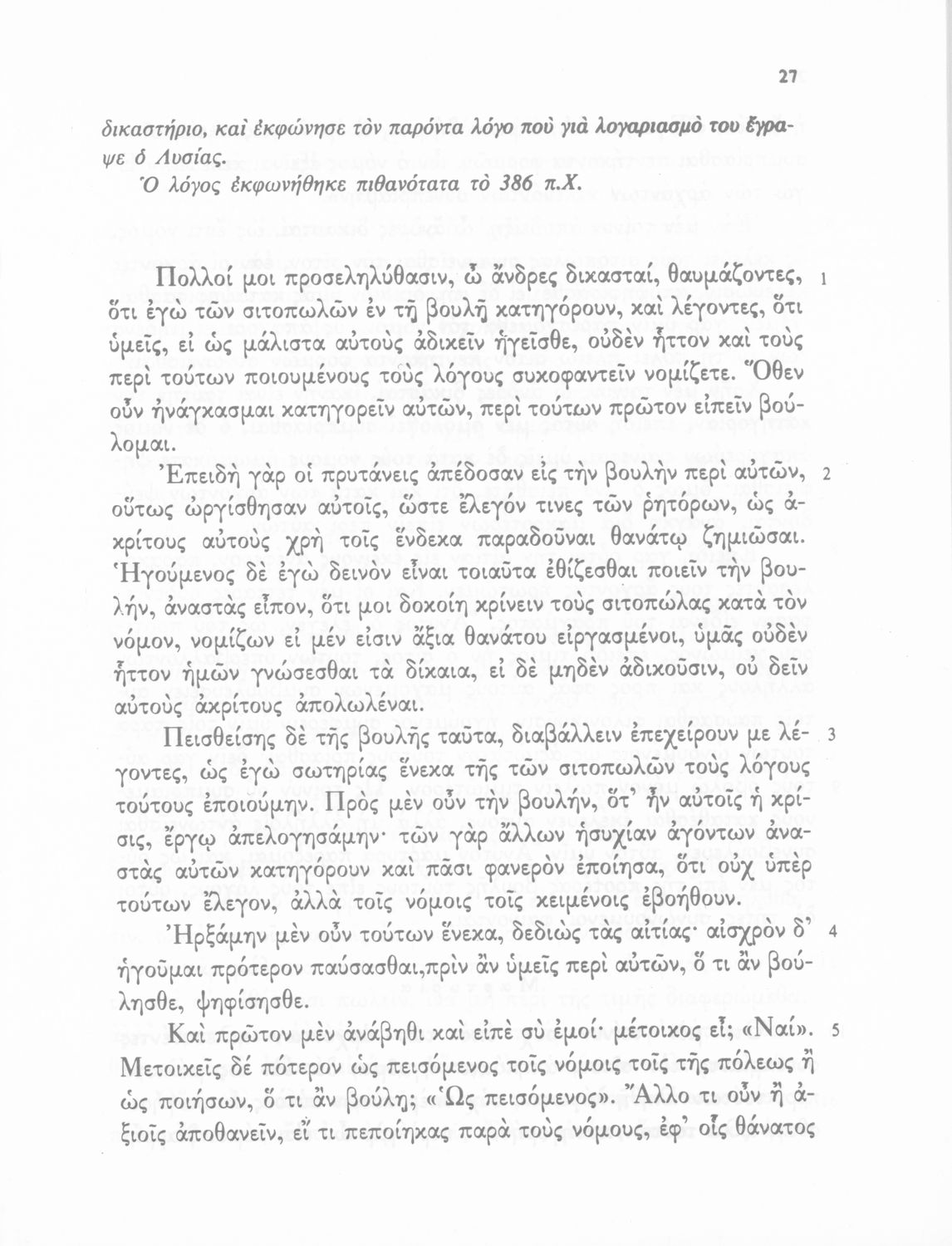 Σχολικό εγχειρίδιο Αρχαίων Ελληνικών Ε΄ Γυμνασίου που περιέχει Λόγους του Λυσία Περί του σηκού απολογία, Υπέρ του αδυνάτου, και Κατά των σιτοπωλών και λεξιλογικές και ερμηνευτικές σημειώσεις.