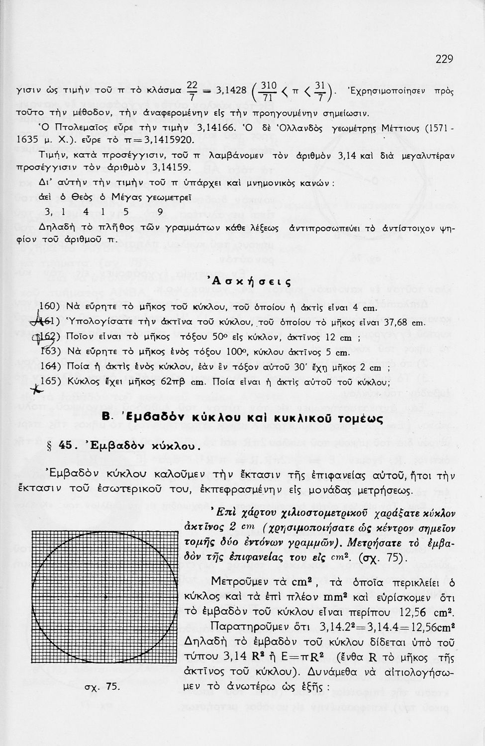 Σχολικό Εγχειρίδιο Μαθηματικών Β' Γυμνασίου που περιλαμβάνει αριθμητική με έμφαση στα σύνολα, τις μεθόδους υπολογισμού τόκων και επιτοκίων, και την μέθοδο των τριών, και γεωμετρία με έμφαση στα γεωμετρικά σχήματα και σώματα και τρόπους υπολογισμού τους. Φέρει το σύμβολο της δικτατορίας.