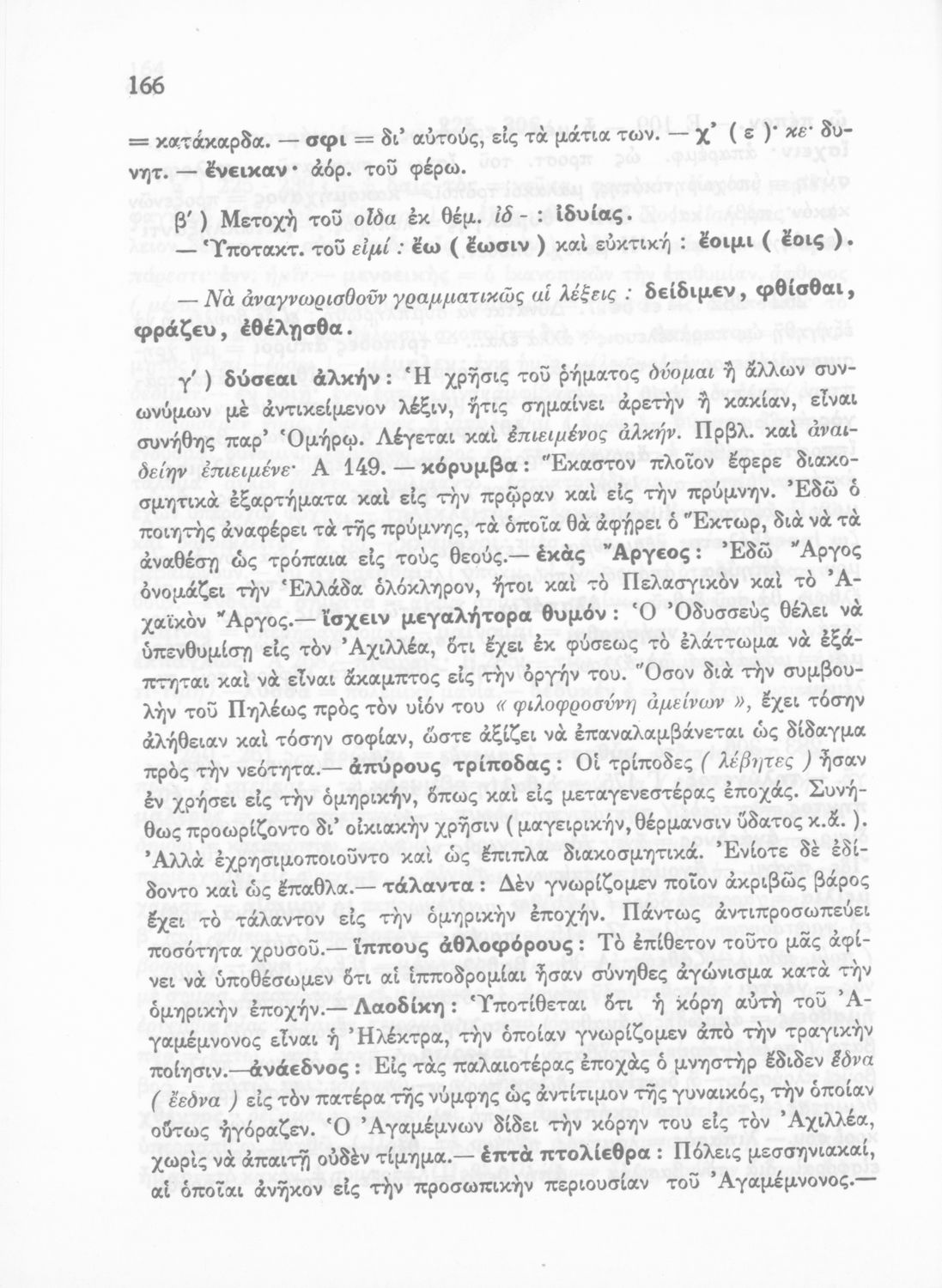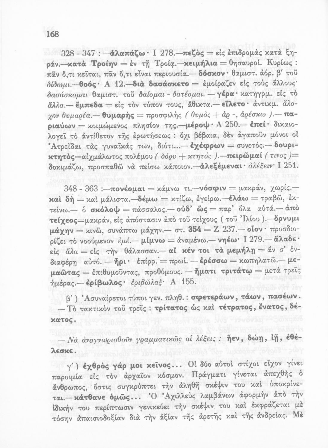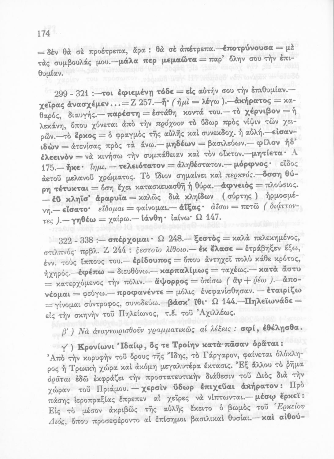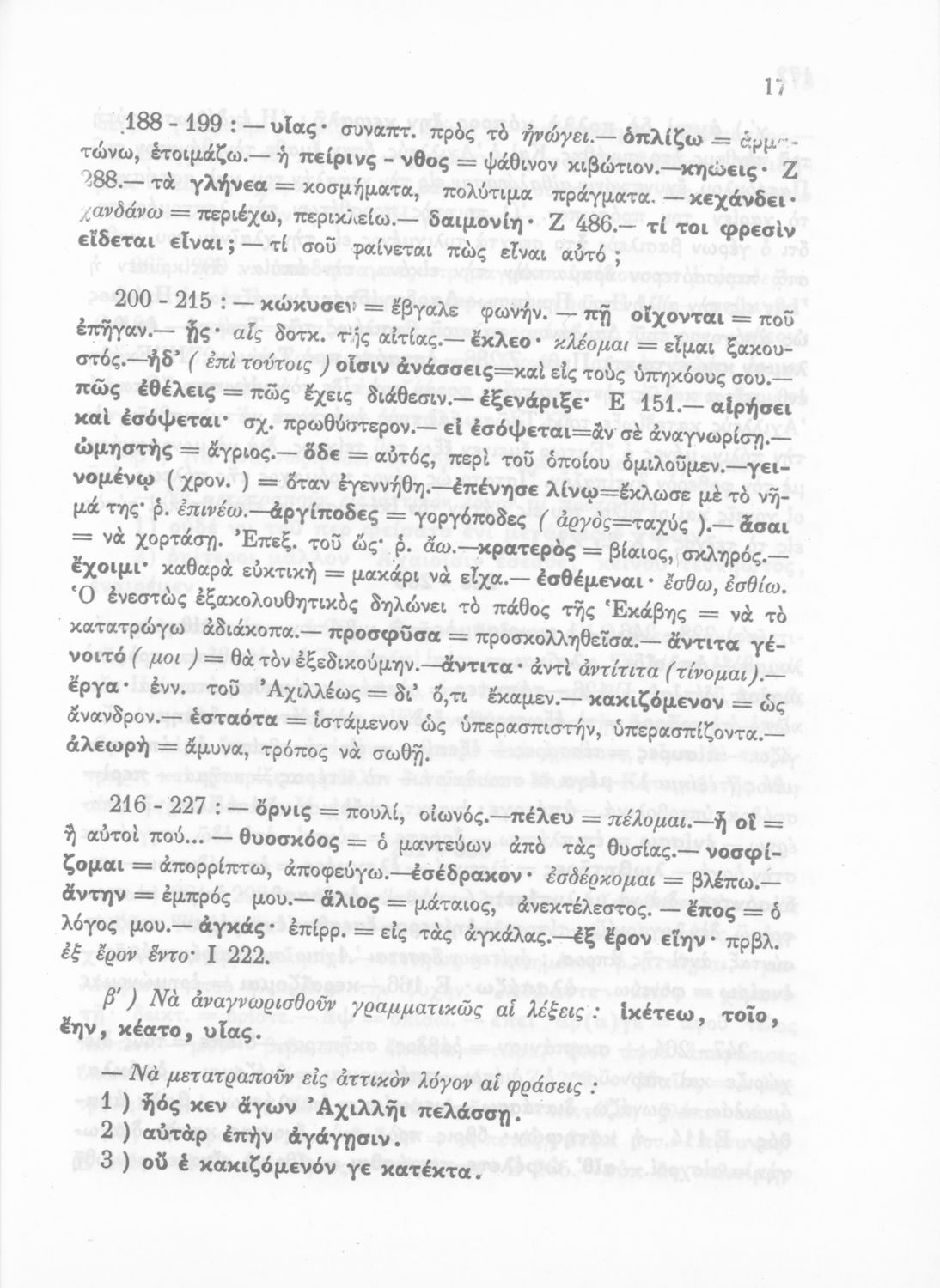 Μαθητικό βοήθημα του Ελληνικού Σχολείου, των Παρθεναγωγείων και του Γυμνασίου για το μάθημα των Αρχαίων Ελληνικών. Περιέχει τις ραψωδίες Ο, Π, Ρ, Σ, Τ, Χ, ψ, Ω από το πρωτότυπο με σχόλια και ερμηνευτικές ...