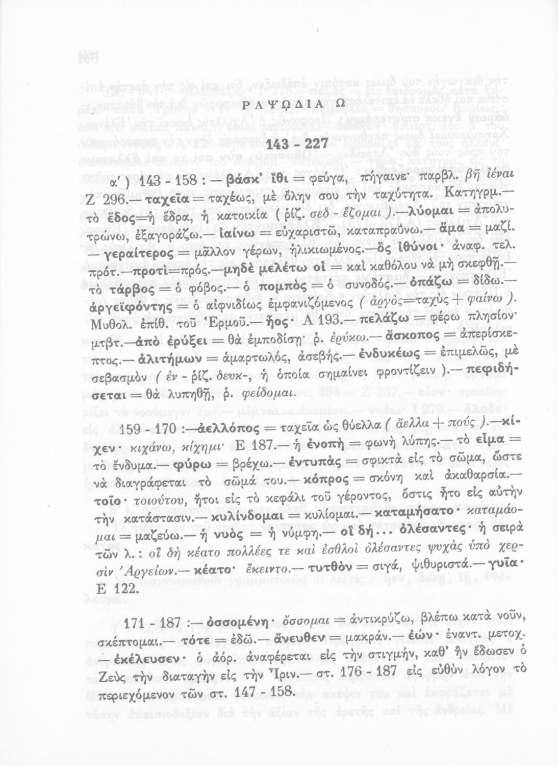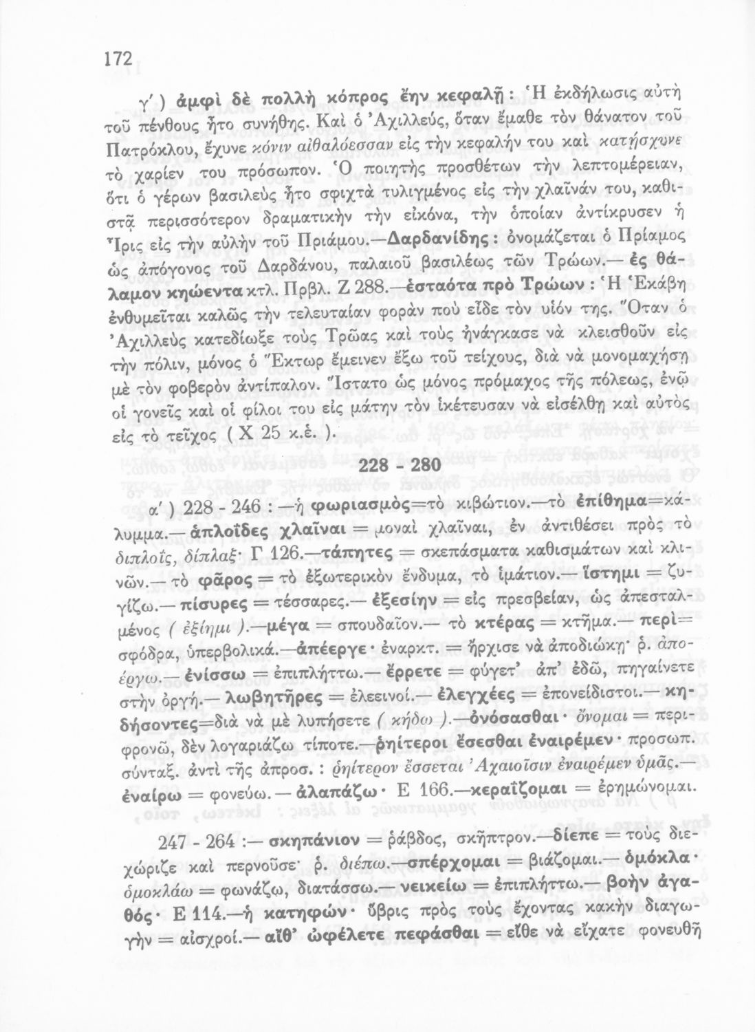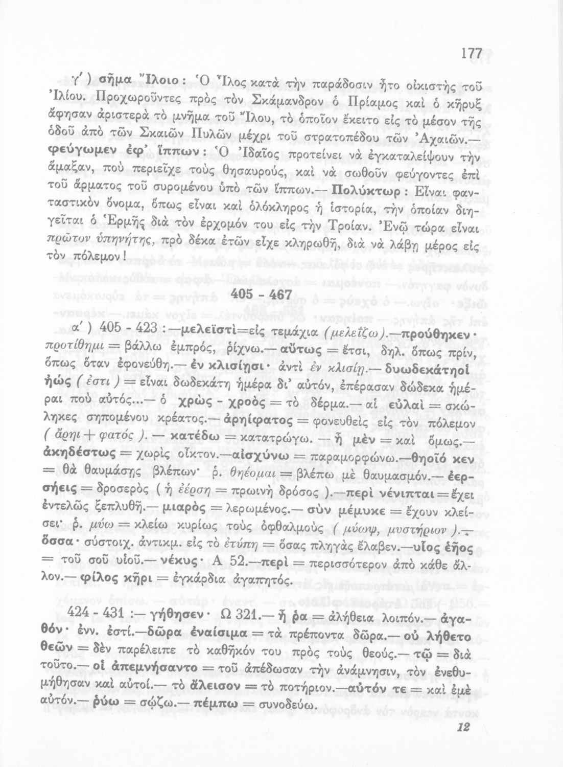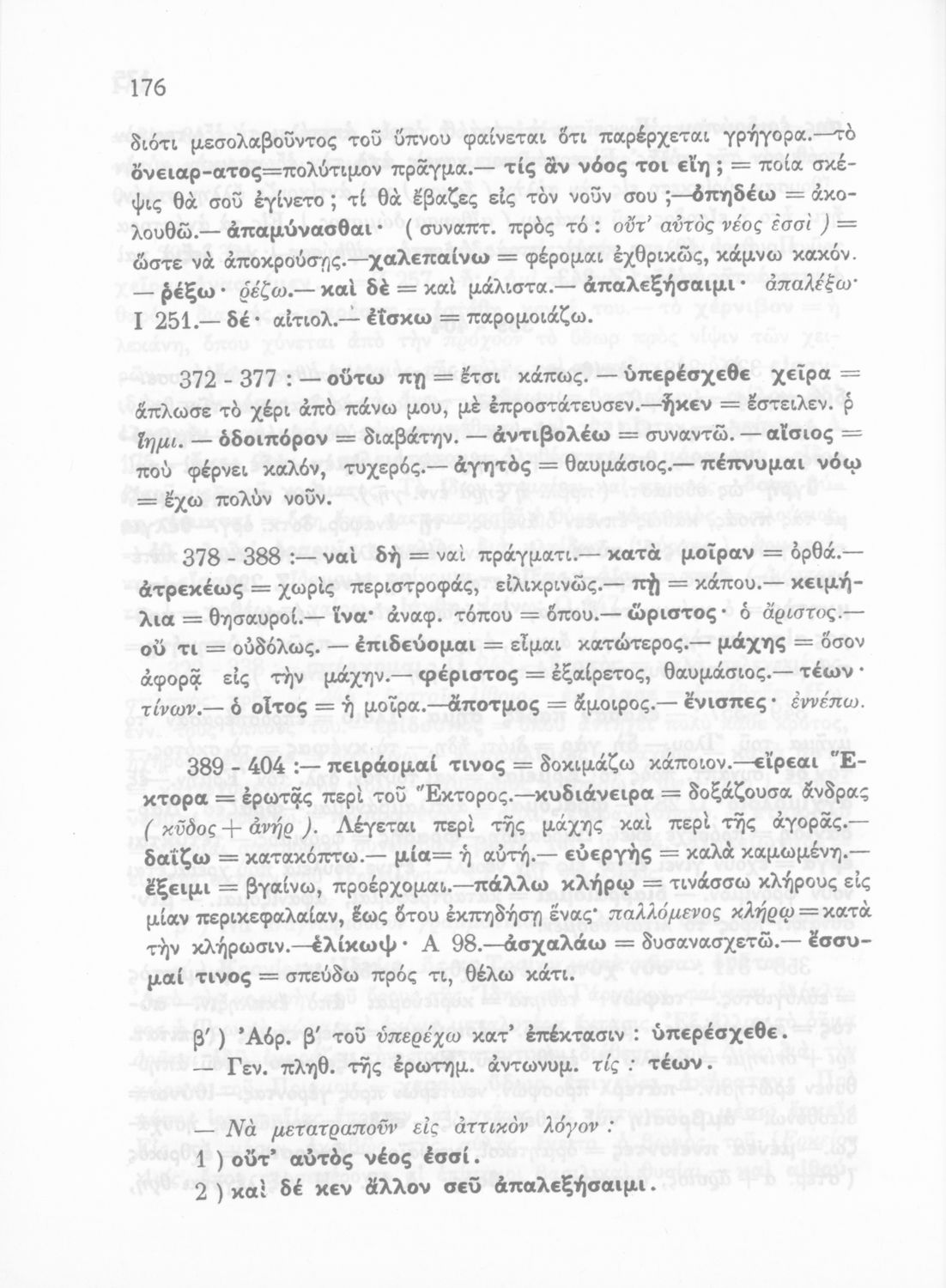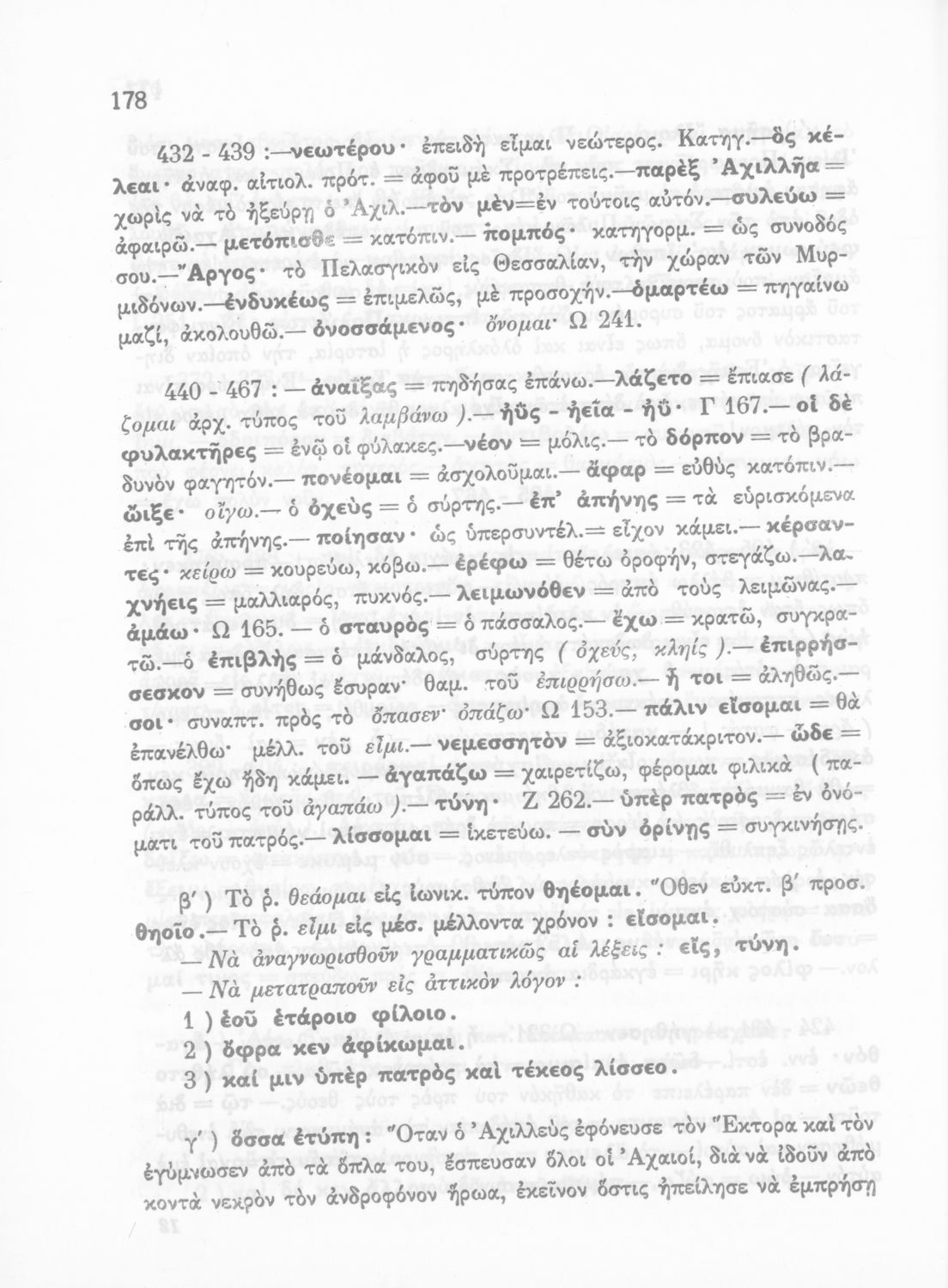 Μαθητικό βοήθημα του Ελληνικού Σχολείου, των Παρθεναγωγείων και του Γυμνασίου για το μάθημα των Αρχαίων Ελληνικών. Περιέχει τις ραψωδίες Ο, Π, Ρ, Σ, Τ, Χ, ψ, Ω από το πρωτότυπο με σχόλια και ερμηνευτικές ...