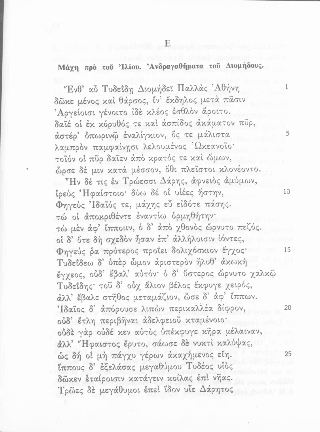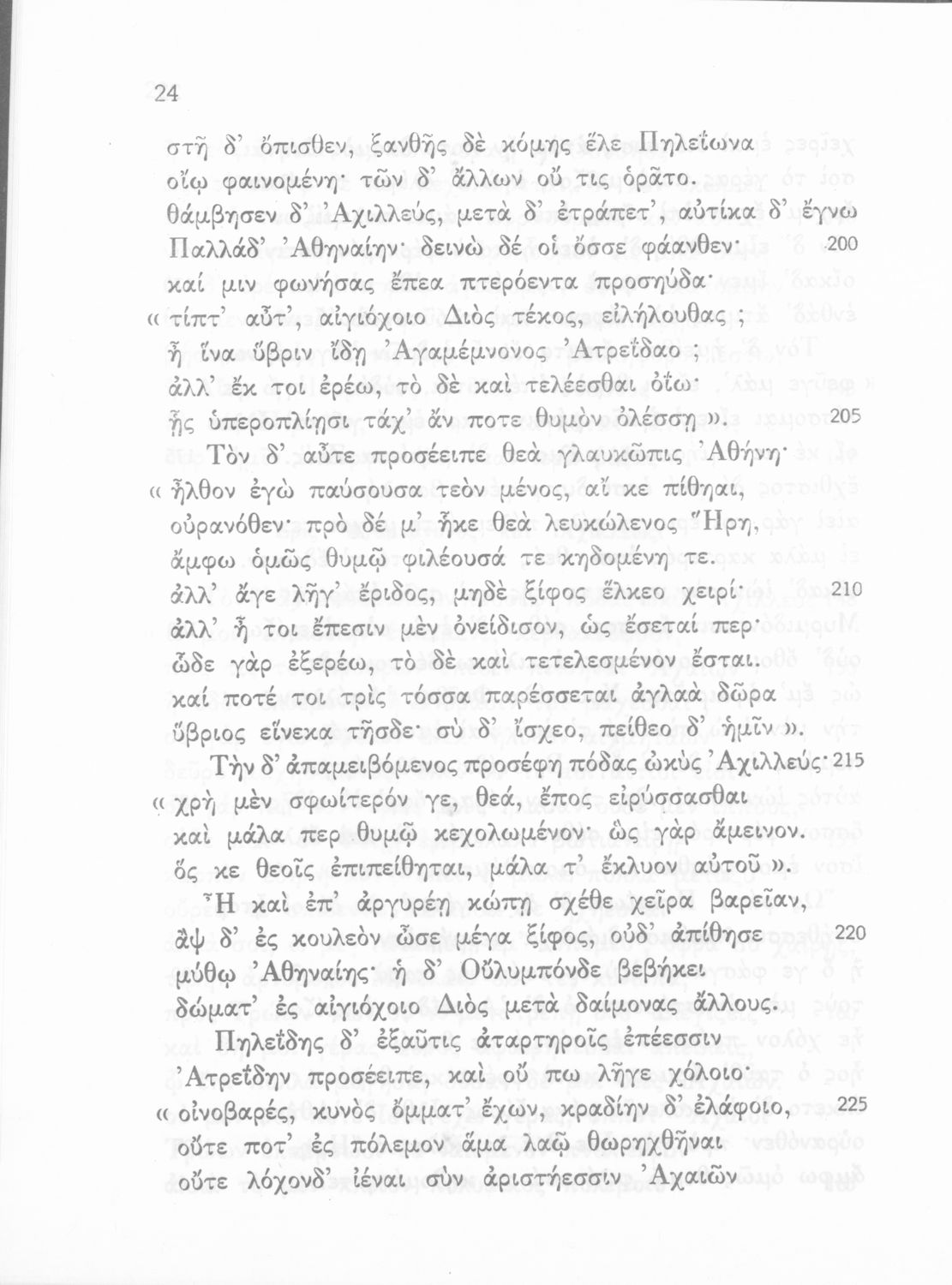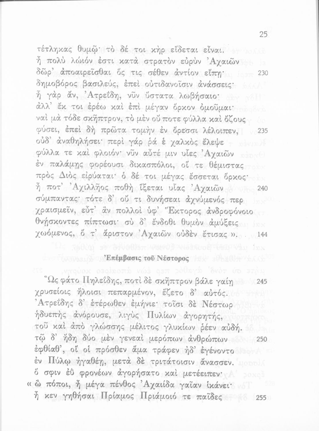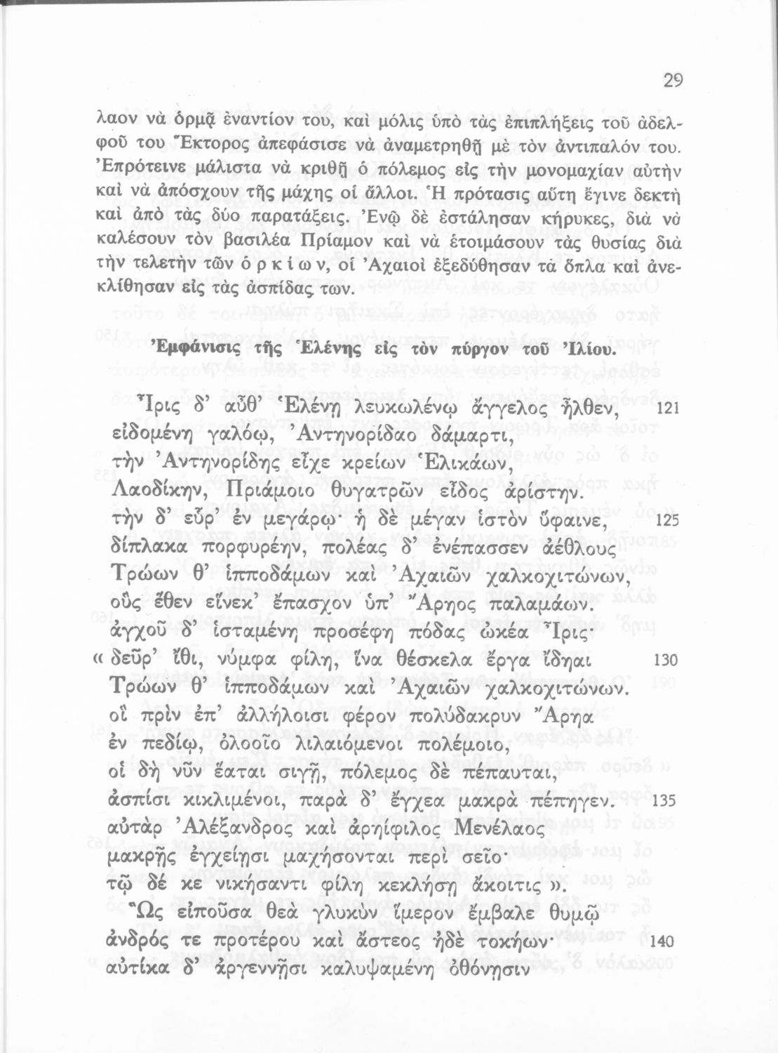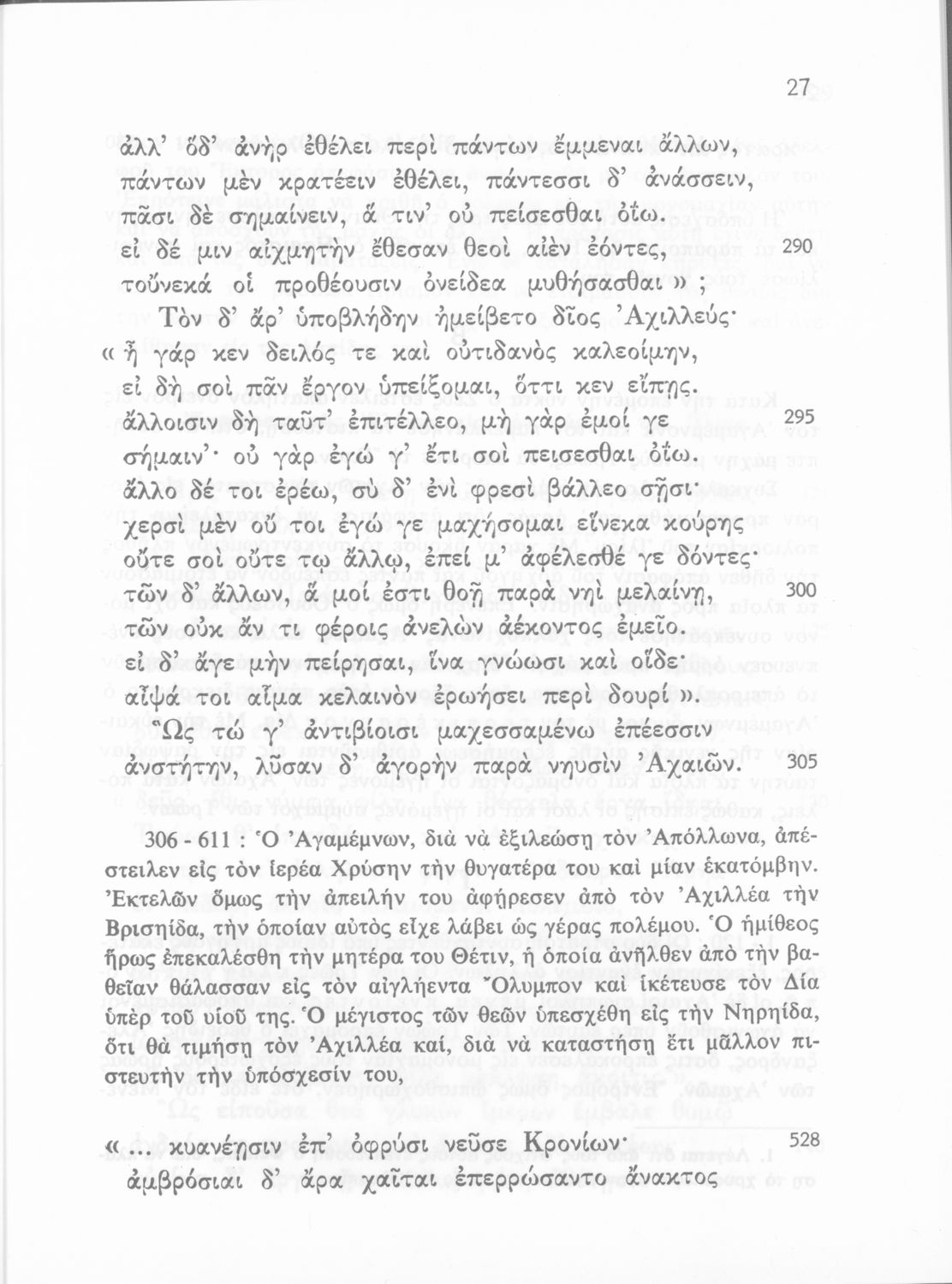 Σχολικό εγχειρίδιο Αρχαίων Ελληνικών. Το βιβλίο περιλαμβάνει εισαγωγικό σημείωμα σχετικά με το περιεχόμενο της Ιλιάδας του Ομήρου και την εποχή στην οποία αναφέρεται ο μύθος. Σε πρωτότυπο κείμενο περιλαμβάνονται αποσπάσματα από τις Ραψωδίες της Ιλιάδας Α, Γ, Ε, Ζ, Ι, Ω. Περιλαμβάνονται ερμηνευτικές σημειώσεις (σημασιολογικές, γραμματικές, πραγματολογικές) και παράρτημα εικόνων και χαρτών.