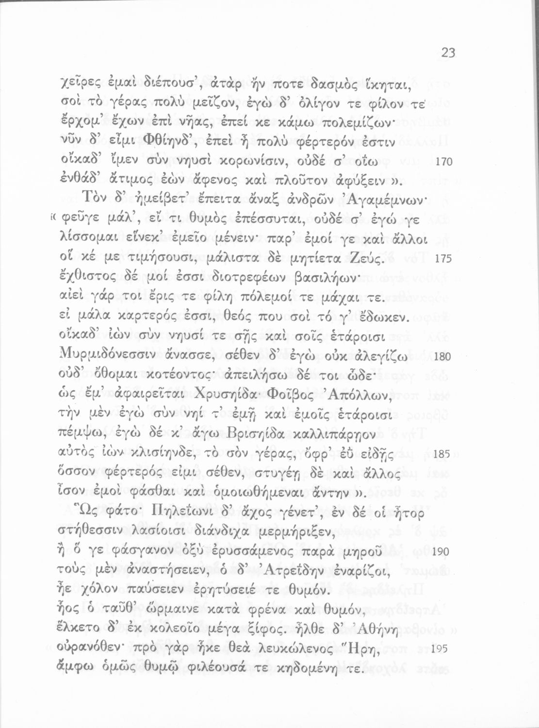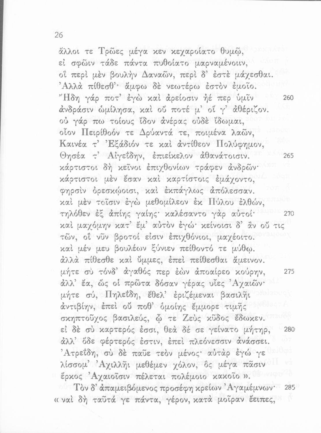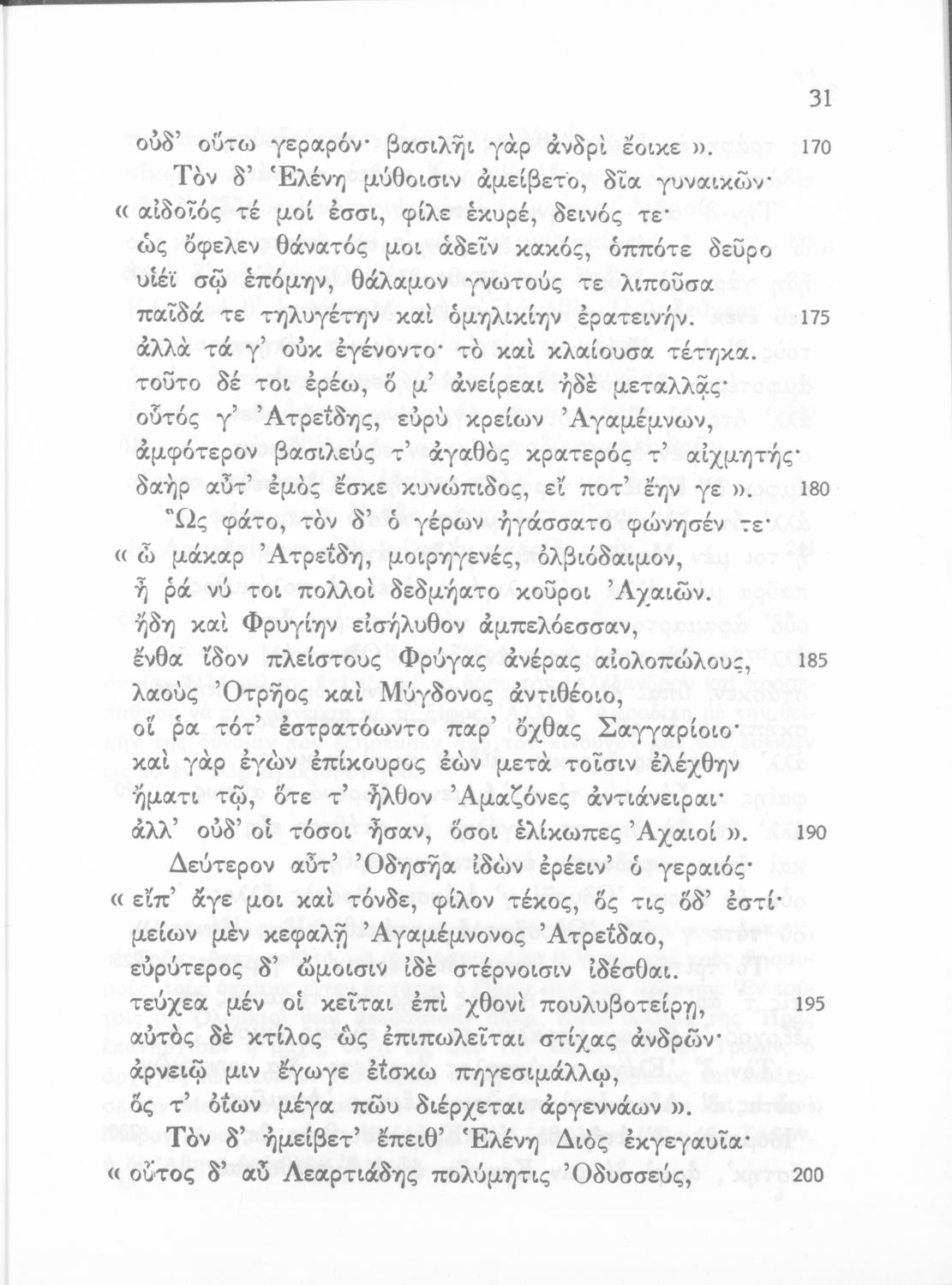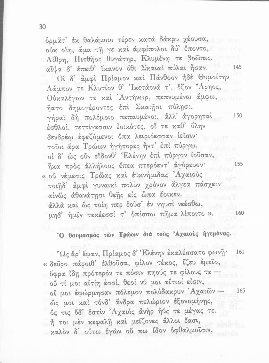 Σχολικό εγχειρίδιο Αρχαίων Ελληνικών. Το βιβλίο περιλαμβάνει εισαγωγικό σημείωμα σχετικά με το περιεχόμενο της Ιλιάδας του Ομήρου και την εποχή στην οποία αναφέρεται ο μύθος. Σε πρωτότυπο κείμενο περιλαμβάνονται αποσπάσματα από τις Ραψωδίες της Ιλιάδας Α, Γ, Ε, Ζ, Ι, Ω. Περιλαμβάνονται ερμηνευτικές σημειώσεις (σημασιολογικές, γραμματικές, πραγματολογικές) και παράρτημα εικόνων και χαρτών.