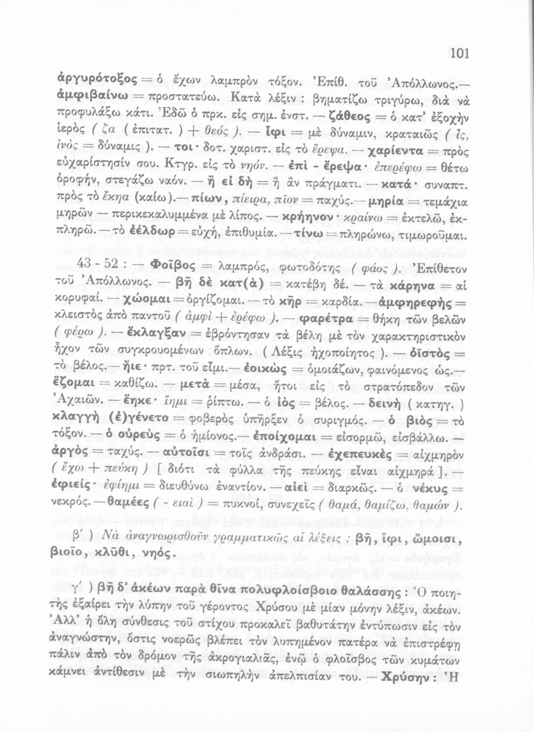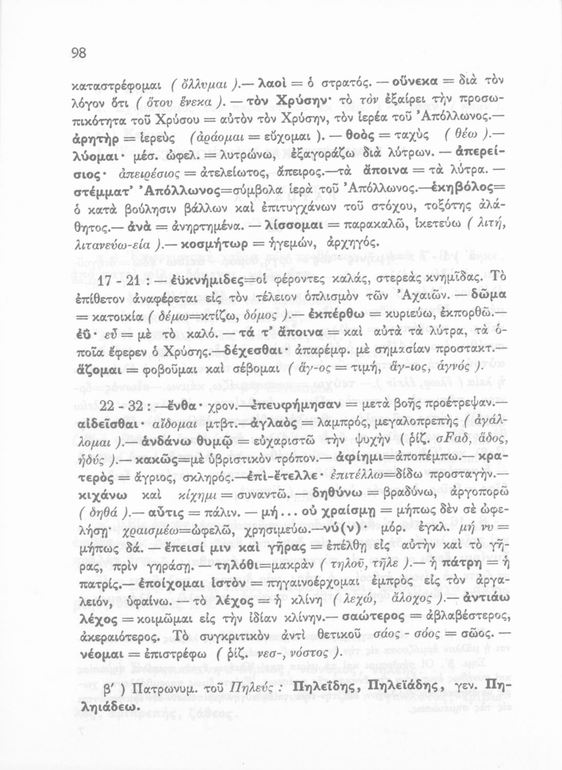 Μαθητικό βοήθημα του Ελληνικού Σχολείου, των Παρθεναγωγείων και του Γυμνασίου για το μάθημα των Αρχαίων Ελληνικών. Περιέχει τις ραψωδίες Ο, Π, Ρ, Σ, Τ, Χ, ψ, Ω από το πρωτότυπο με σχόλια και ερμηνευτικές ...