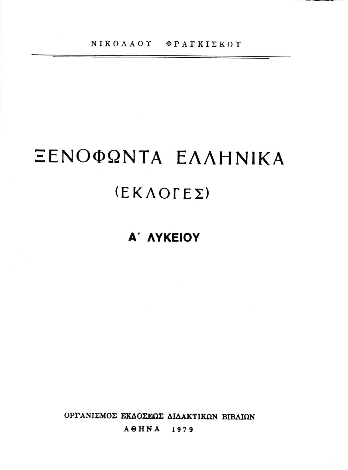 Σχολικό εγχειρίδιο Αρχαίων ελληνικών Α΄ Λυκείου που περιλαμβάνει αποσπάσματα από τα Ελληνικά του Ξενοφώντα, εισαγωγή στη ζωή και το έργο του, ερμηνευτικές σημειώσεις, τοπογραφικούς πίνακες και σχεδιαγράμματα ...