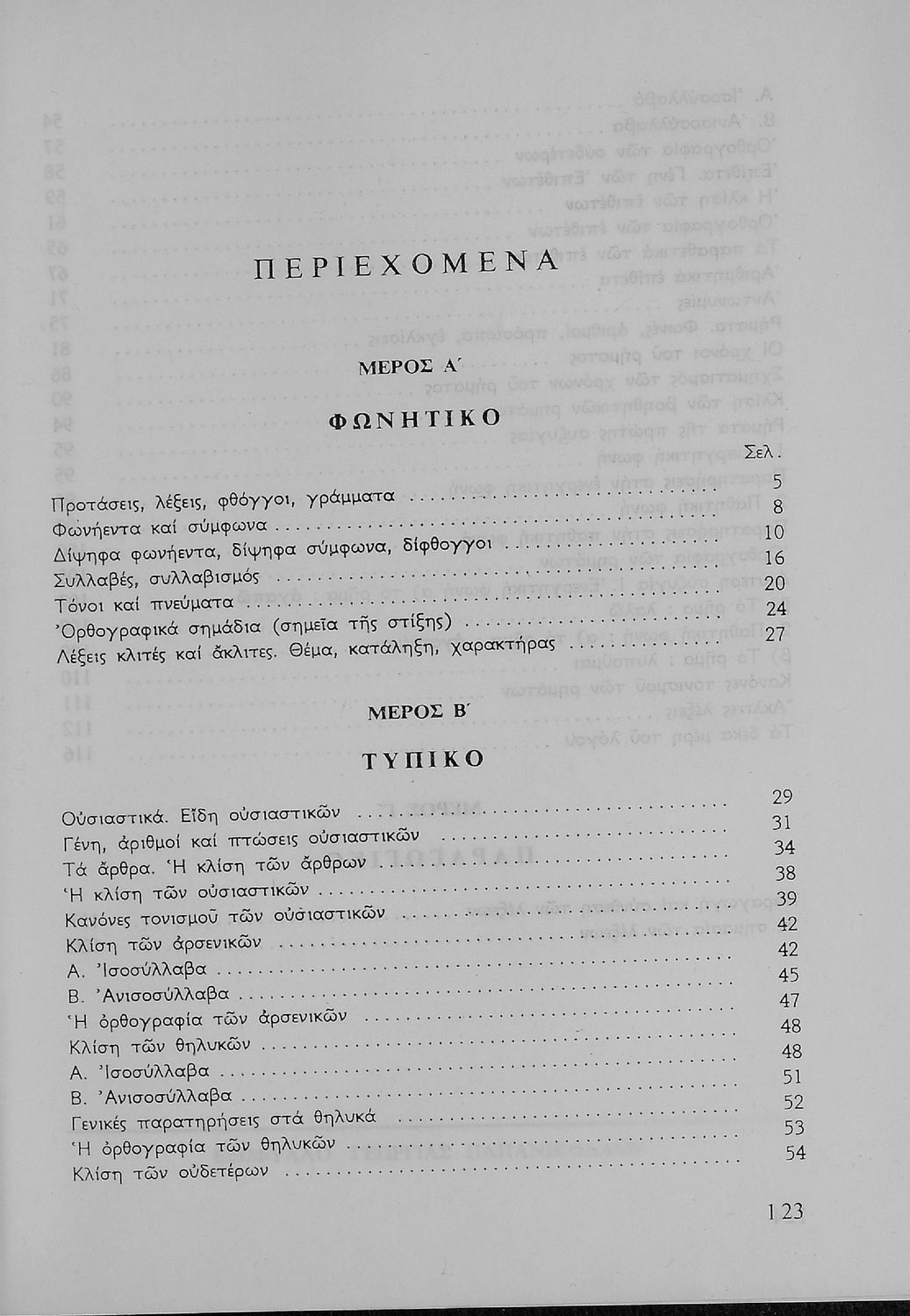 Σχολικό εγχειρίδιο Γ΄ και Δ΄ Δημοτικού που περιλαμβάνει τους κανόνες γραμματικής και τη δομή της νέας ελληνικής και είναι χωρισμένο στο φωνητικό, τυπικό και παραγωγικό μέρος.