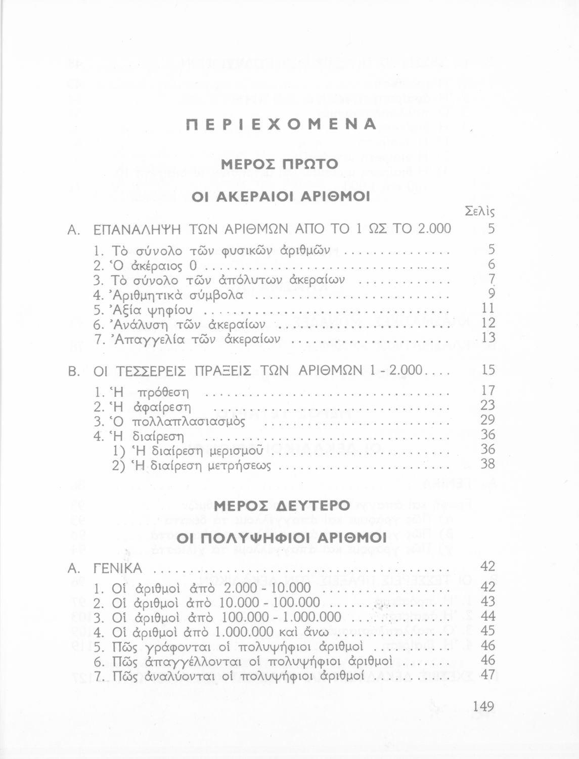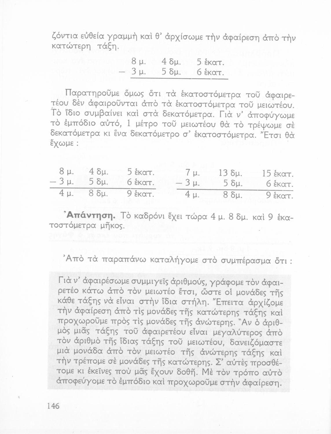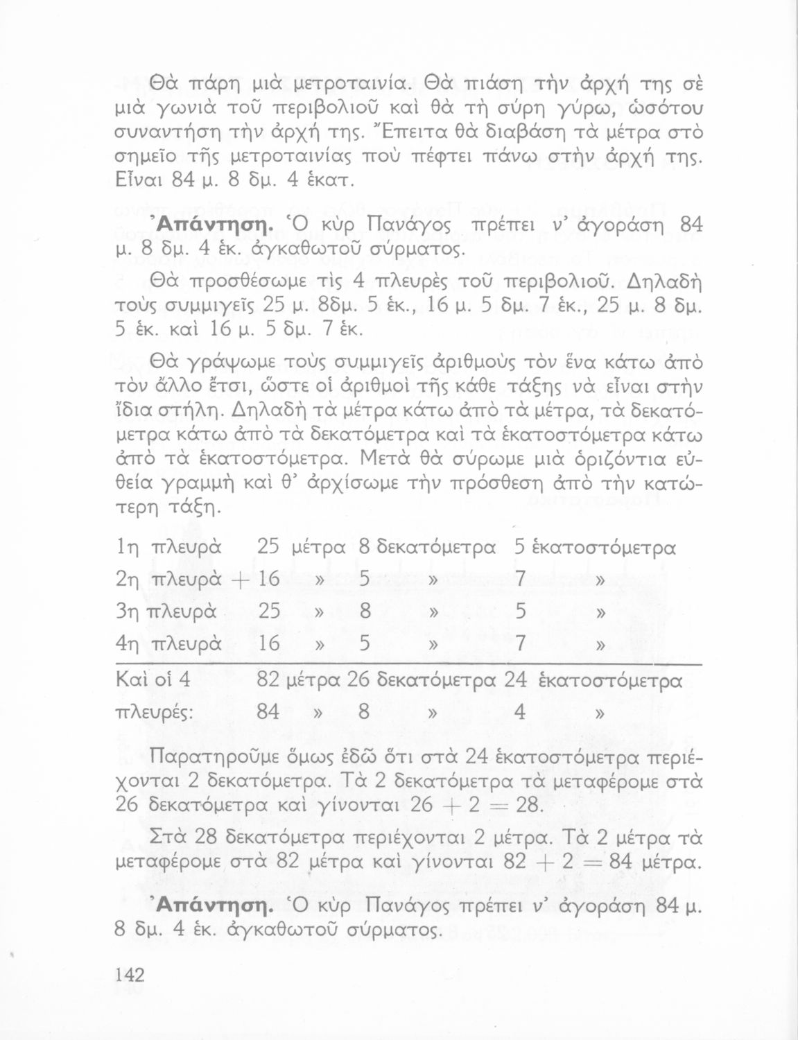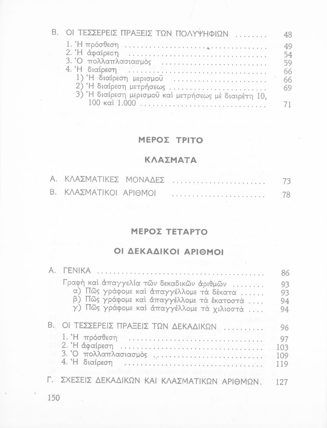 Σχολικό εγχειρίδιο Αριθμητικής Δ΄ Δημοτικού χωρισμένο σε πρακτικά προβλήματα και τις λύσεις τους που εστιάζει στις πράξεις με ακέραιους και συμμιγείς αριθμούς και περιλαμβάνει στοιχεία Γεωμετρίας.