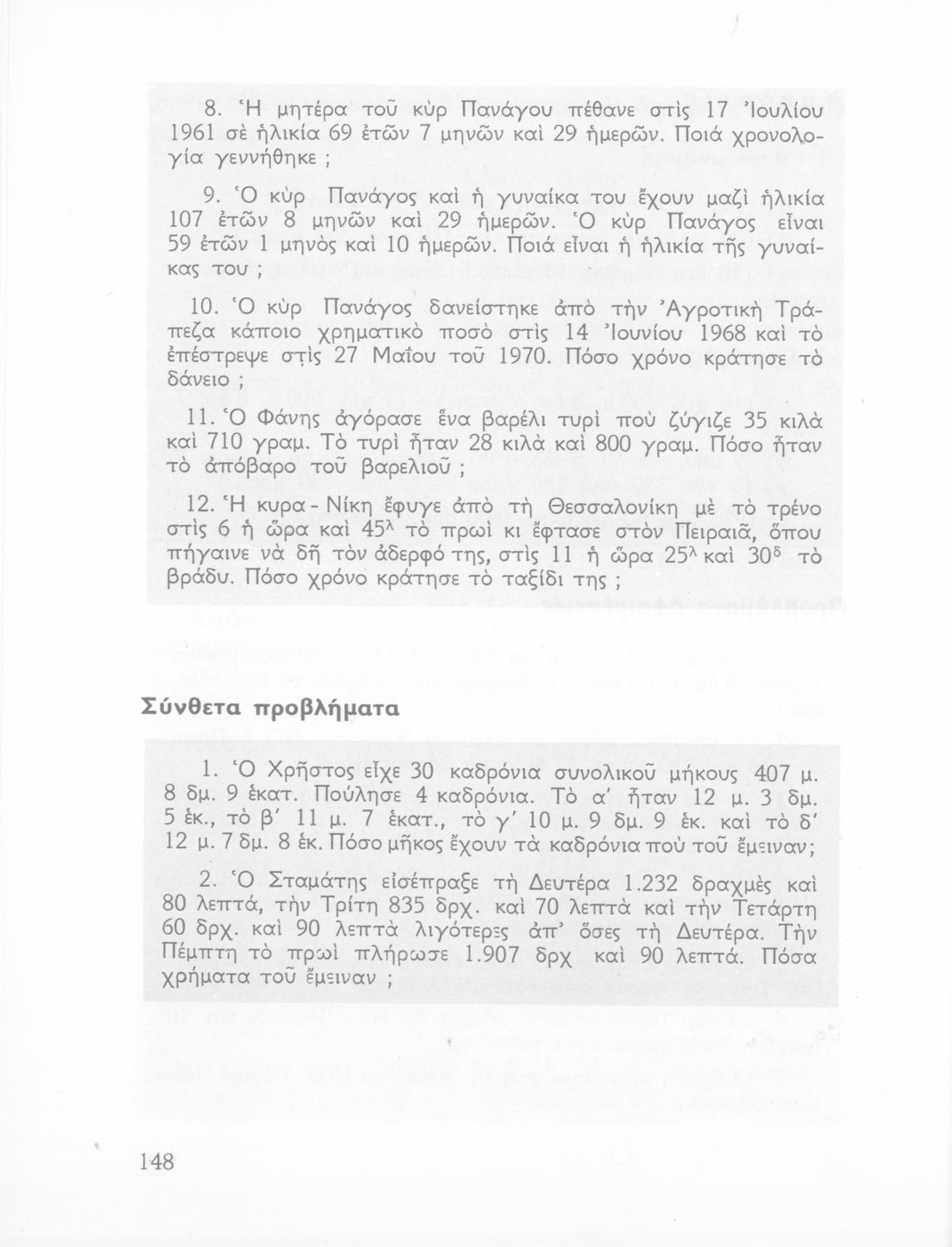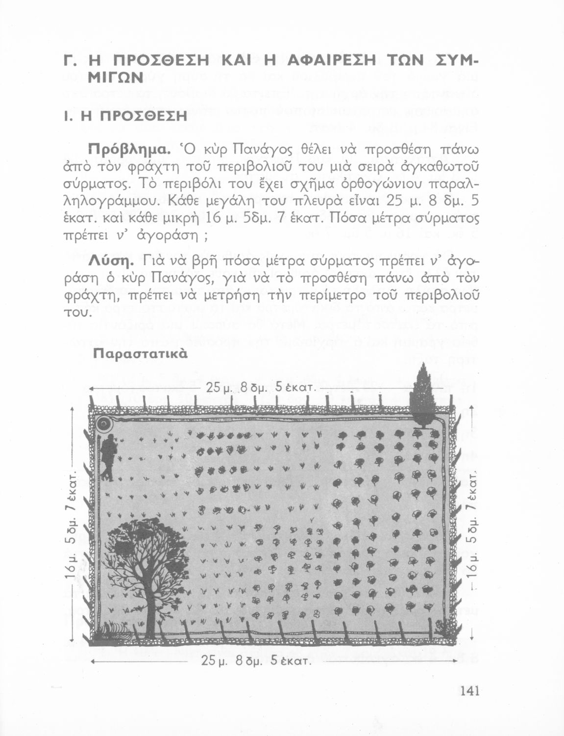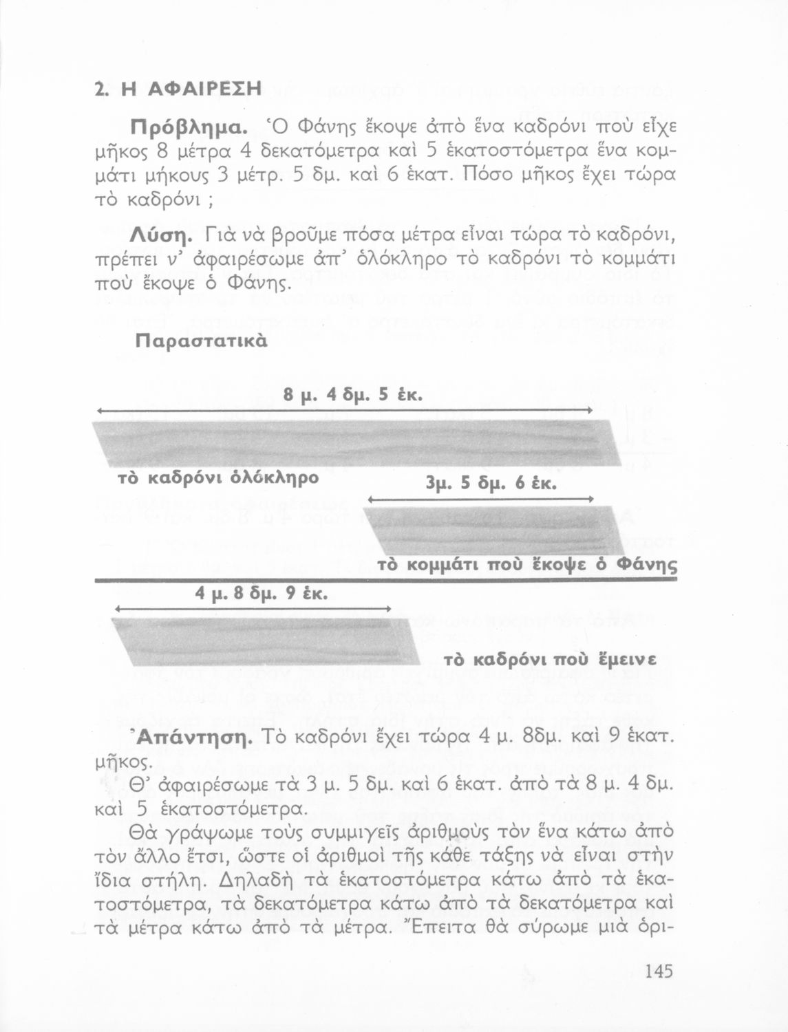 Σχολικό εγχειρίδιο Αριθμητικής Δ΄ Δημοτικού χωρισμένο σε πρακτικά προβλήματα και τις λύσεις τους που εστιάζει στις πράξεις με ακέραιους και συμμιγείς αριθμούς και περιλαμβάνει στοιχεία Γεωμετρίας.