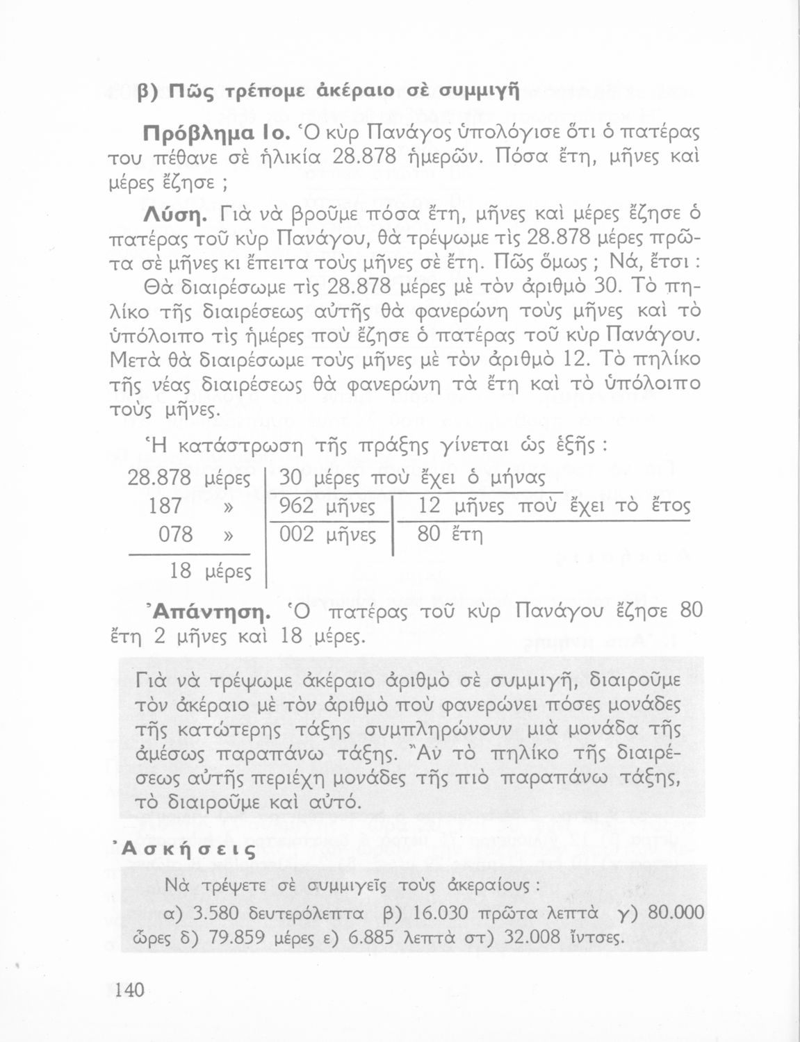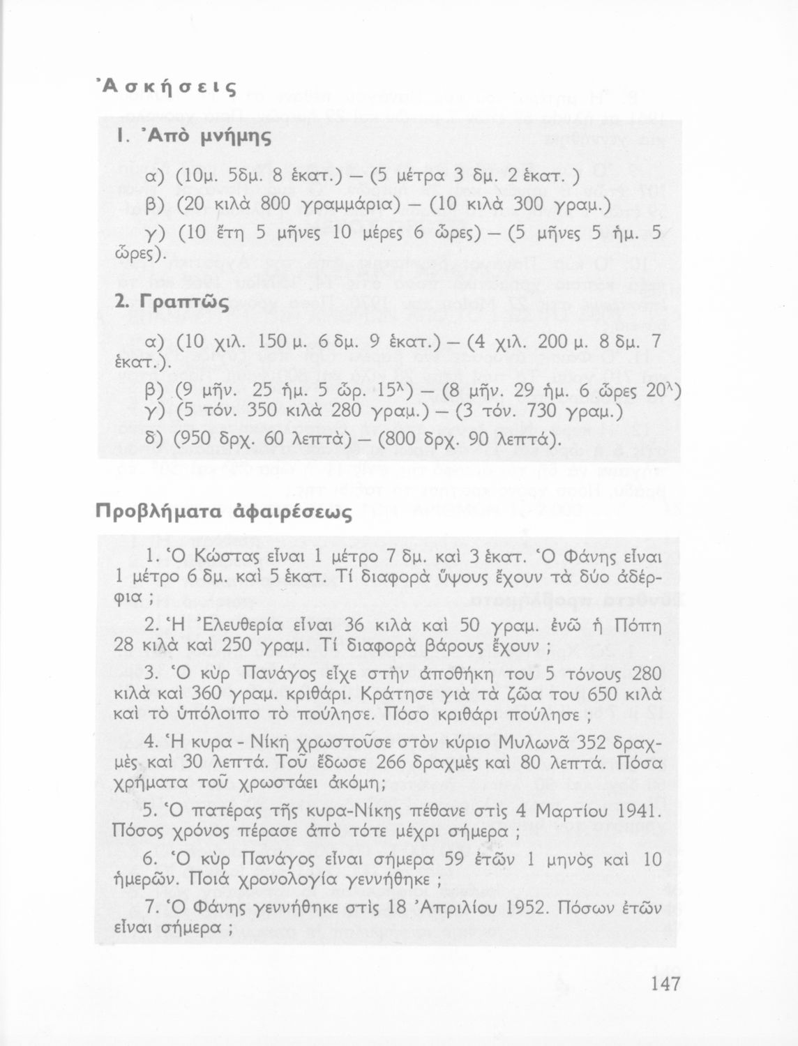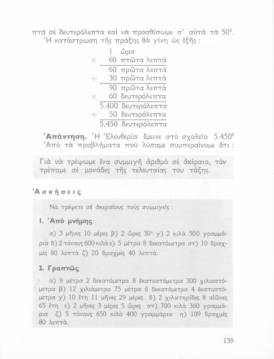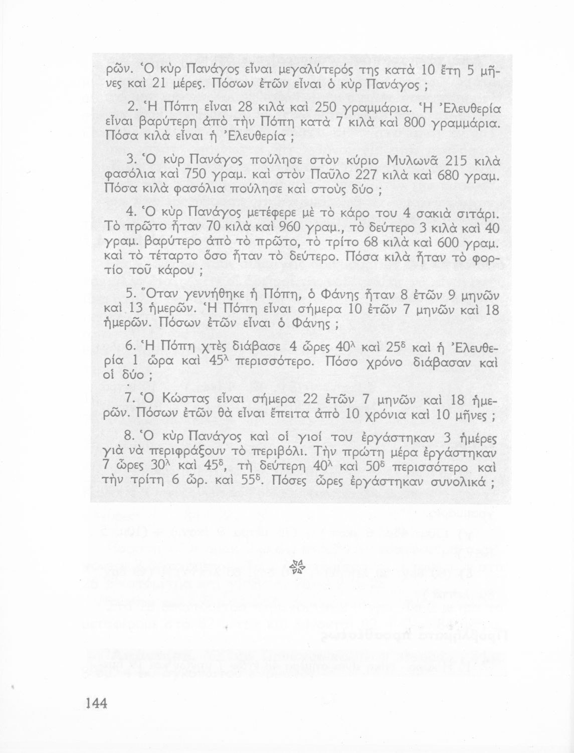 Σχολικό εγχειρίδιο Αριθμητικής Δ΄ Δημοτικού χωρισμένο σε πρακτικά προβλήματα και τις λύσεις τους που εστιάζει στις πράξεις με ακέραιους και συμμιγείς αριθμούς και περιλαμβάνει στοιχεία Γεωμετρίας.