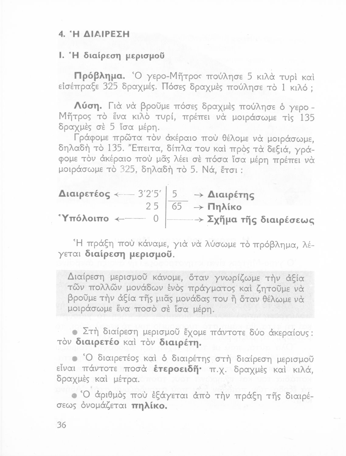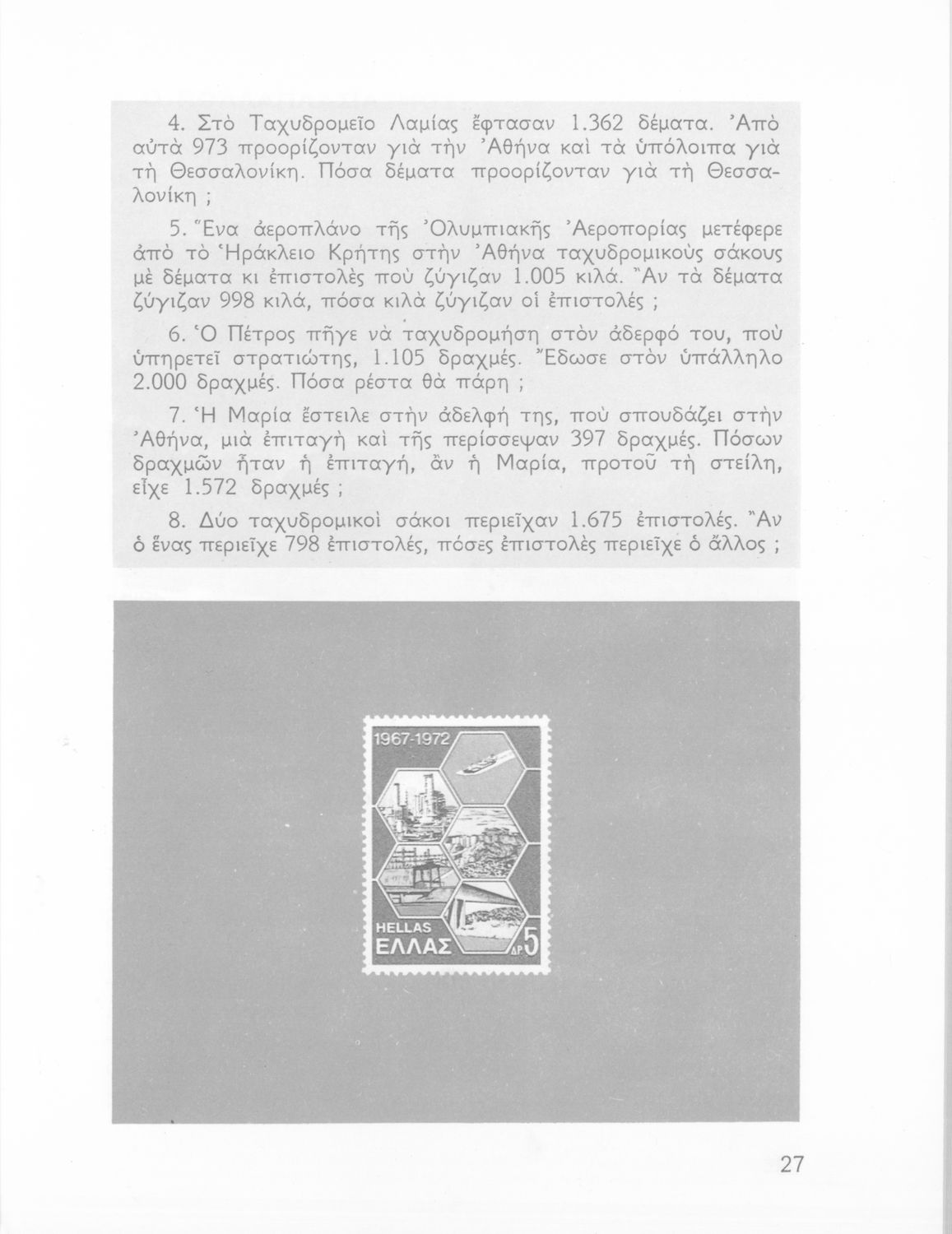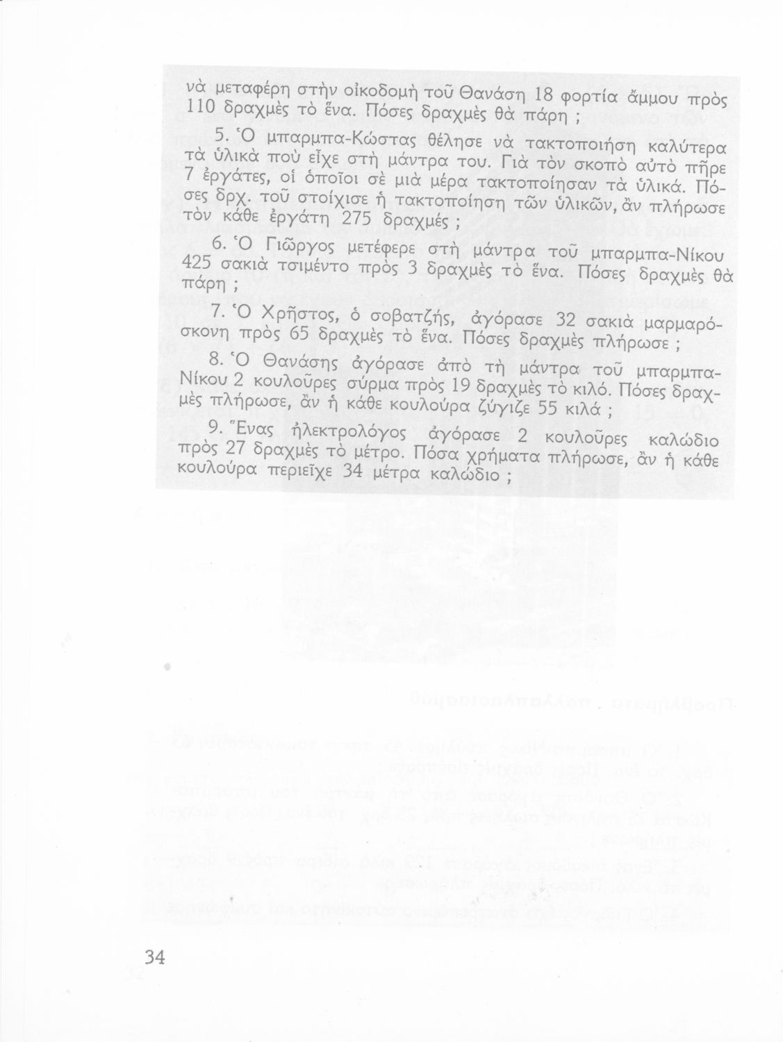 Σχολικό εγχειρίδιο Αριθμητικής Δ΄ Δημοτικού χωρισμένο σε πρακτικά προβλήματα και τις λύσεις τους που περιλαμβάνει και κάποια στοιχεία Γεωμετρίας.
