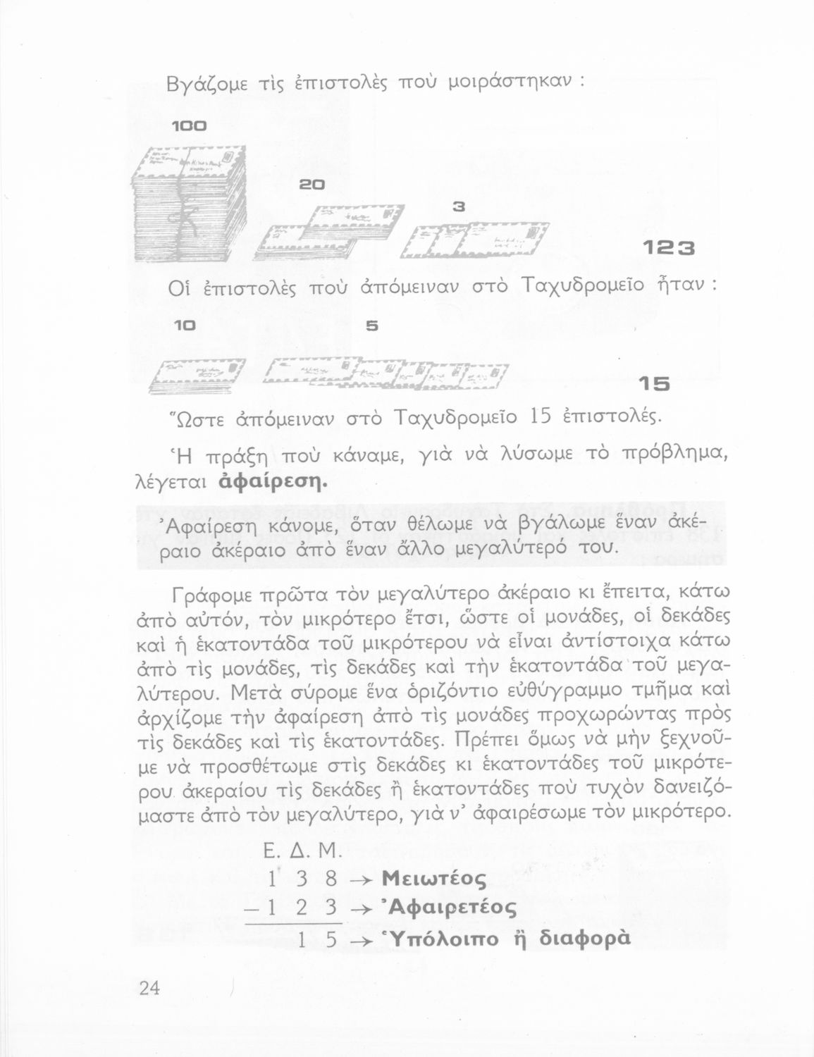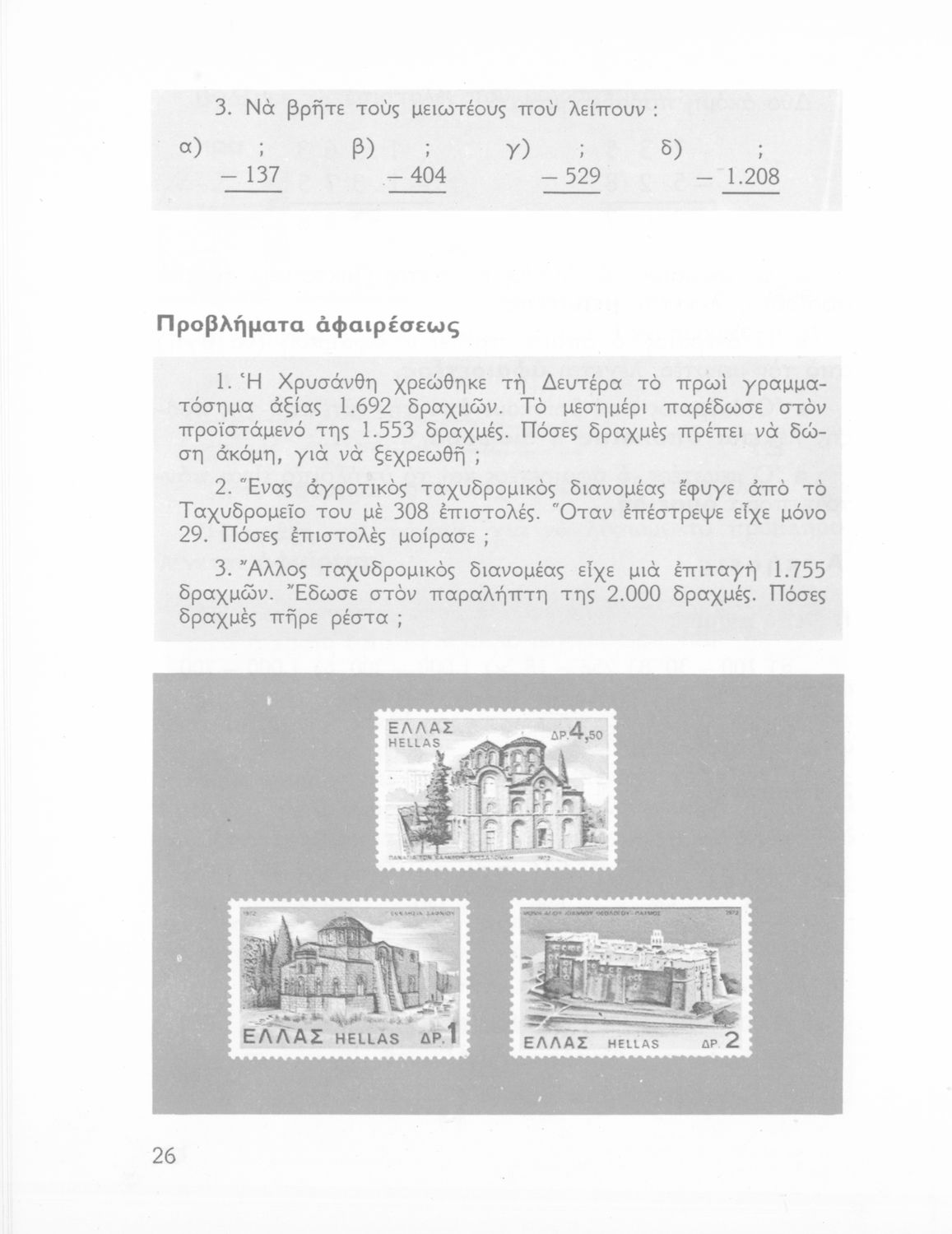 Σχολικό εγχειρίδιο Αριθμητικής Δ΄ Δημοτικού χωρισμένο σε πρακτικά προβλήματα και τις λύσεις τους που εστιάζει στις πράξεις με ακέραιους και συμμιγείς αριθμούς και περιλαμβάνει στοιχεία Γεωμετρίας.
