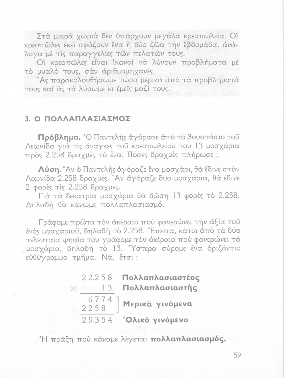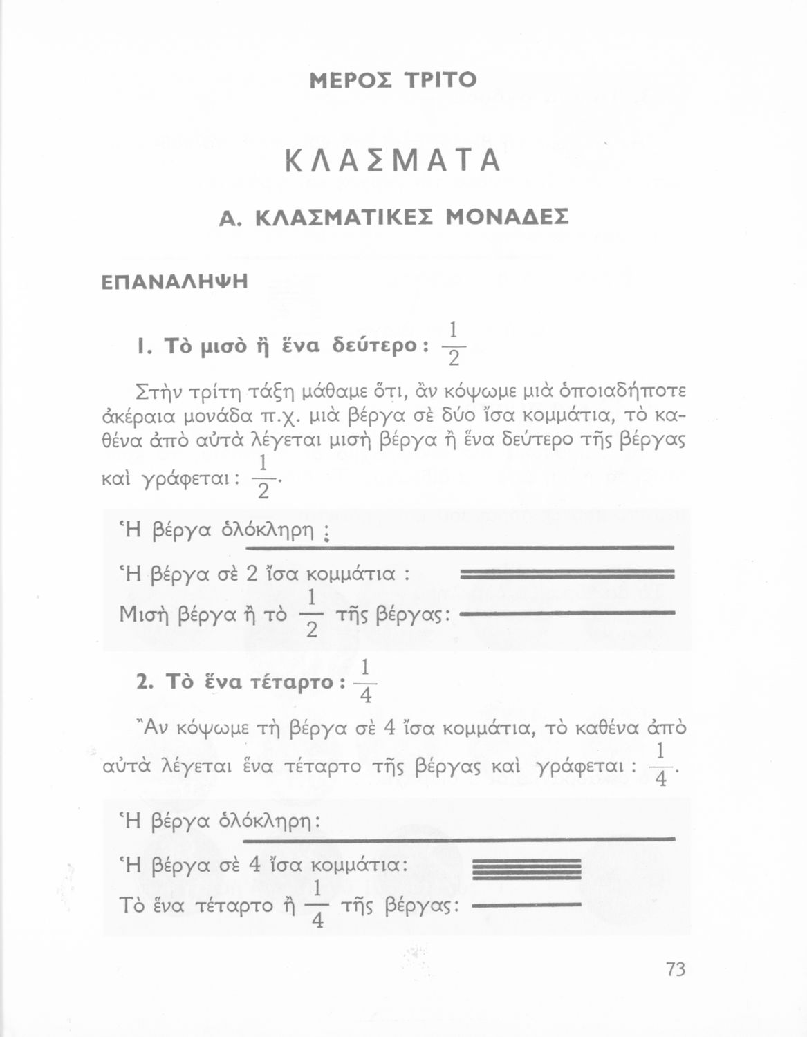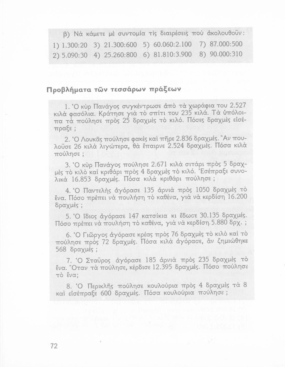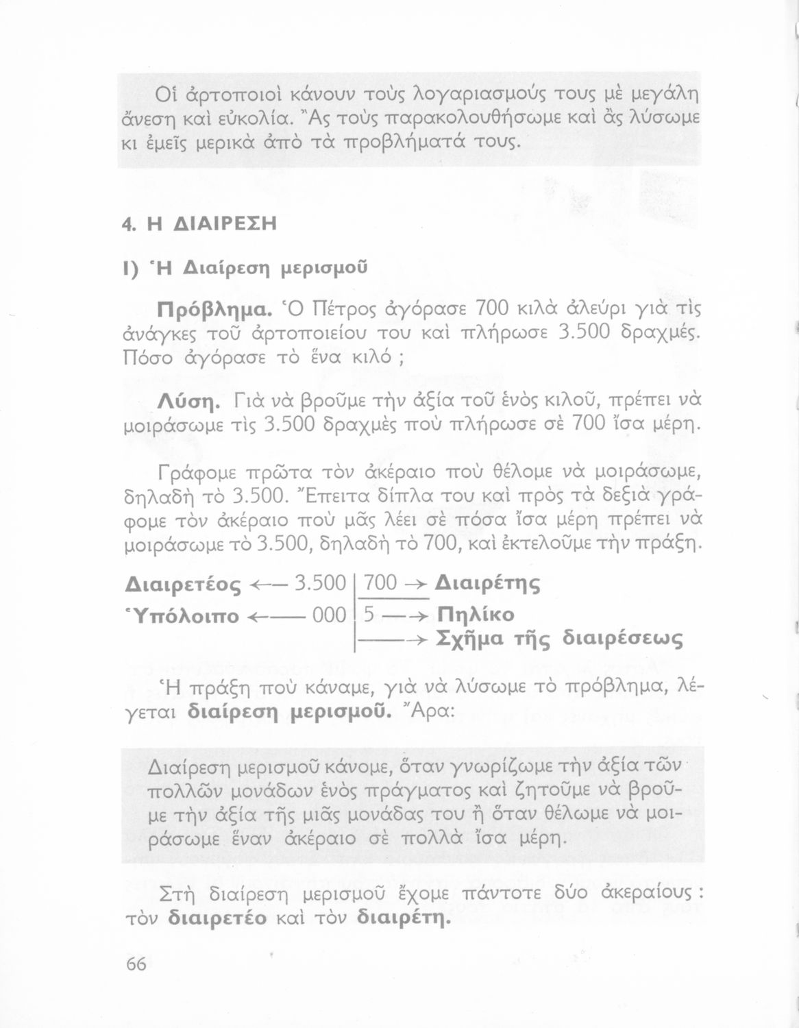 Σχολικό εγχειρίδιο Αριθμητικής Δ΄ Δημοτικού χωρισμένο σε πρακτικά προβλήματα και τις λύσεις τους που περιλαμβάνει και κάποια στοιχεία Γεωμετρίας.
