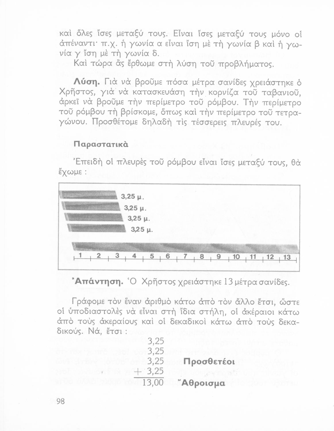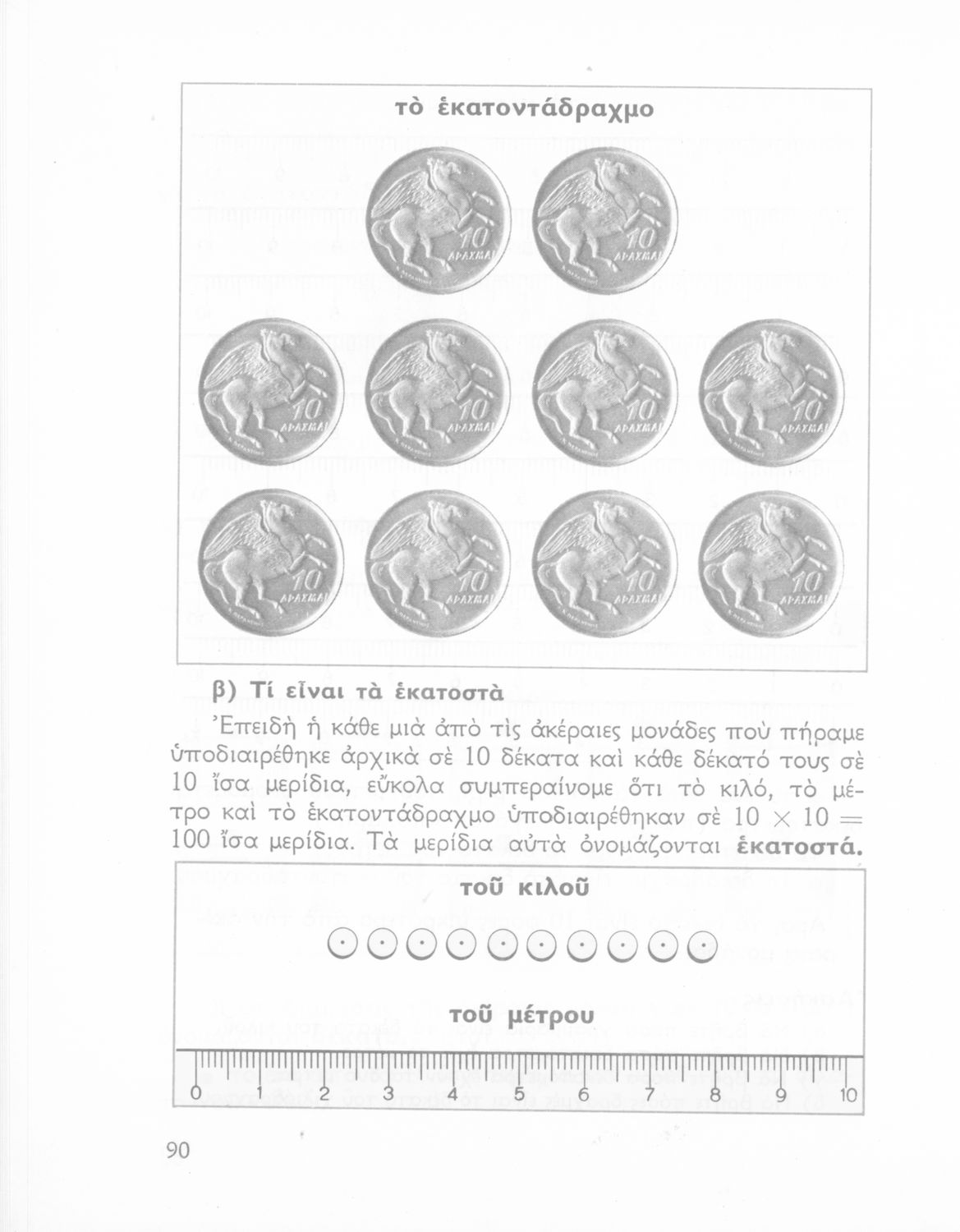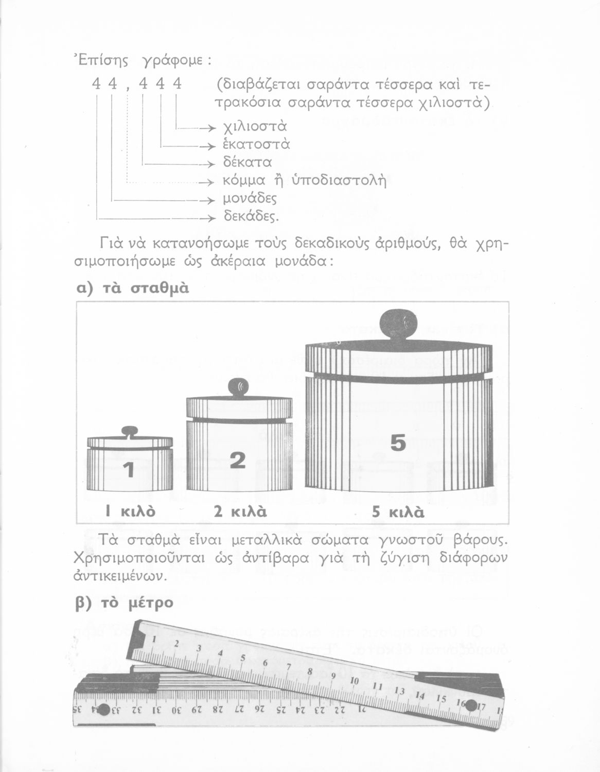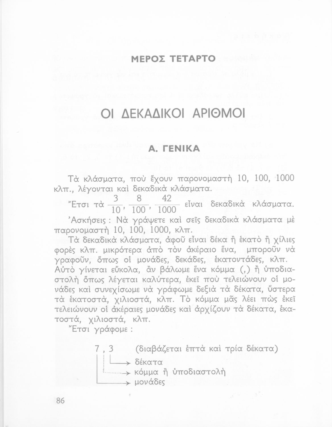 Σχολικό εγχειρίδιο Αριθμητικής Δ΄ Δημοτικού χωρισμένο σε πρακτικά προβλήματα και τις λύσεις τους που εστιάζει στις πράξεις με ακέραιους και συμμιγείς αριθμούς και περιλαμβάνει στοιχεία Γεωμετρίας.