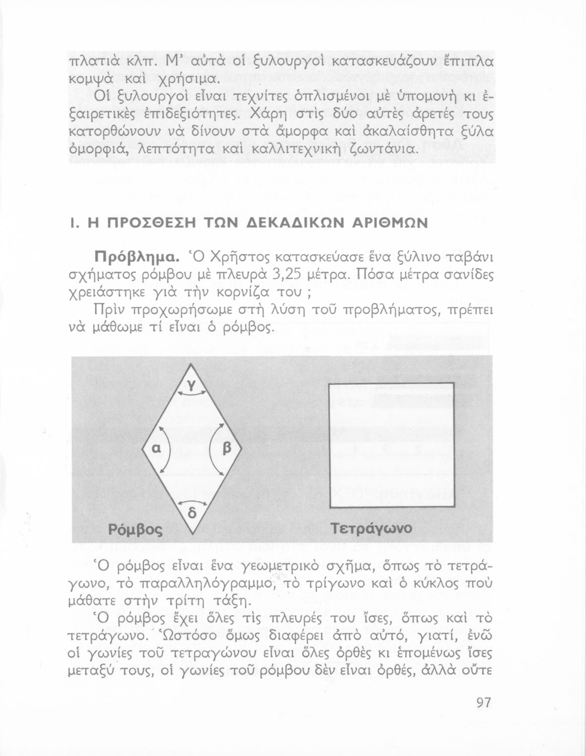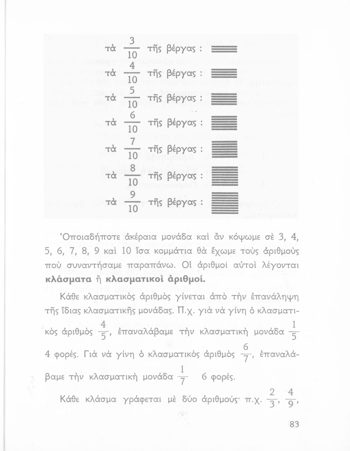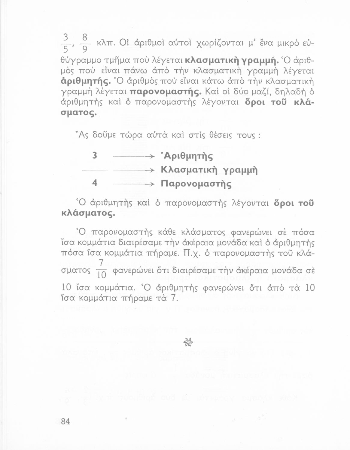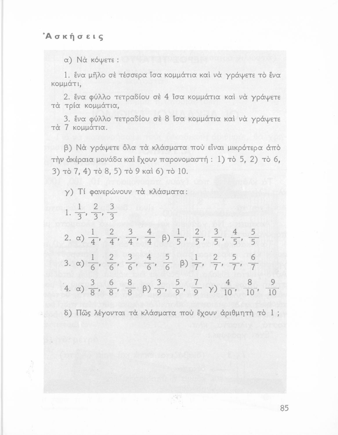 Σχολικό εγχειρίδιο Αριθμητικής Δ΄ Δημοτικού χωρισμένο σε πρακτικά προβλήματα και τις λύσεις τους που εστιάζει στις πράξεις με ακέραιους και συμμιγείς αριθμούς και περιλαμβάνει στοιχεία Γεωμετρίας.