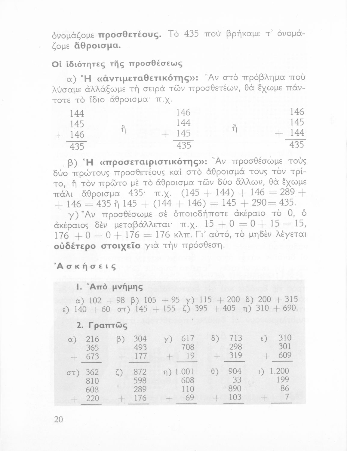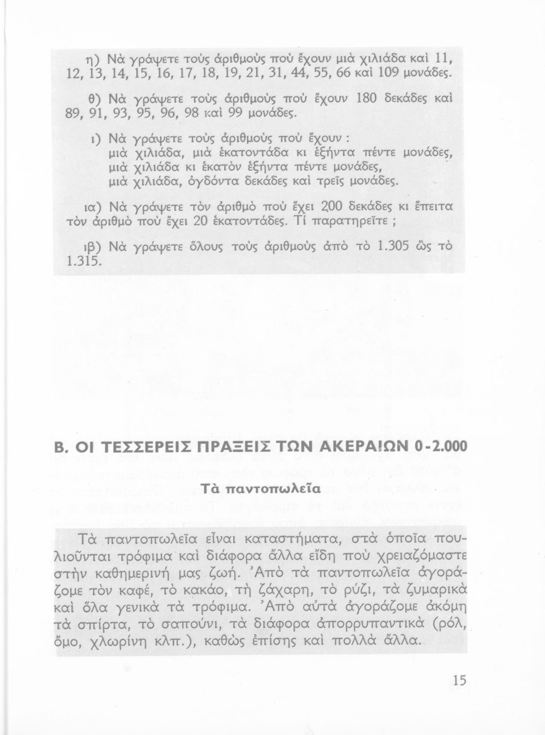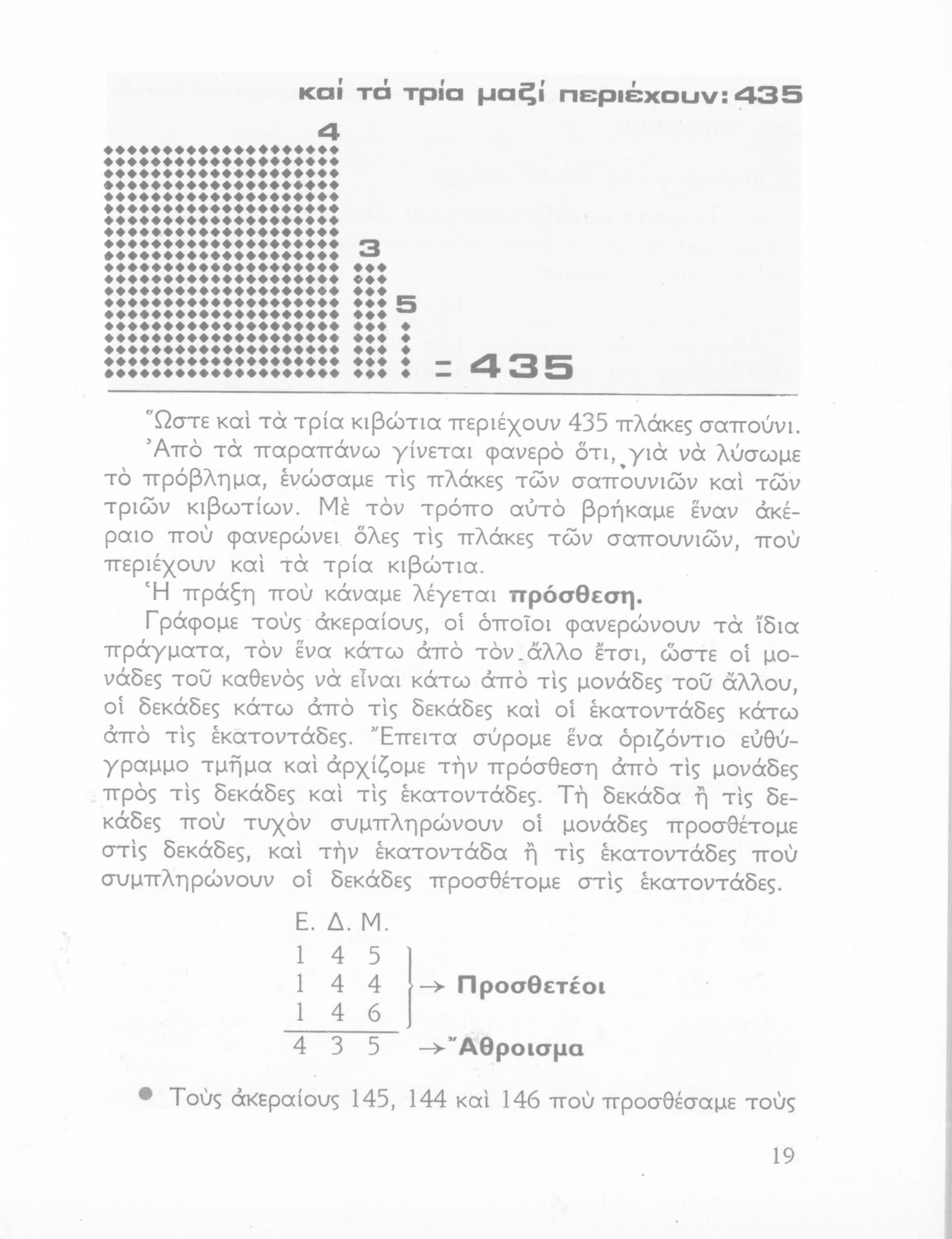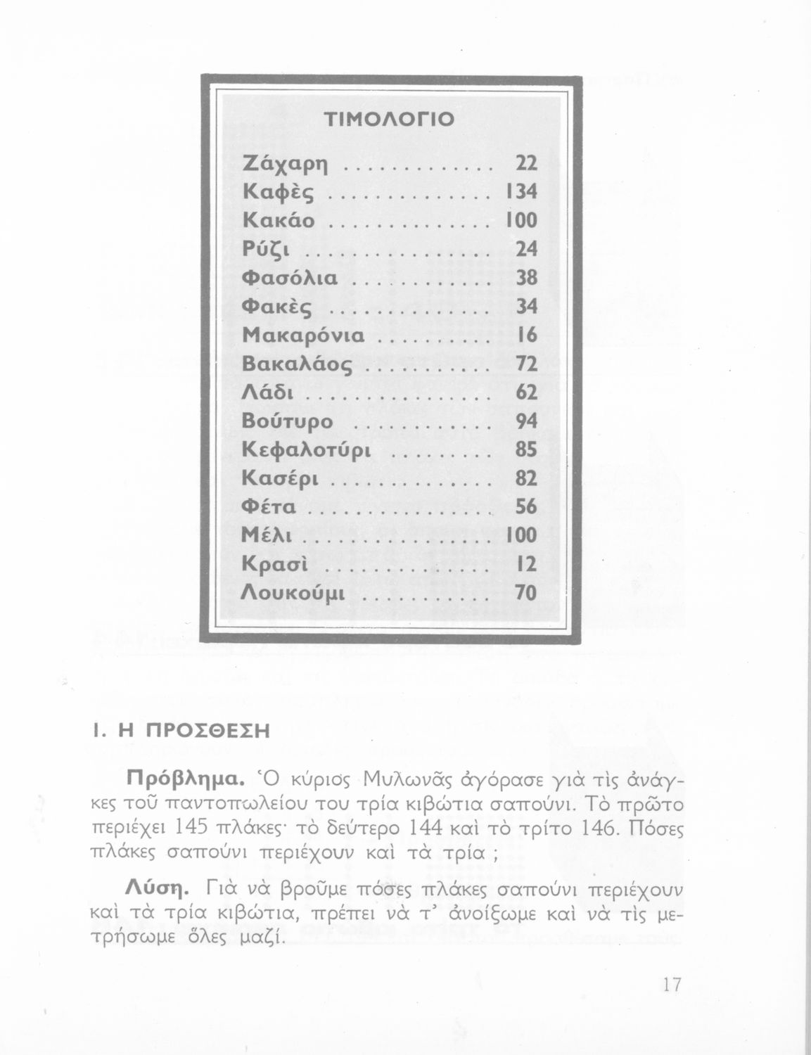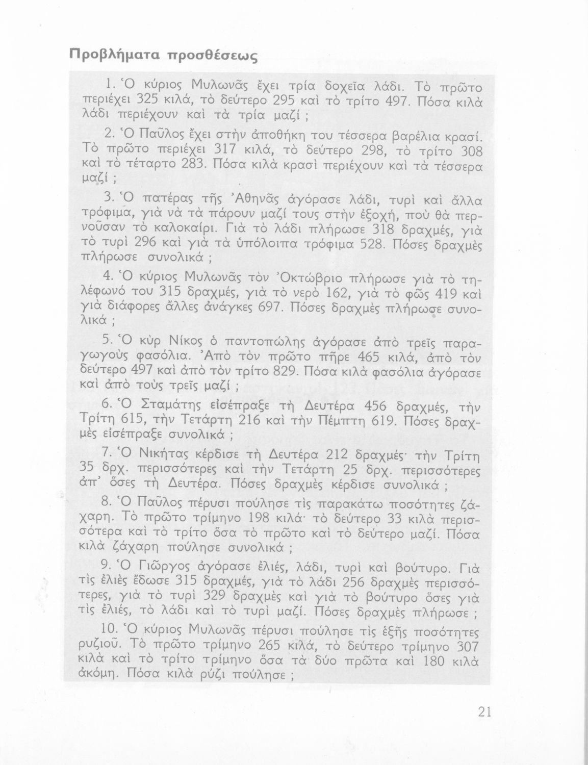 Σχολικό εγχειρίδιο Αριθμητικής Δ΄ Δημοτικού χωρισμένο σε πρακτικά προβλήματα και τις λύσεις τους που περιλαμβάνει και κάποια στοιχεία Γεωμετρίας.