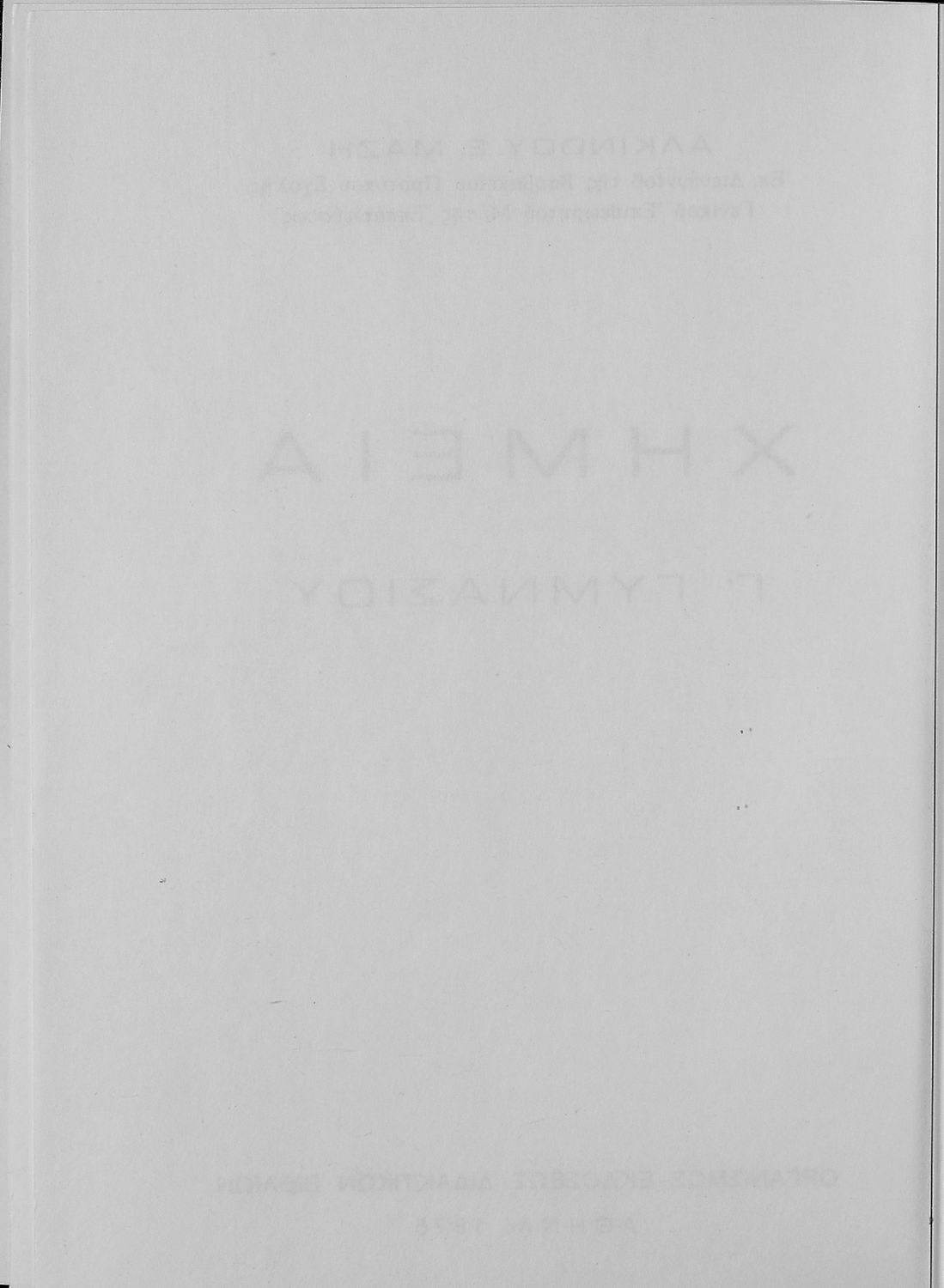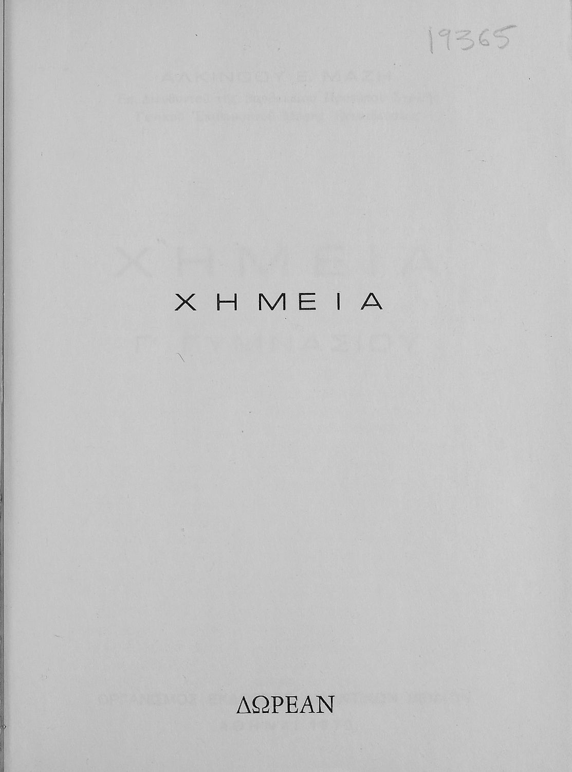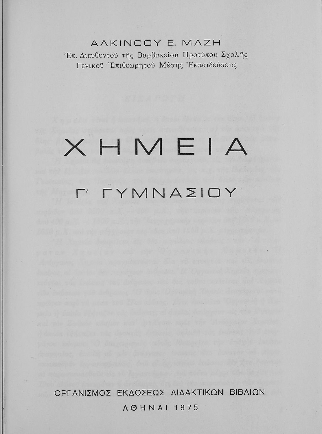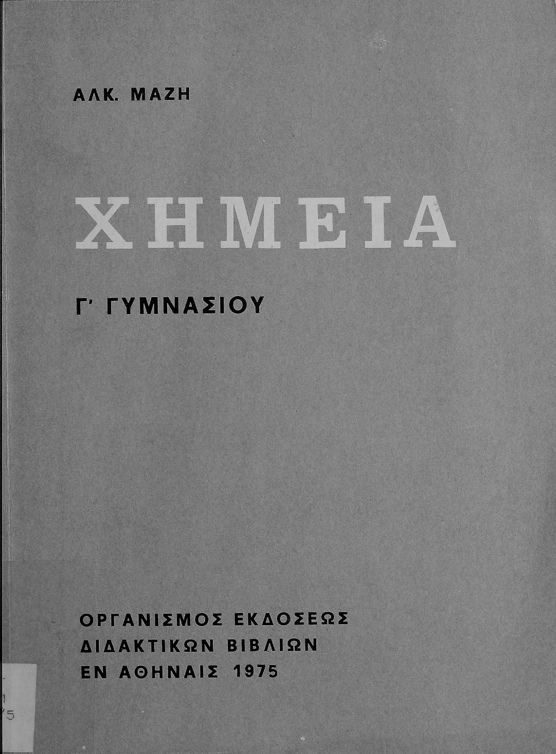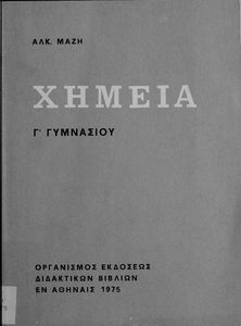 Κωδικός αναγνώρισης: 01-19365 Τίτλος: Χημεία Γ΄ Γυμνασίου Συγγραφέας: Αλκίνοος Ε. Μάζης Μέγεθος και υπόστρωμα: Σχολικό εγχειρίδιο, μαλακό εξώφυλλο, 95 σελίδες. Σχέδια και σχήματα (ασπρόμαυρα). |