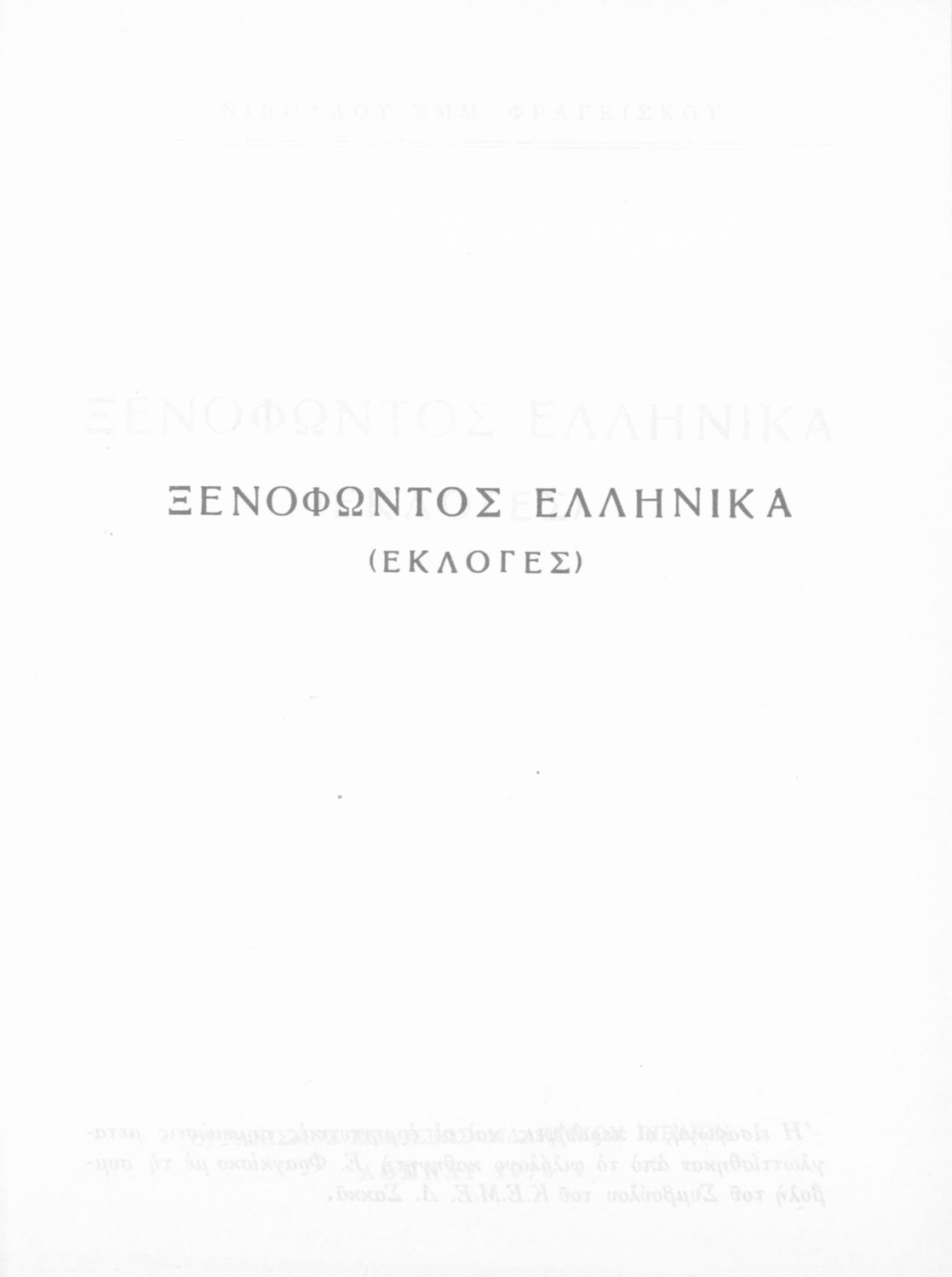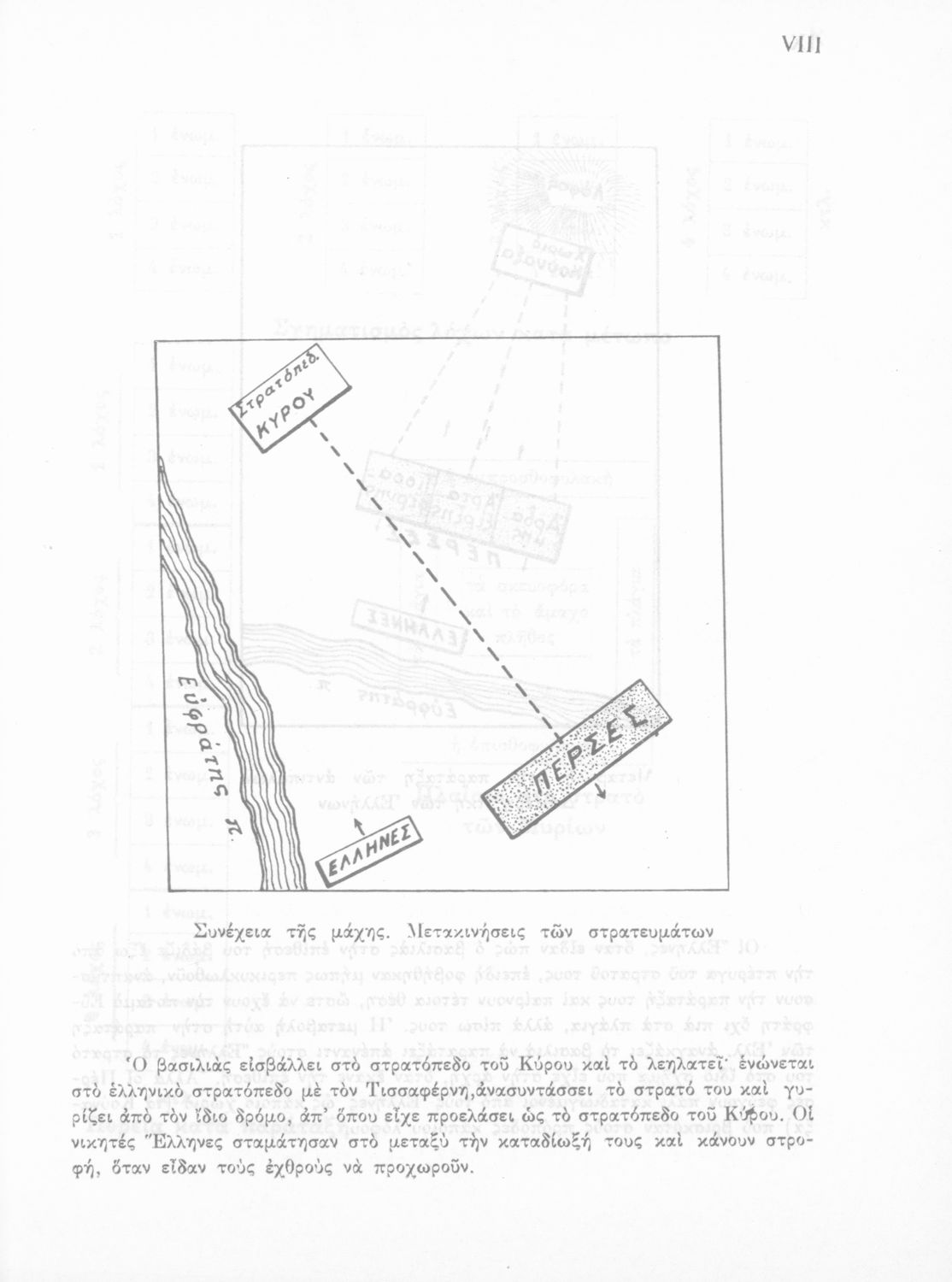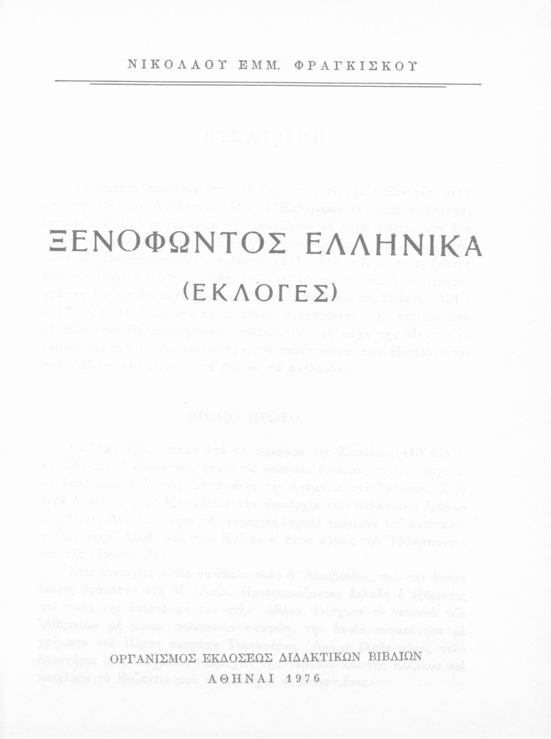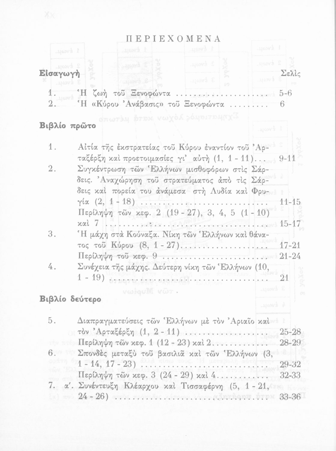 Σχολικό εγχειρίδιο Αρχαίων Ελληνικών. Η εισαγωγή, οι περιλήψεις και οι ερμηνευτικές σημειώσεις μεταγλωττίστηκαν από το Σύμβουλο του Κ.Ε.Μ.Ε. Ι. Αρβανίτη. Στο βιβλίο περιλαμβάνονται τα πρωτότυπα κείμενα από τα Ιστορικά του Ξενοφώντα "Κύρου Ανάβασις" και συγκεκριμένα η εκστρατεία του Κύρου κατά του αδελφού του Αρταξέρξη και κυρίως η κάθοδος (η επιστροφή) των Μυρίων. Ακολουθούν σχεδιαγράμματα της πορείας και διάταξης του στρατού. Στο δεύτερο μέρος του βιβλίου περιλαμβάνονται επιλογές από τα "Ελληνικά" του Ξενοφώντα σε πρωτότυπο κείμενο και ακολουθούν ερμηνευτικές σημειώσεις και σχεδιαγράμματα.