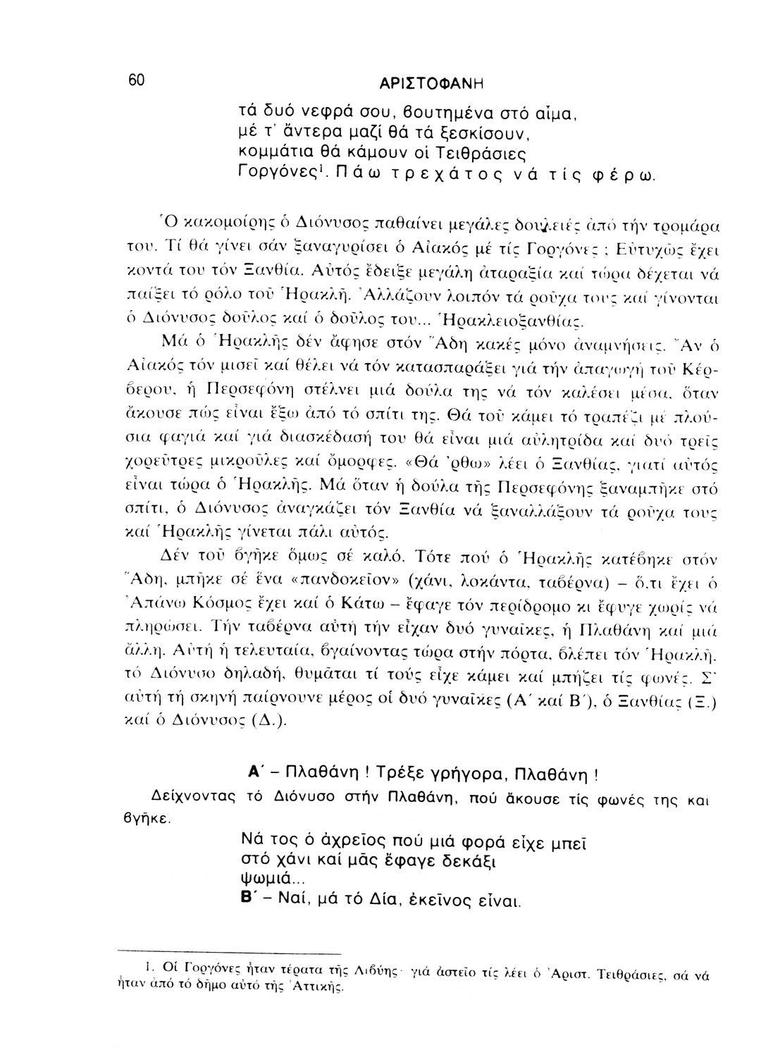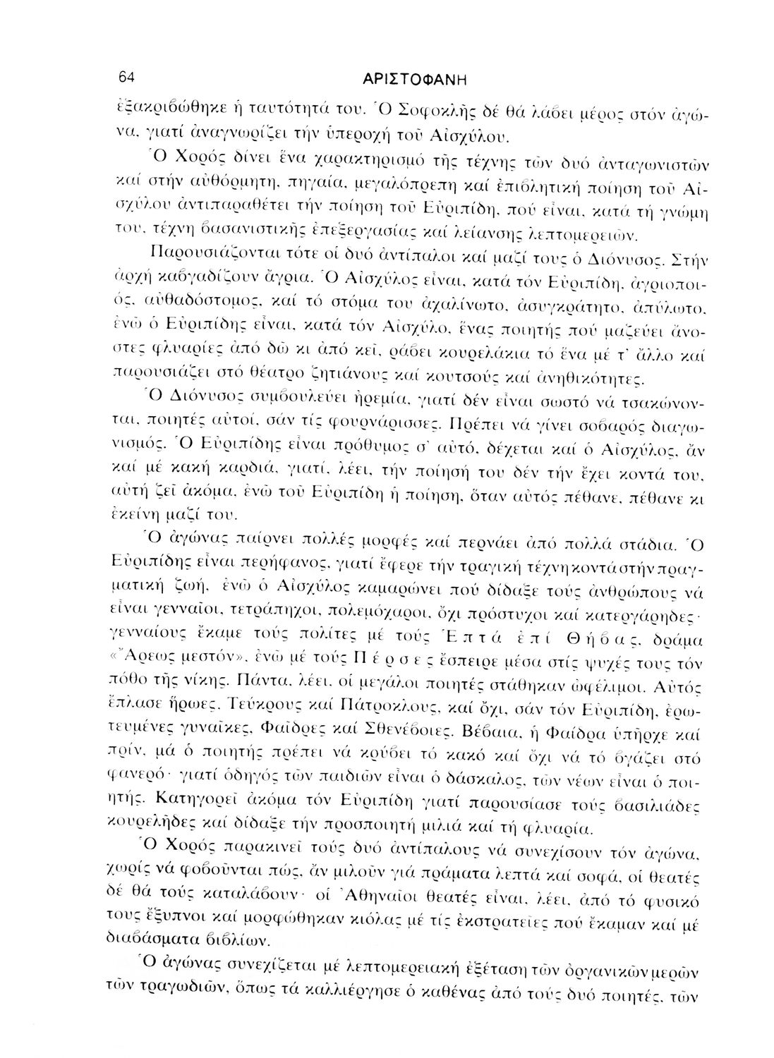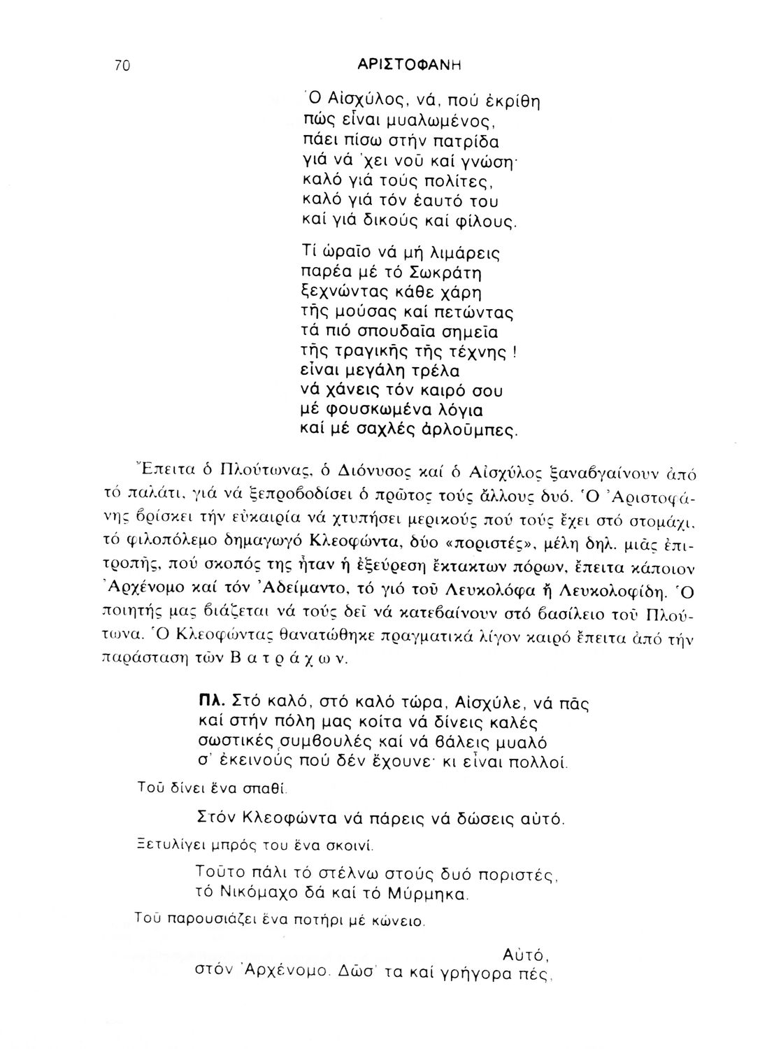Σχολικό εγχειρίδιο Αρχαίων Ελληνικών Γ΄ Λυκείου που περιλαμβάνει αποσπάσματα από την Τραγωδία του Αισχύλου Πέρσες σε μετάφραση Ι. Ν. Γρυπάρη, εισαγωγικό σημείωμα σχετικά με την αρχαία ελληνική κωμωδία του Ι. Κ. Κακριδή και αποσπάσματα από την κωμωδία του Αριστοφάνη Βάτραχοι σε μετάφραση και ερμηνευτικά σχόλια του Θρ. Σταύρου.