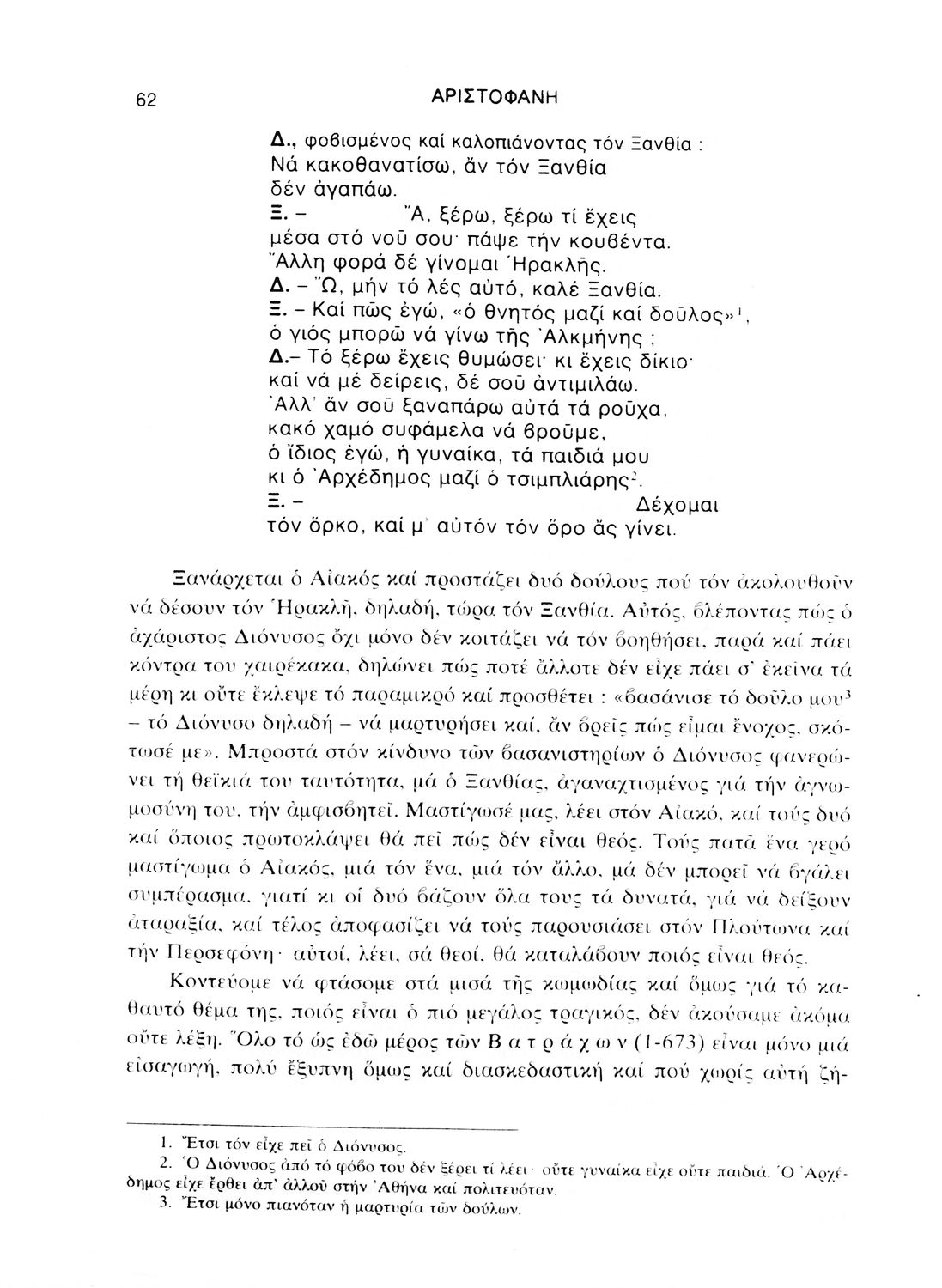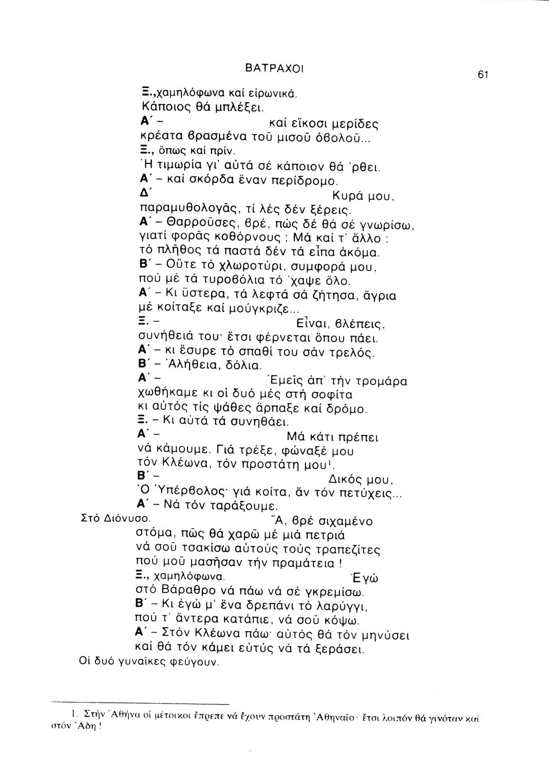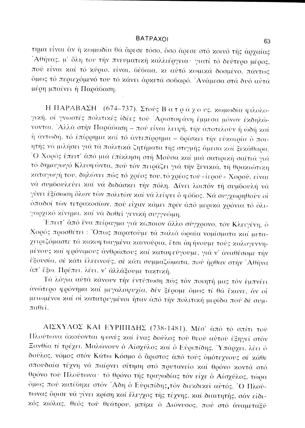 Σχολικό εγχειρίδιο Αρχαίων Ελληνικών Γ΄ Λυκείου που περιλαμβάνει αποσπάσματα από την Τραγωδία του Αισχύλου Πέρσες σε μετάφραση Ι. Ν. Γρυπάρη, εισαγωγικό σημείωμα σχετικά με την αρχαία ελληνική κωμωδία του Ι. Κ. Κακριδή και αποσπάσματα από την κωμωδία του Αριστοφάνη Βάτραχοι σε μετάφραση και ερμηνευτικά σχόλια του Θρ. Σταύρου.