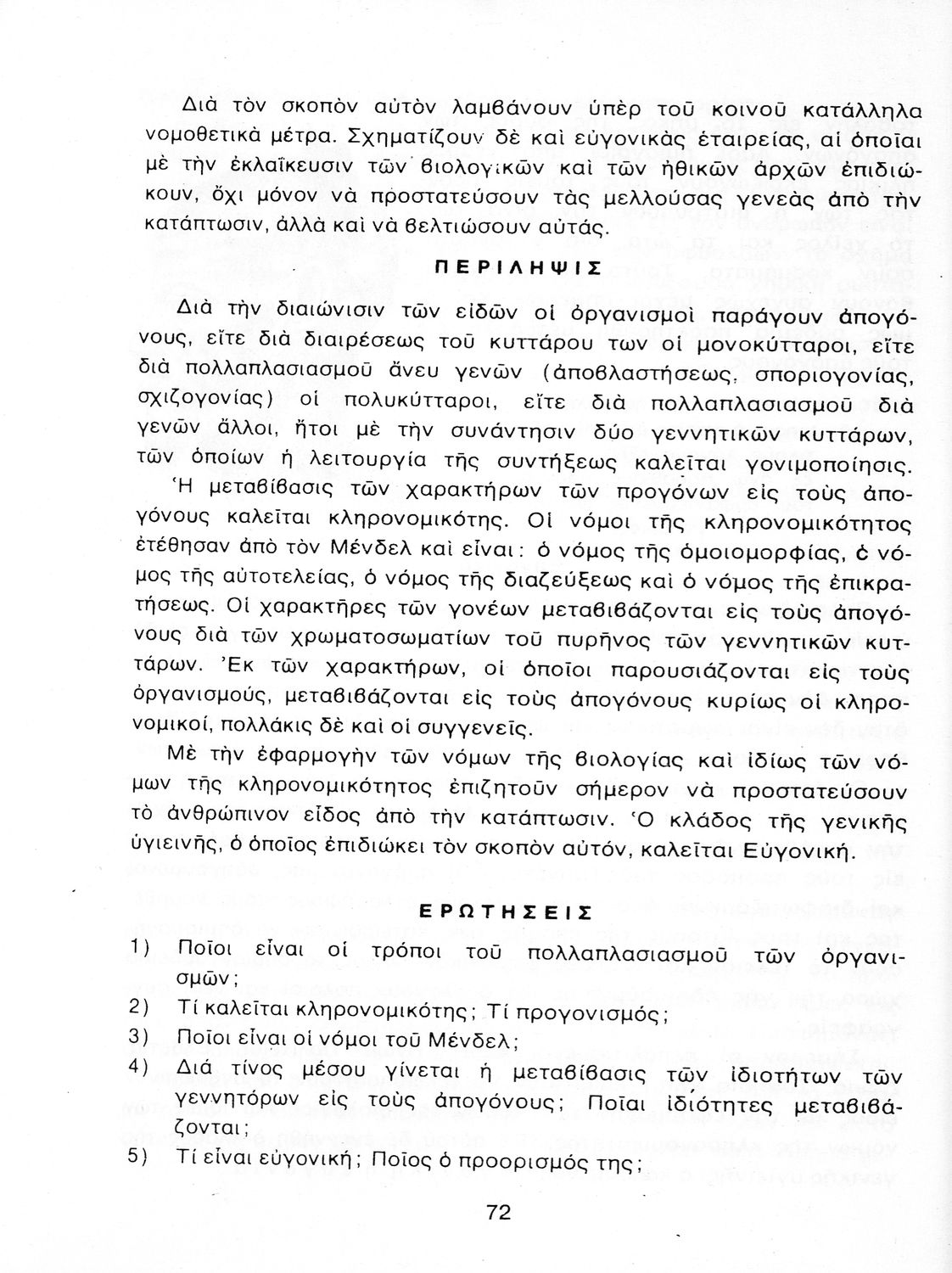 Σχολικό εγχειρίδιο Βιολογίας Γ΄ Γυμνασίου που εστιάζει στις συνθήκες γέννησης, μεταβολής και θανάτου των έμβιων οργανισμών. Φέρει το σύμβολο της δικτατορίας.