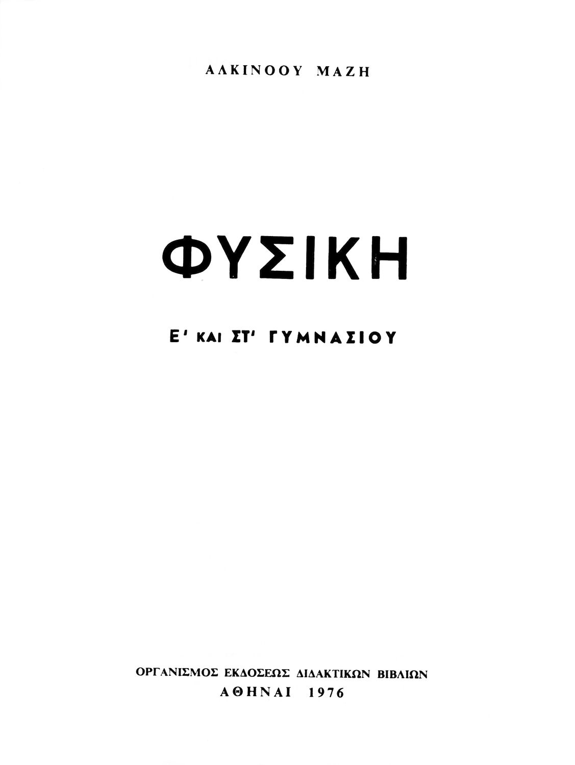 Σχολικό εγχειρίδιο της Ε΄ και ΣΤ΄ Τάξης των Δημοτικών Σχολείων και την Α΄ Τάξη των Οκτατάξιων Γυμνασίων, Προγυμνασίων και Αστικών Σχολείων για το μάθημα της Φυσικής. Παρέχει βασικές γνώσεις της φυσικής ...