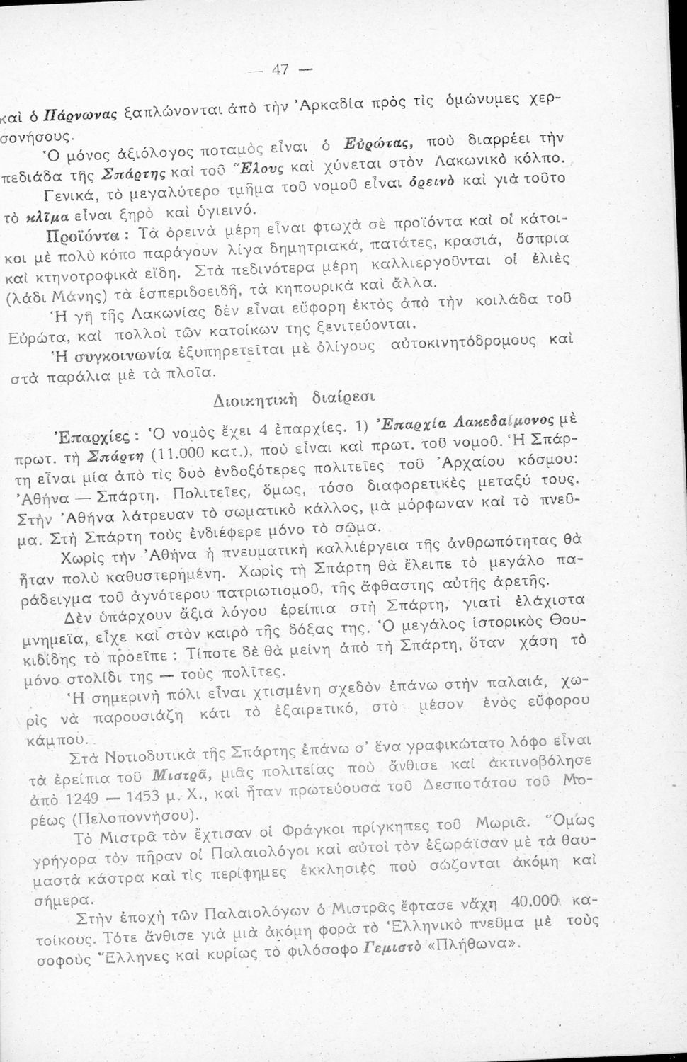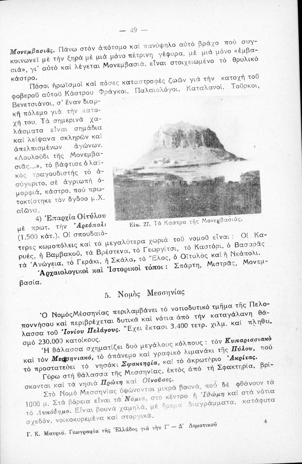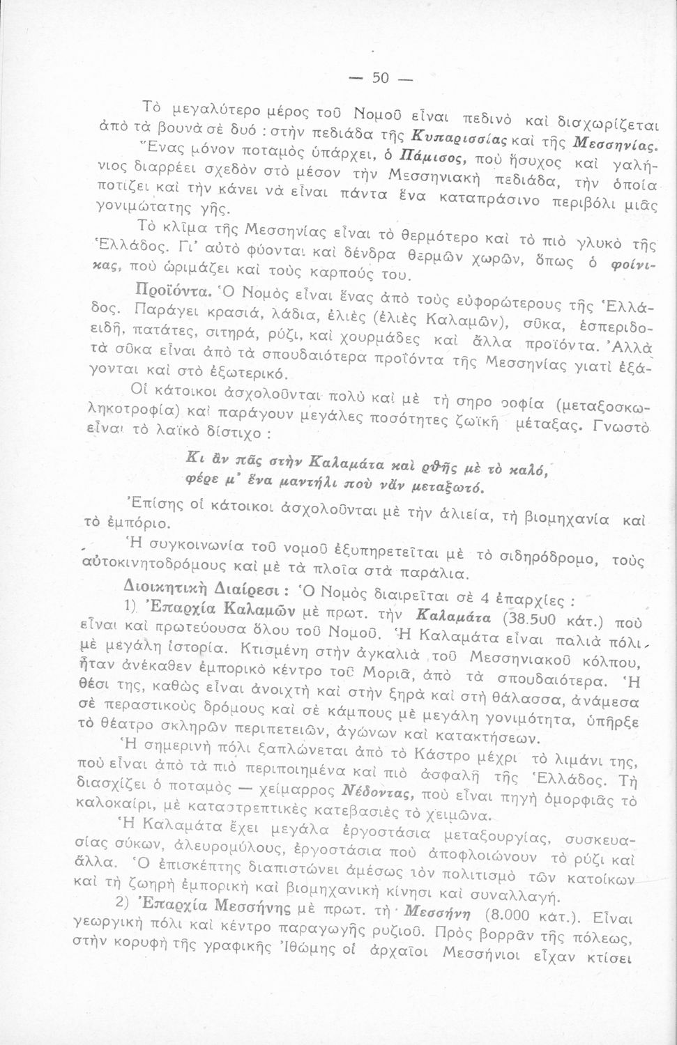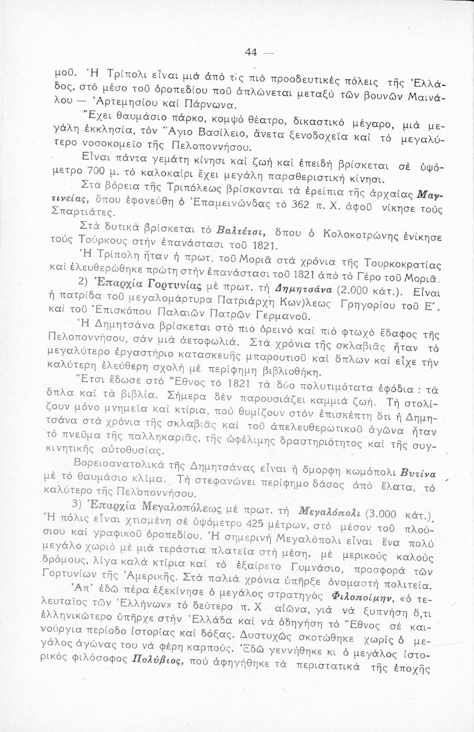 Σχολικό εγχειρίδιο Γεωγραφίας για τη Γ΄, Δ΄ Δημοτικού. Μελετά την Ελλάδα ανά γεωγραφικό νομό με πληροφορίες από το χάρτη της περιοχής και στοιχεία της ιστορίας και της οικονομικής ζωής.