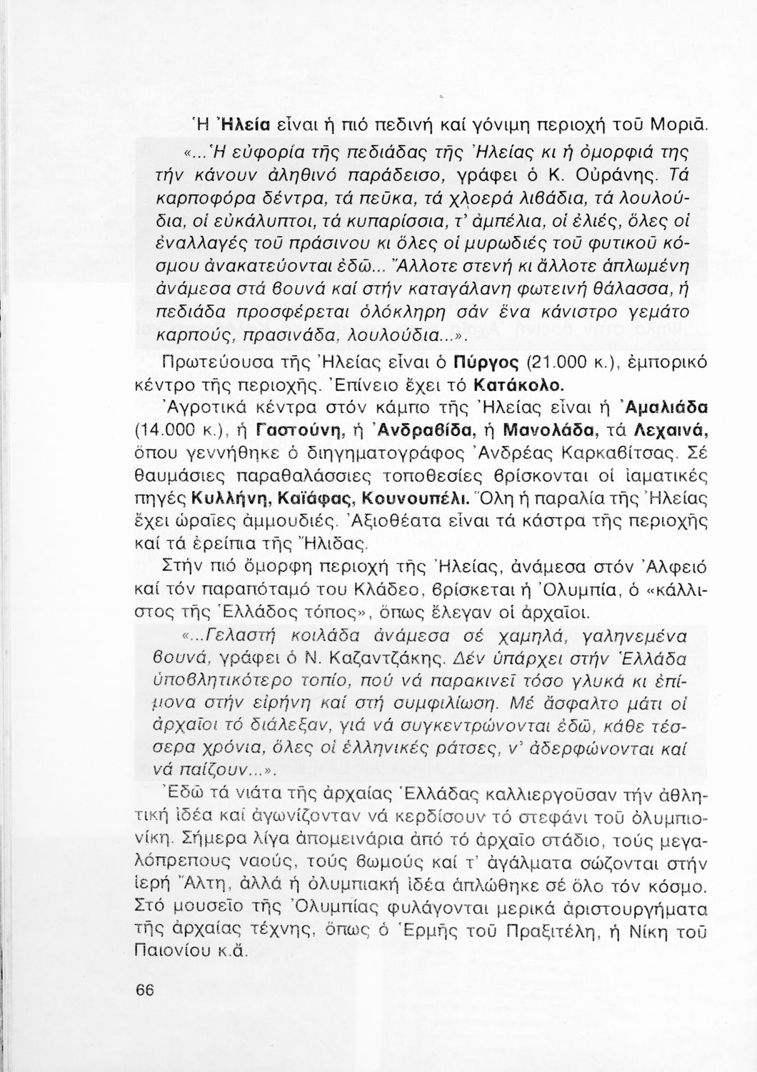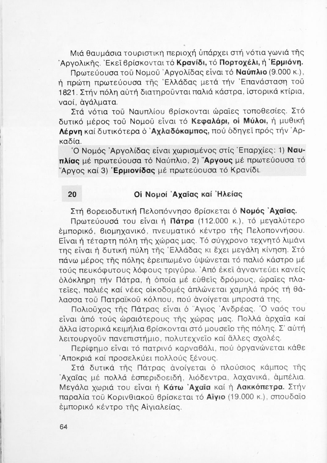 Μαθητικό βοήθημα Γεωγραφίας Γ΄, Δ΄ Δημοτικού που αποτελεί μια γενική επισκόπηση της Ελλάδας ανά διαμέρισμα και νομό από γεωμορφολογική, πολιτική και οικονομική σκοπιά. Περιέχει και ταξιδιωτικές οδηγίες.