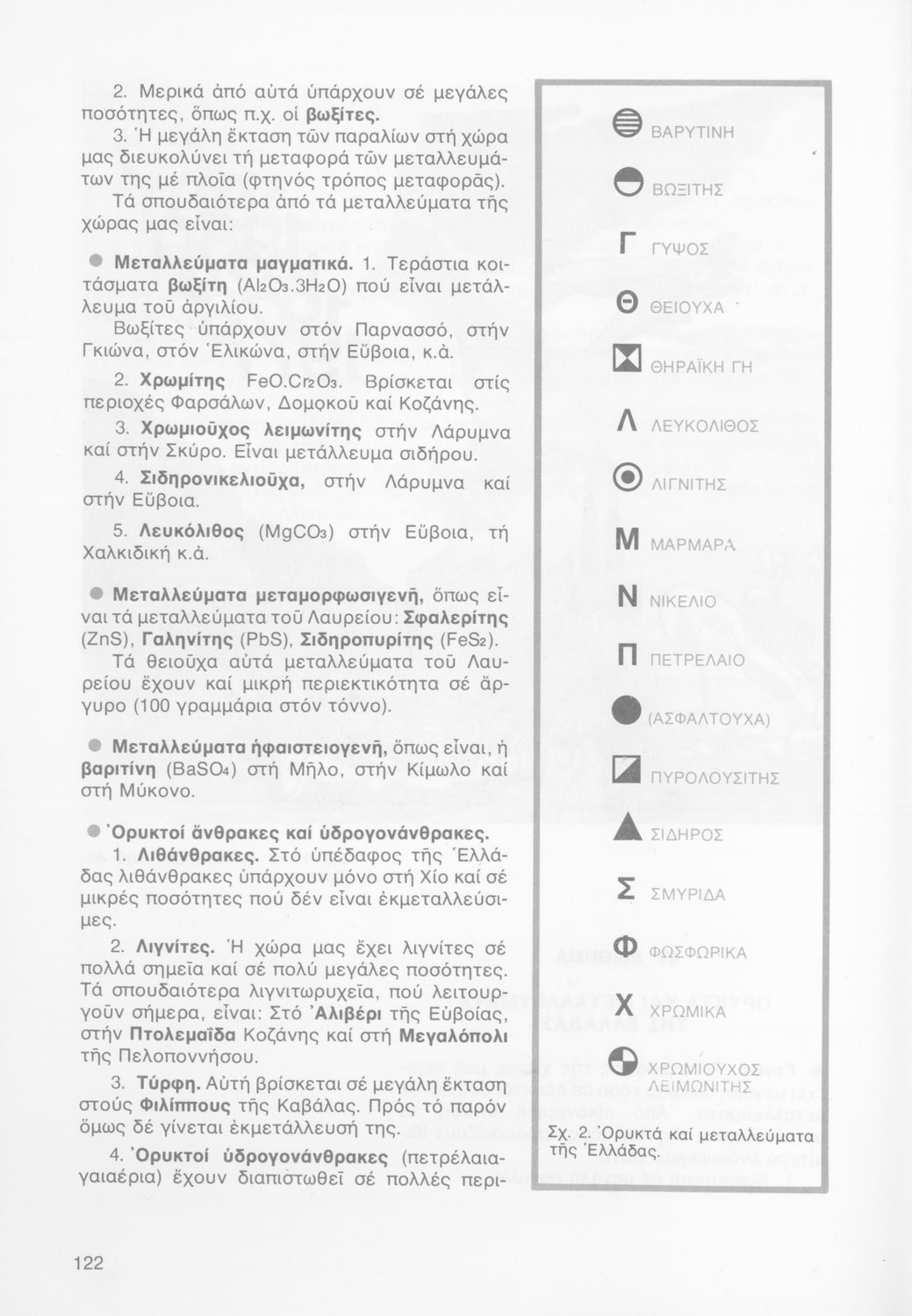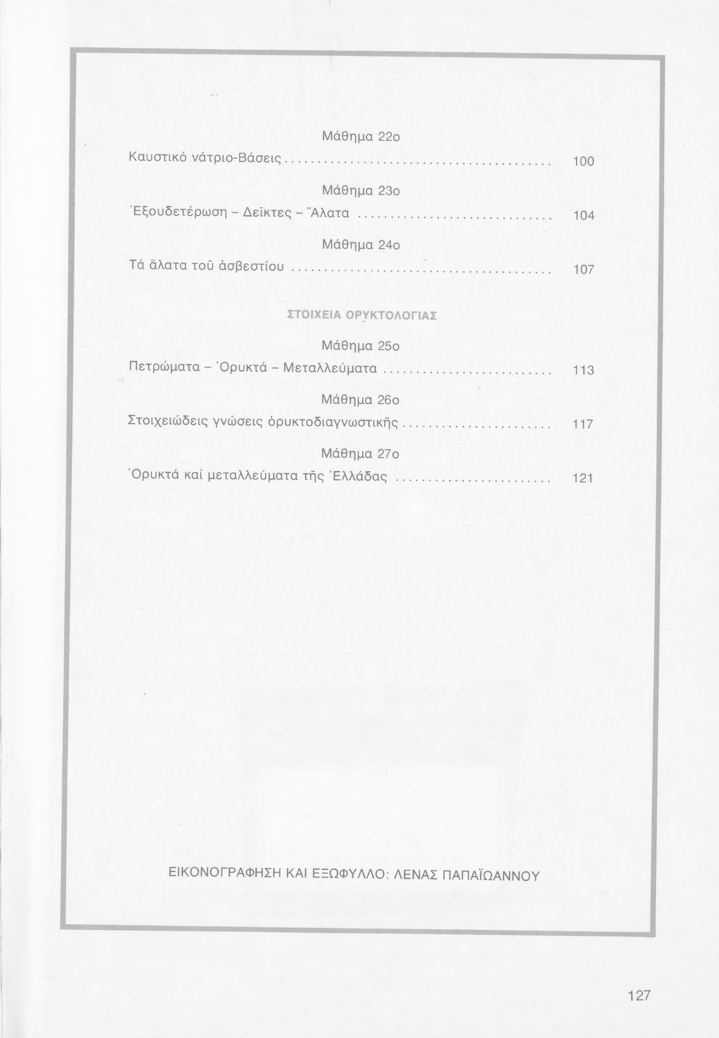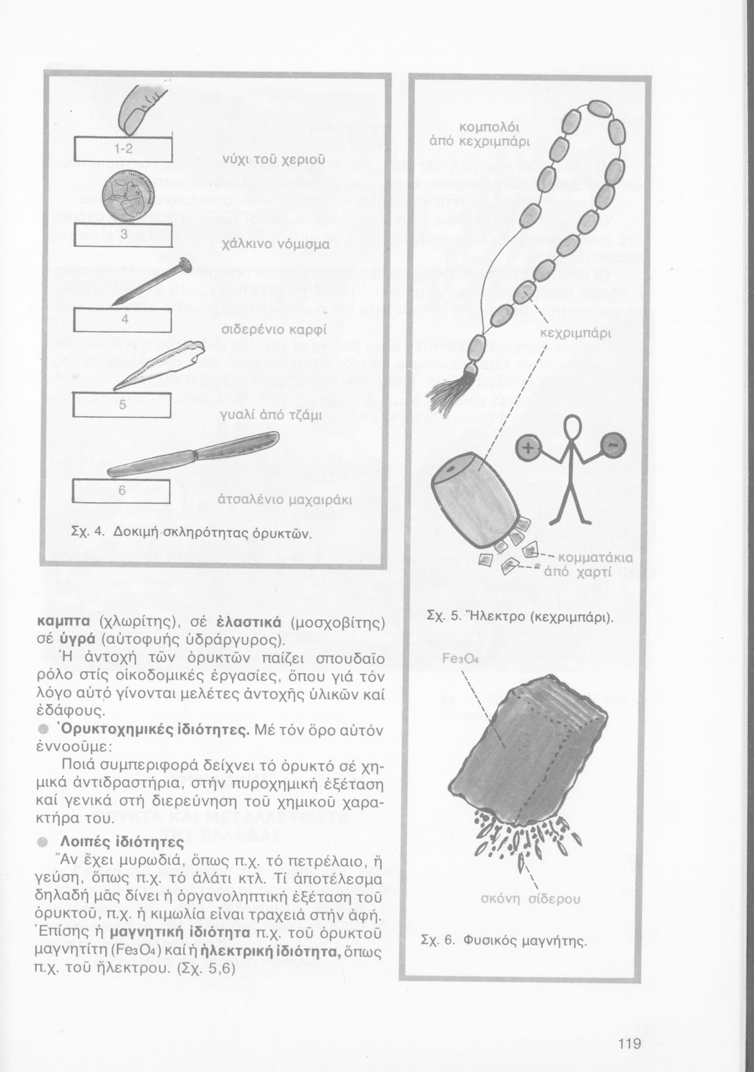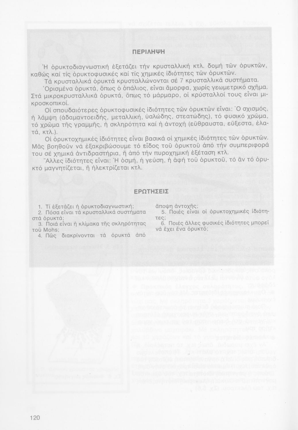 Σχολικό εγχειρίδιο Γεωλογίας/Ορυκτολογίας για τη Β΄ Γυμνασίου που παρουσιάζει τα ορυκτά με βάση την κλάση στην οποία ανήκουν. Περιέχει και πίνακα των γεωλογικών περιόδων.