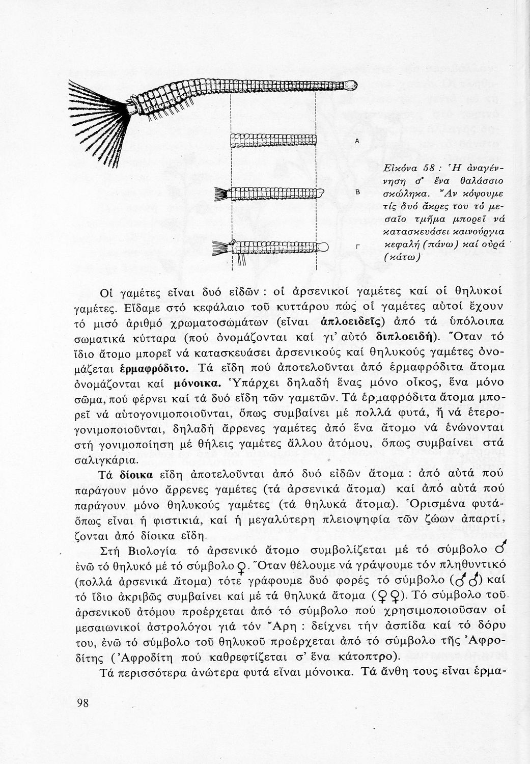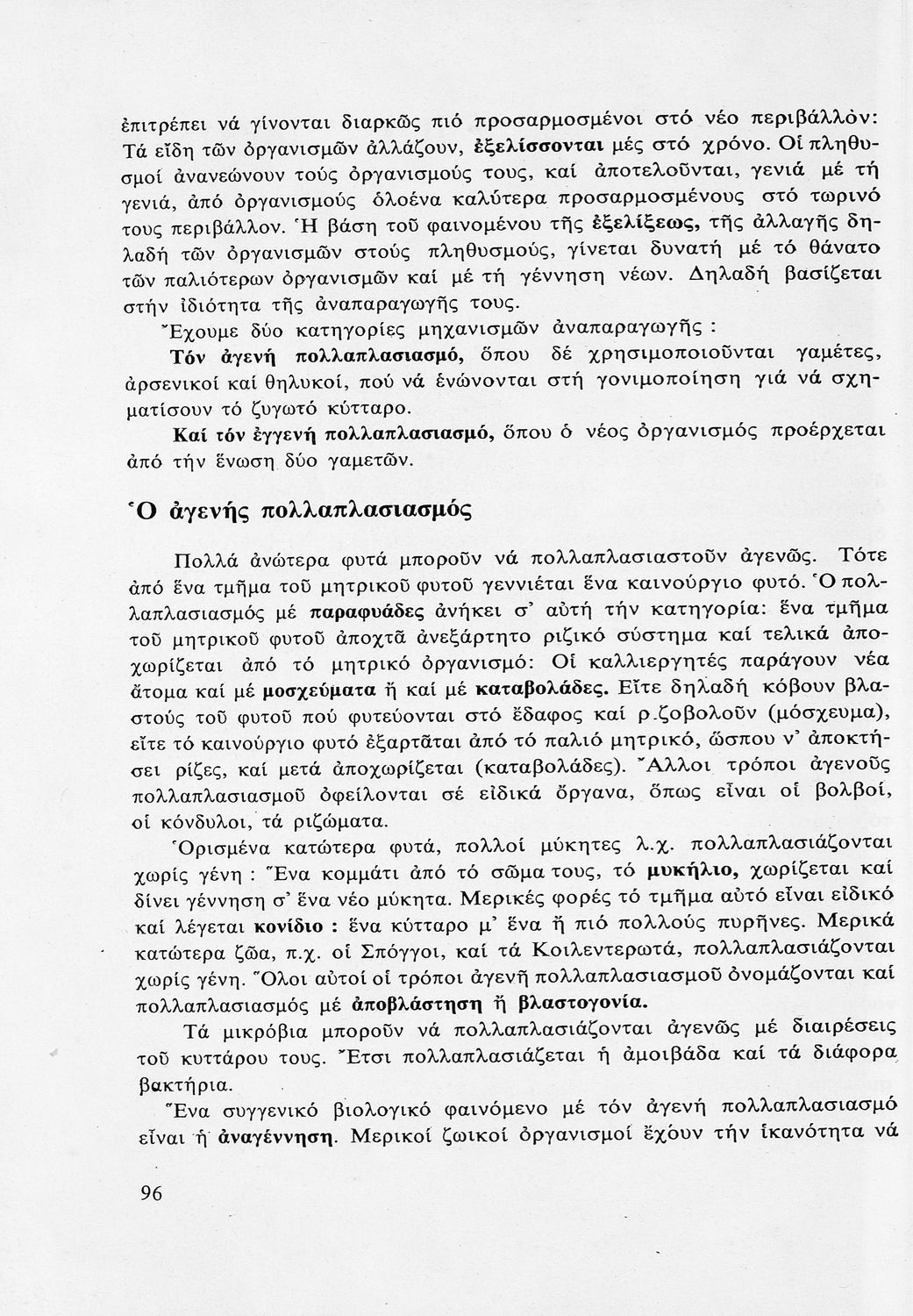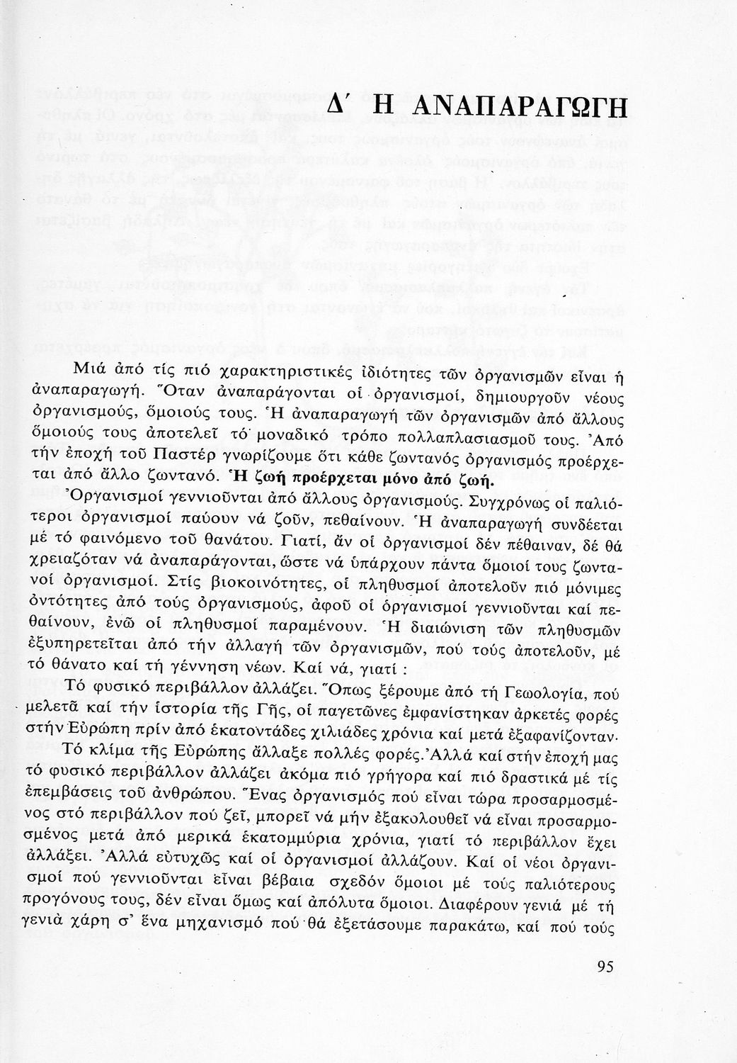 Σχολικό εγχειρίδιο Βιολογίας ΣΤ΄ Γυμνασίου που εστιάζει στις συνθήκες γέννησης, μεταβολής και θανάτου των έμβιων οργανισμών. Φέρει το σύμβολο της δικτατορίας. Ο συγγραφέας ήταν υφηγητής του Πανεπιστημίου ...