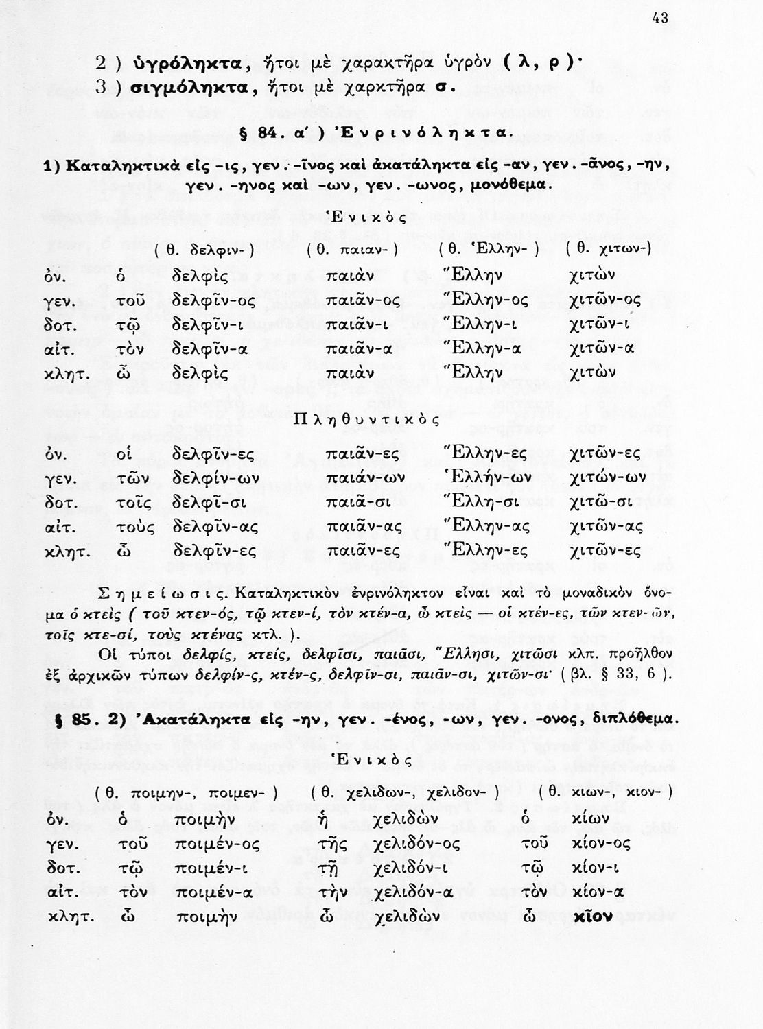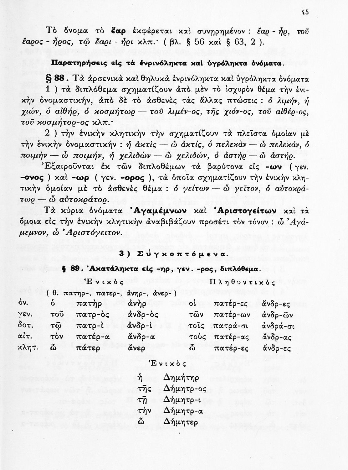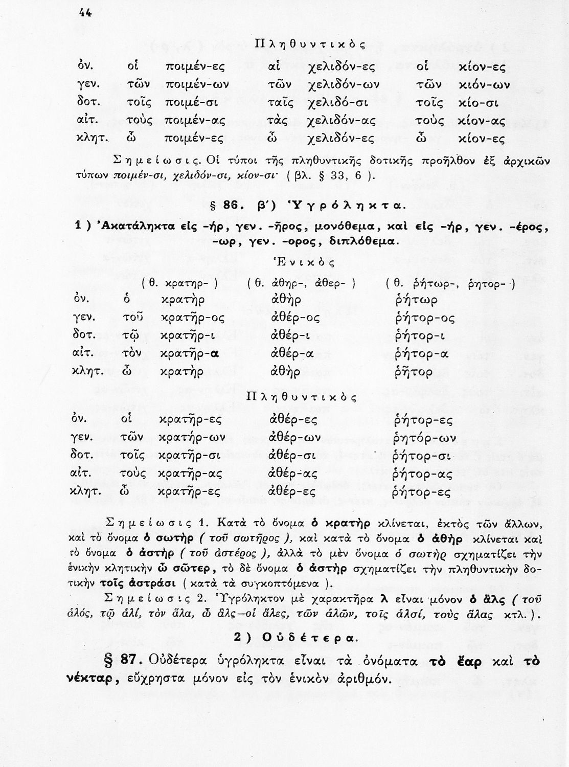 Σχολικό εγχειρίδιο Αρχαίων Ελληνικών Α', Β', και Γ' Γυμνασίου που περιέχει τους κανόνες γραμματικής και είναι χωρισμένο σε φθογγολογικό, τυπολογικό και ετυμολογικό μέρος. Περιέχει και κατάλογο ανωμάλων ρημάτων.