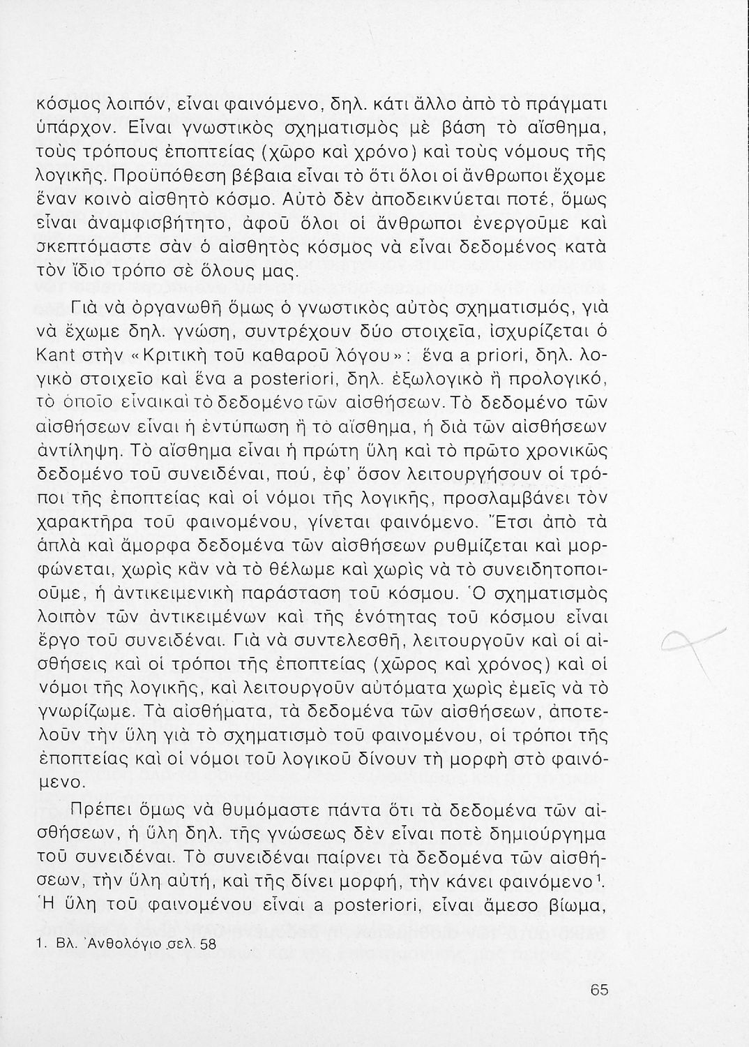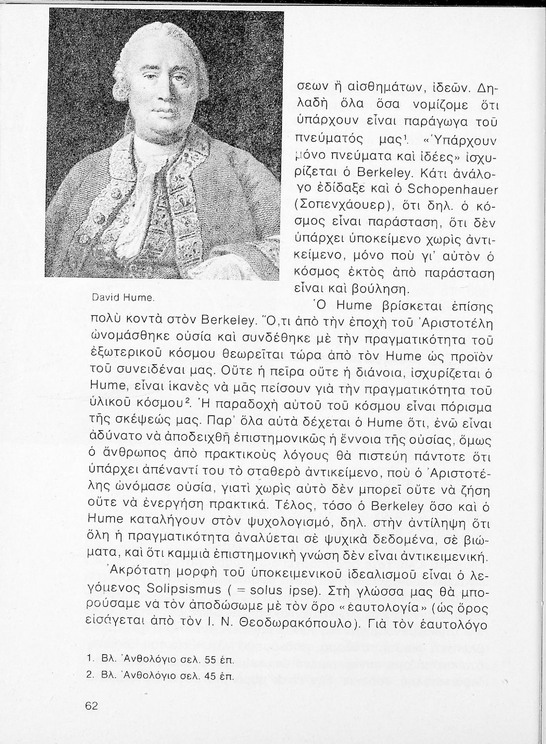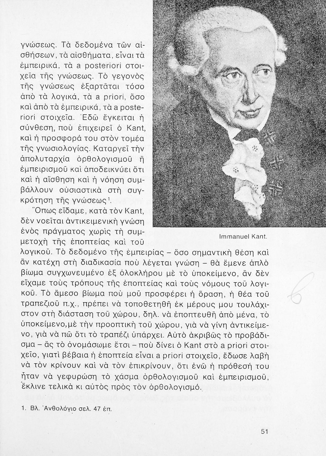 Σχολικό εγχειρίδιο Φιλοσοφίας ΣΤ΄ Γυμνασίου που ακολουθεί μια ιστορική πραγμάτευση επιστημολογικών, ηθικών και αισθητικών ζητημάτων και καλύπτει δύο περιόδους: α) την ελληνική αρχαιότητα και β) την σύγχρονη ευρωπαϊκή σκέψη από τον Descartes και τον Kant στον λογικό θετικισμό και τον νεοκαντιανισμό. Περιέχει εκτενές κεφάλαιο για τους προσωκρατικούς.