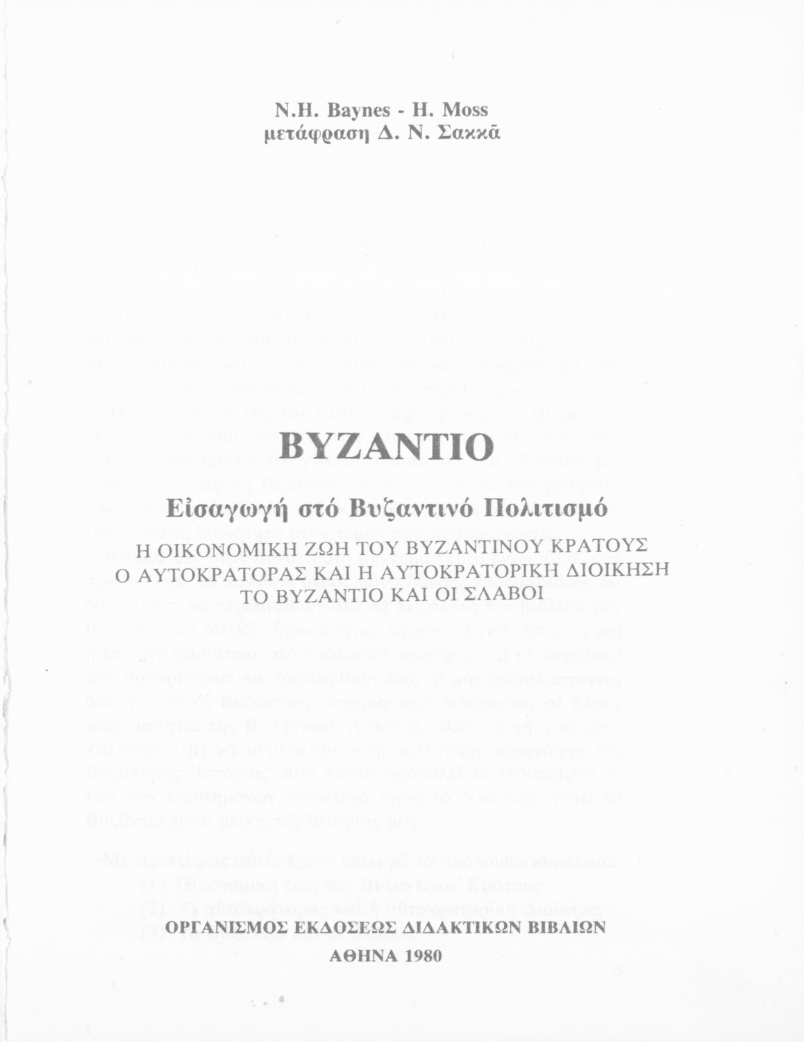 Κωδικός αναγνώρισης: 01-19458 Τίτλος: Βυζάντιο εισαγωγή στο Βυζαντινό πολιτισμό Συγγραφέας: N. H Baynes, H. Moss, Δ. Ν. Σακκάς (μετάφραση) Μέγεθος και υπόστρωμα: Σχολικό εγχειρίδιο, μαλακό εξώφυλλο, 125 σελίδες. |