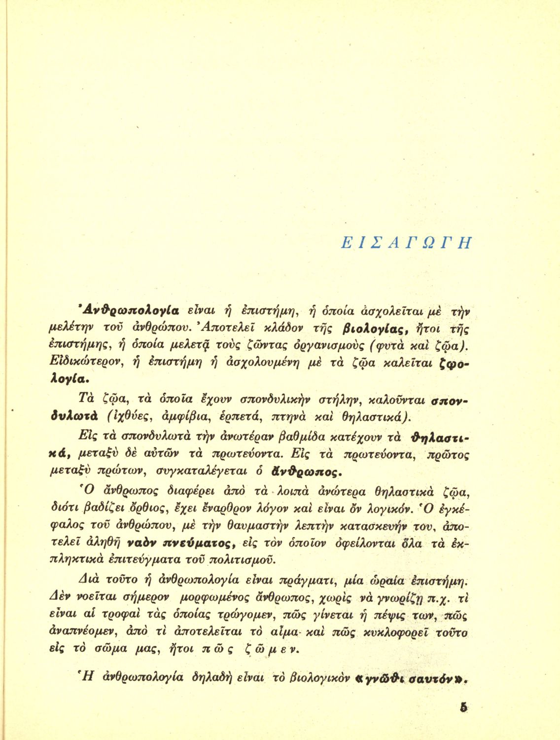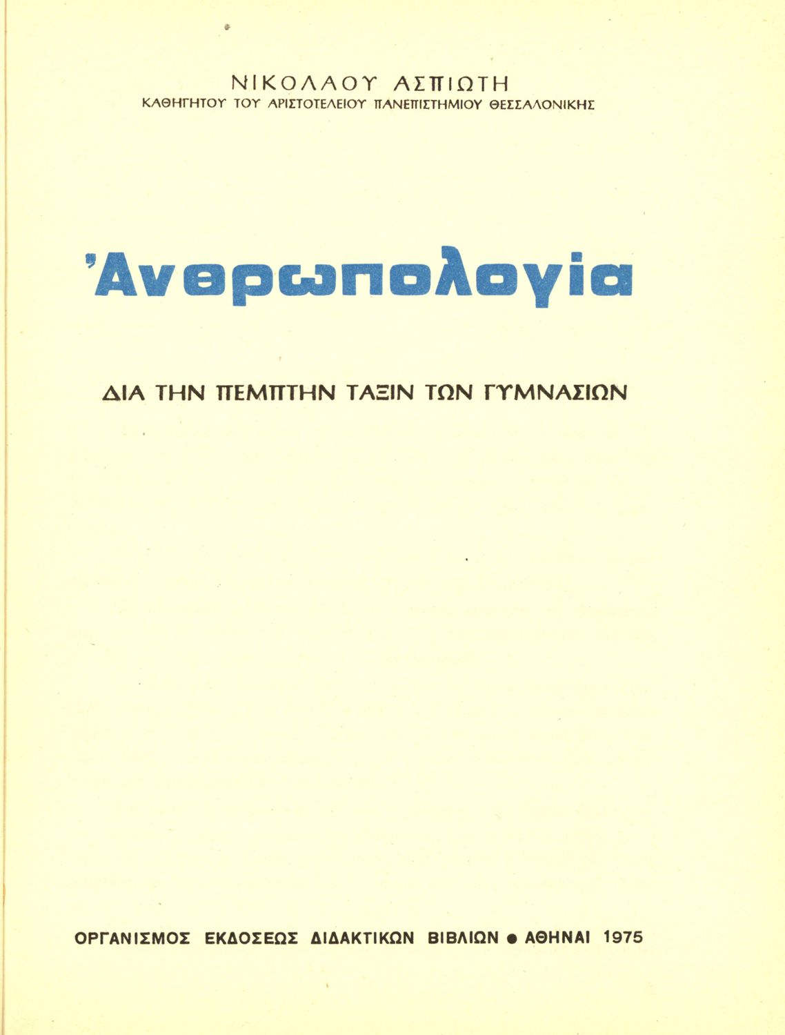 Σχολικό εγχειρίδιο Ανθρωπολογίας Ε΄ Γυμνασίου που εστιάζει στην κατασκευή, ανάπτυξη και λειτουργία του ανθρώπινου οργανισμού και τη σχέση του ανθρώπου με το φυσικό περιβάλλον. Περιέχει και αναφορά στις ανθρώπινες φυλές.