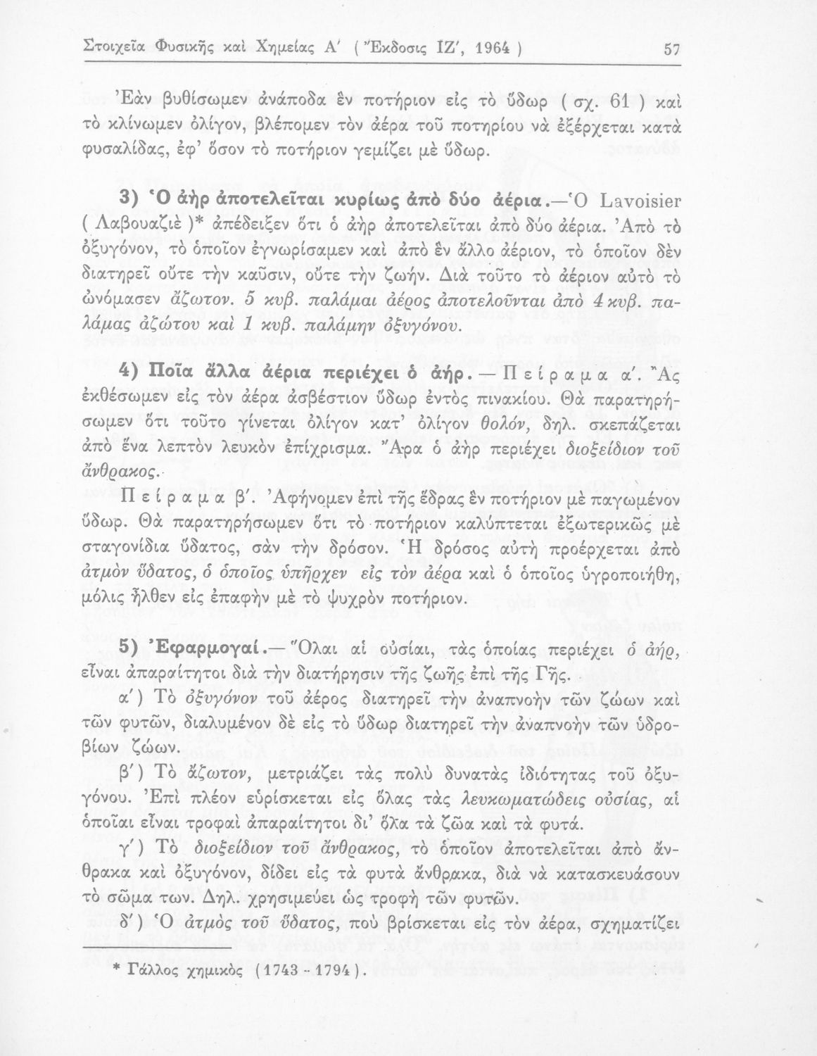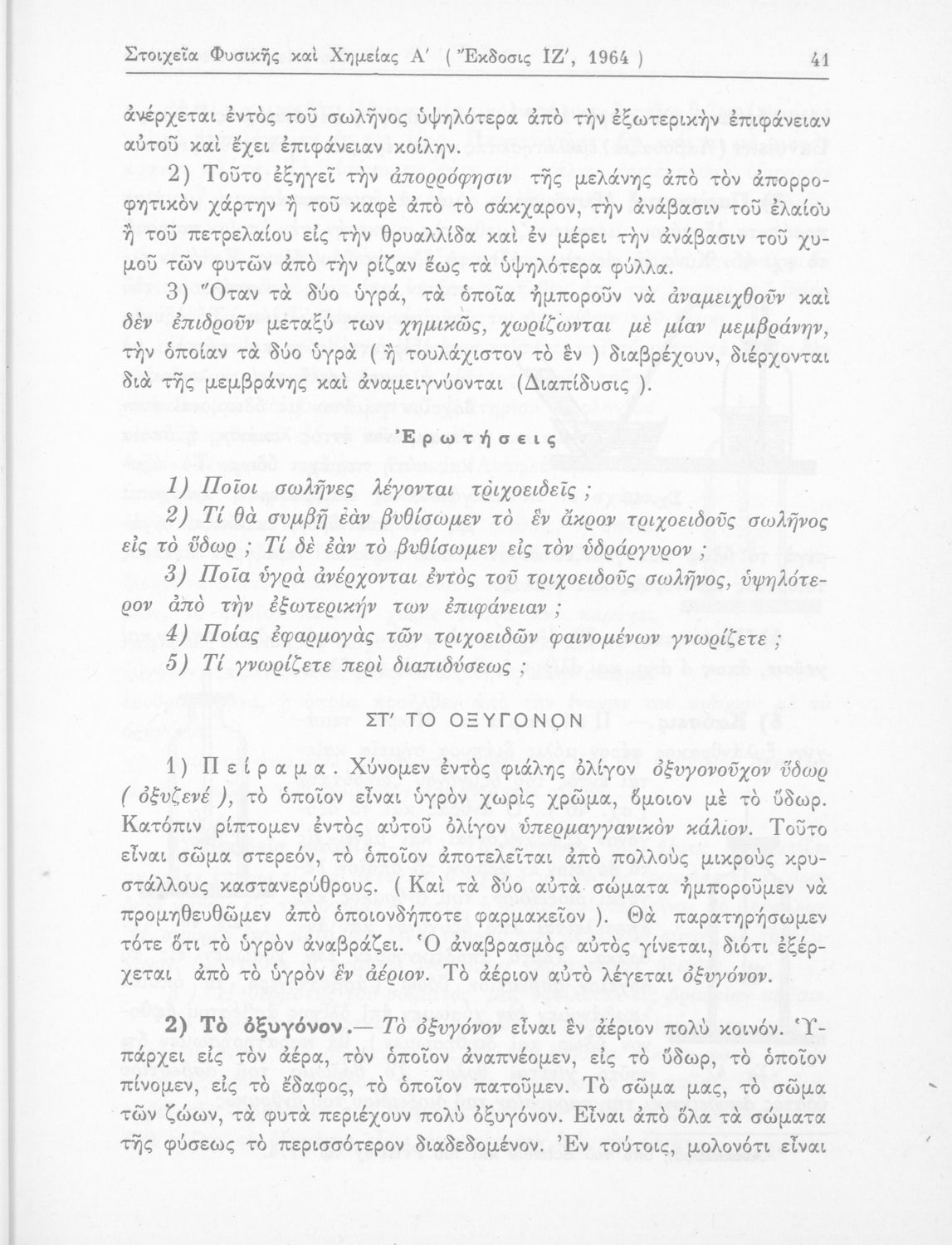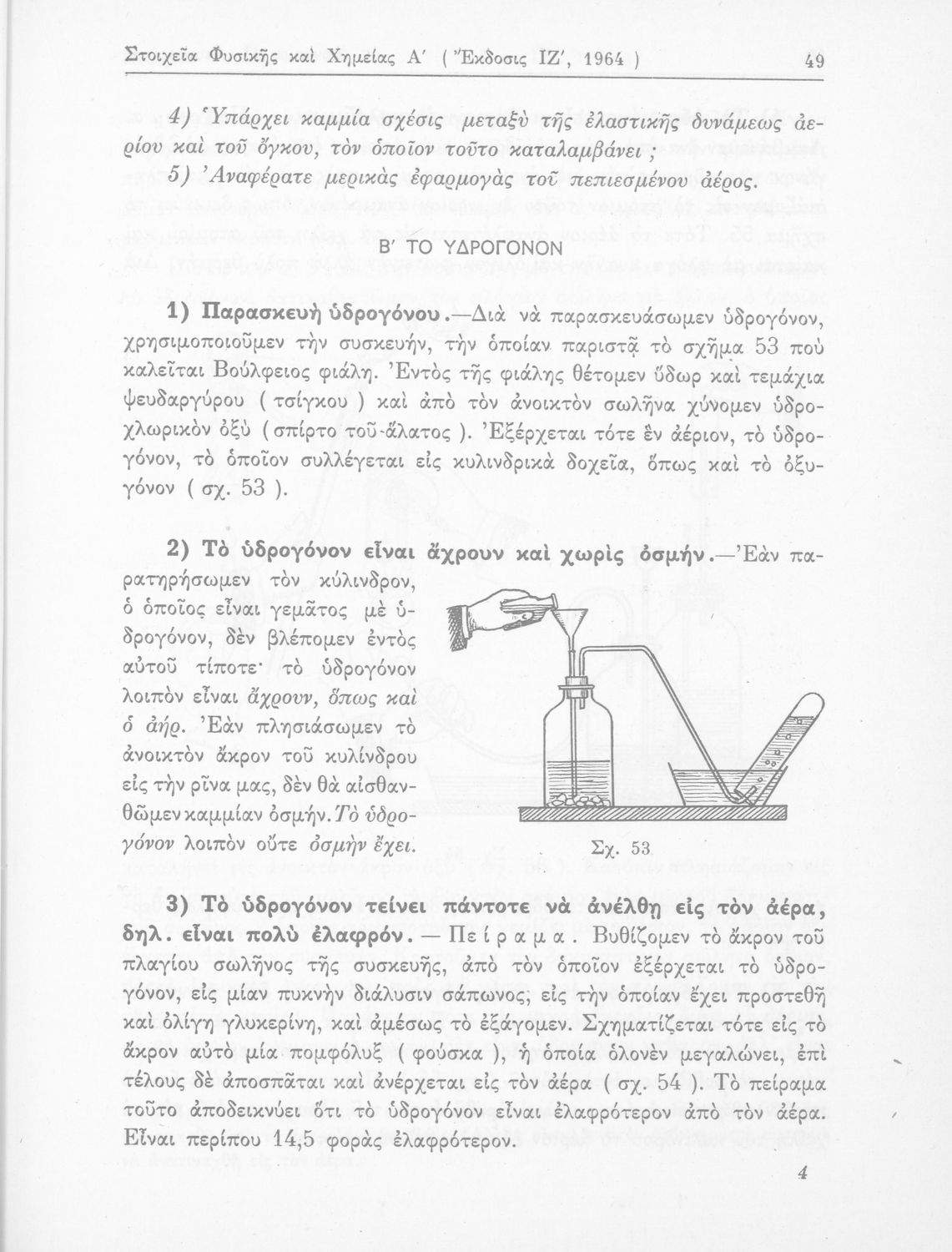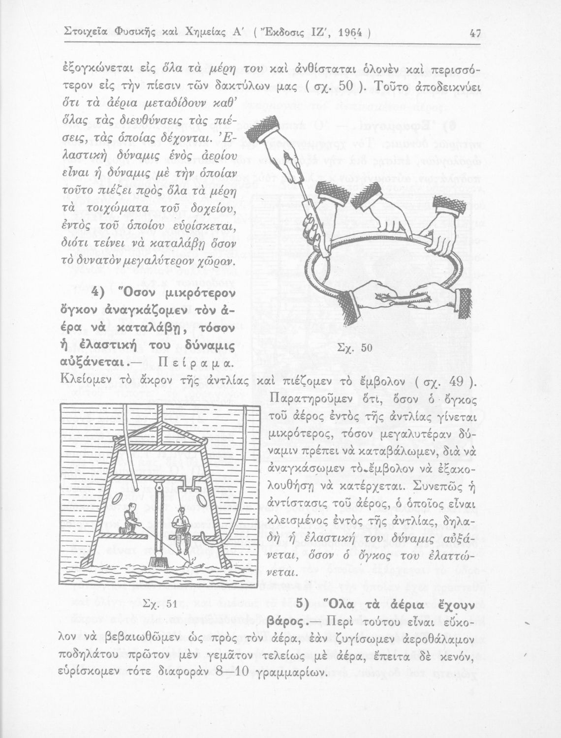 Σχολικό εγχειρίδιο Φυσικής και Χημείας που προσδιορίζει τη μηχανική στερεών σωμάτων, αναφέρει τις ιδιότητες ποικίλων στοιχείων της φύσης (οξυγόνο, υδρογόνο, αέρα, νερό) περιγράφοντας τις χημικές ενώσεις που προκαλούν.