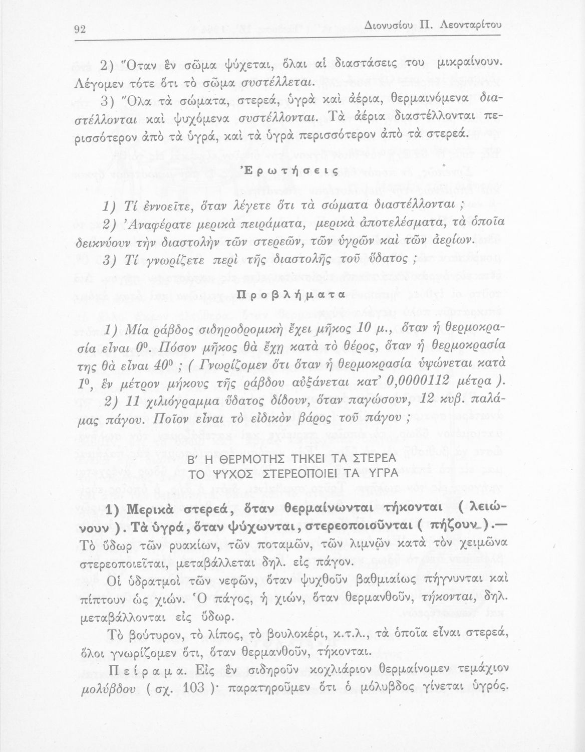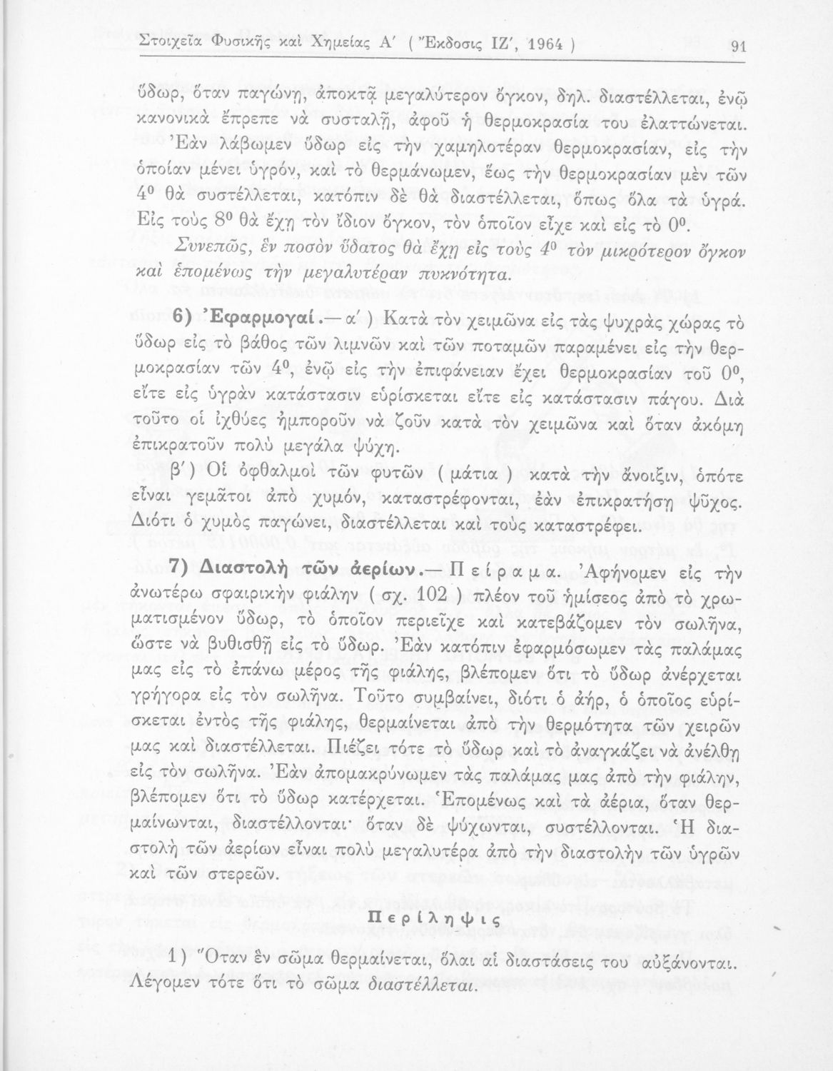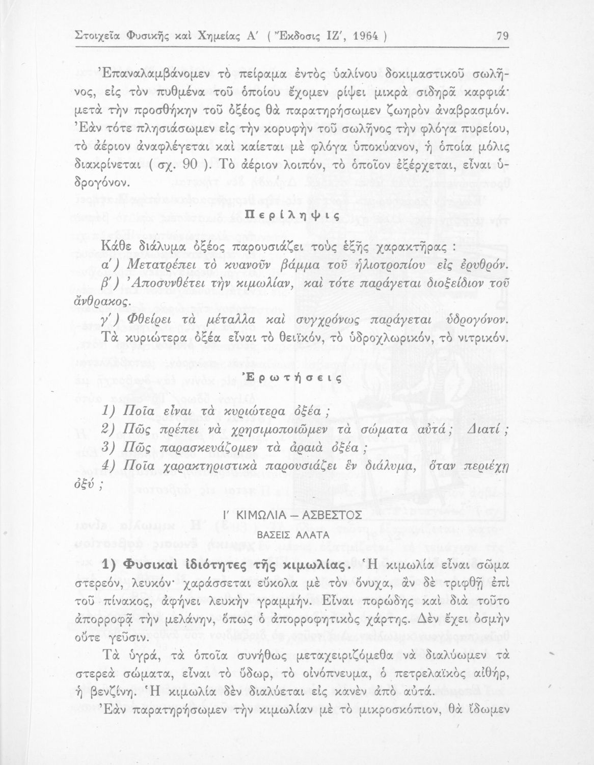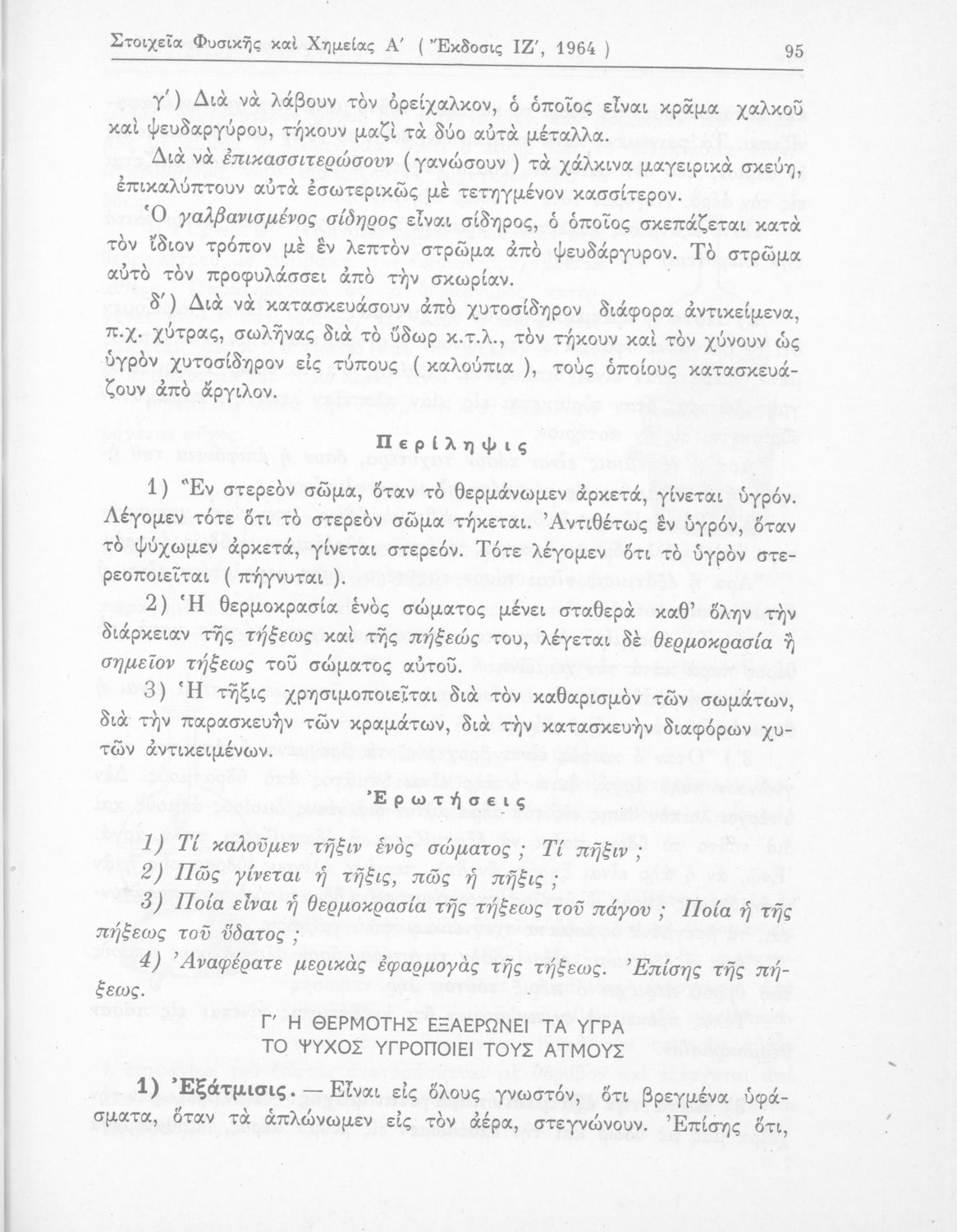 Παρουσίαση περιεχομένου: Σχολικό εγχειρίδιο Φυσικής και Χημείας που προσδιορίζει τη μηχανική στερεών σωμάτων, αναφέρει τις ιδιότητες ποικίλων στοιχείων της φύσης (οξυγόνο, υδρογόνο, αέρα, νερό) περιγράφοντας τις χημικές ενώσεις που προκαλούν.