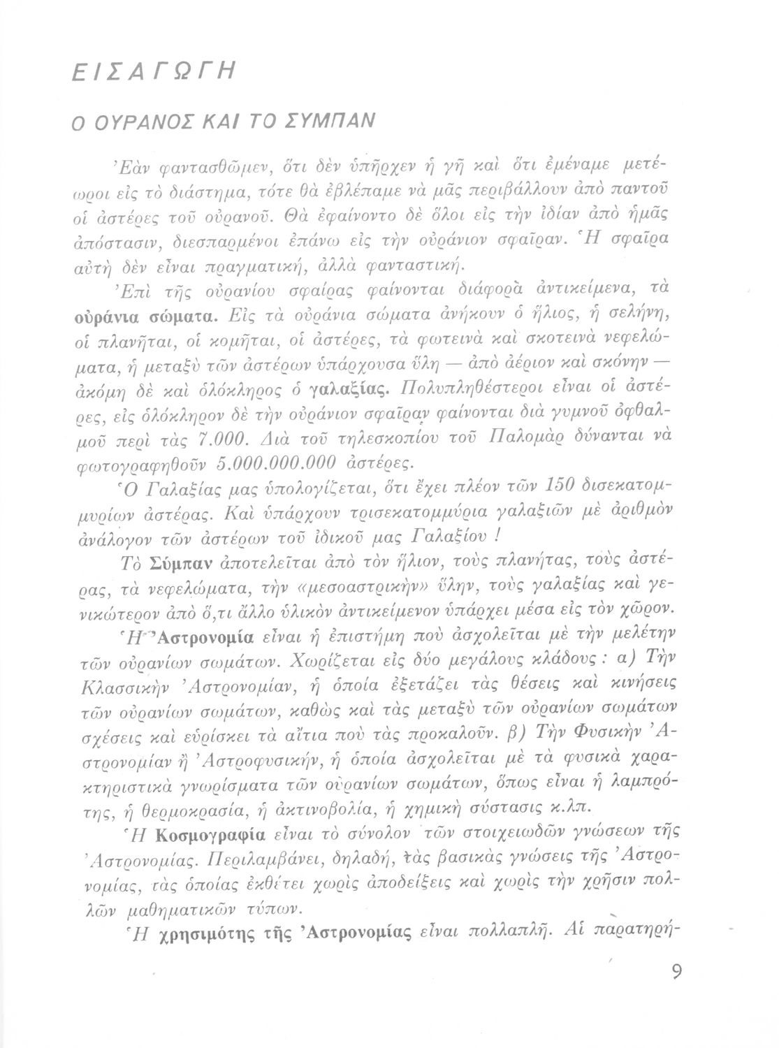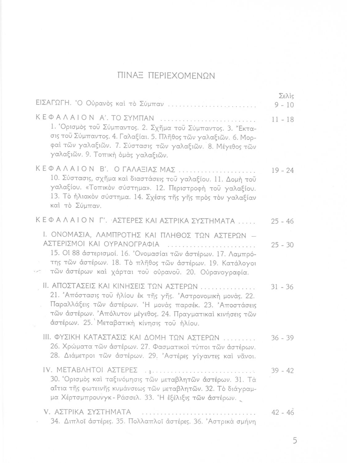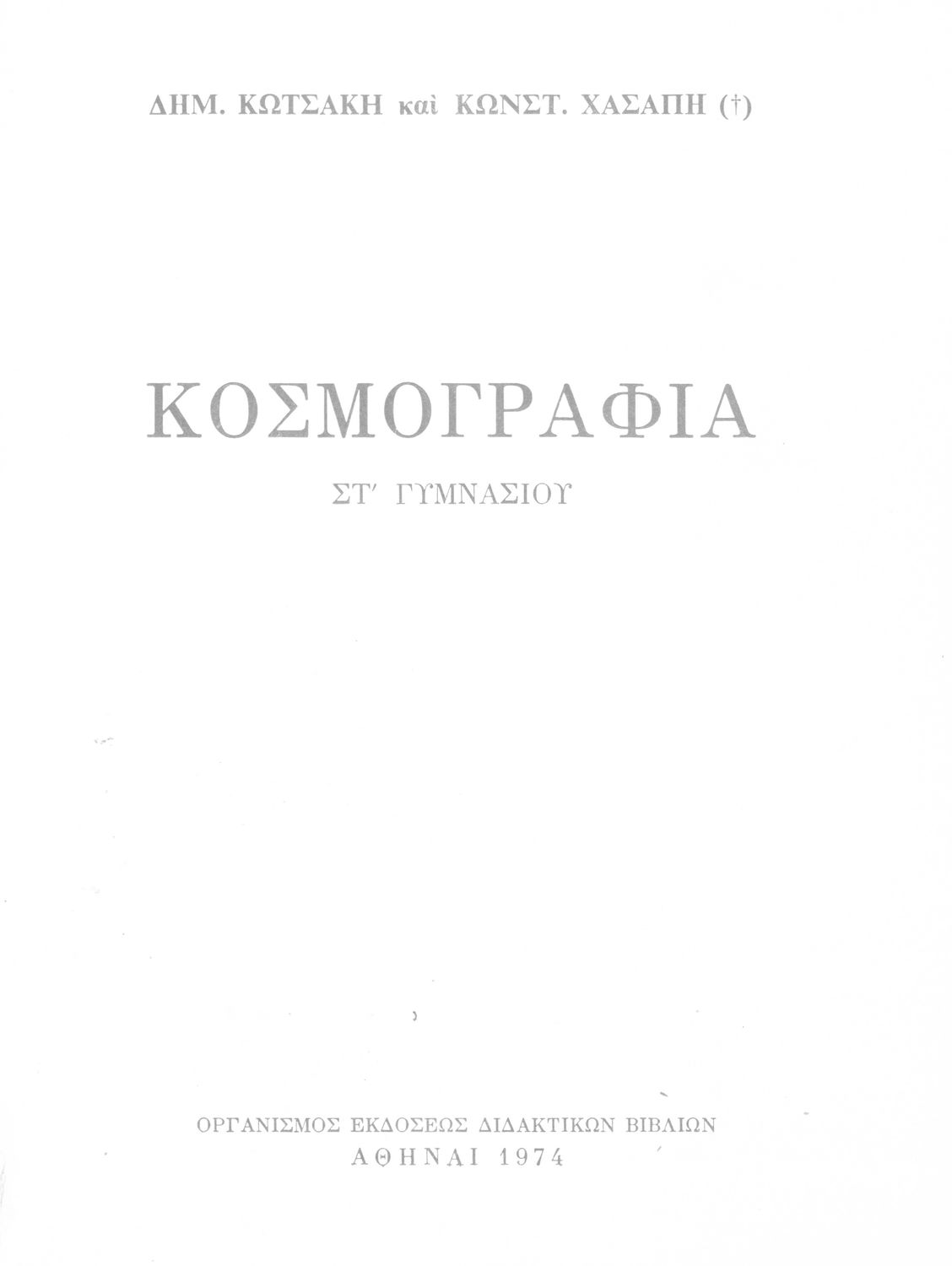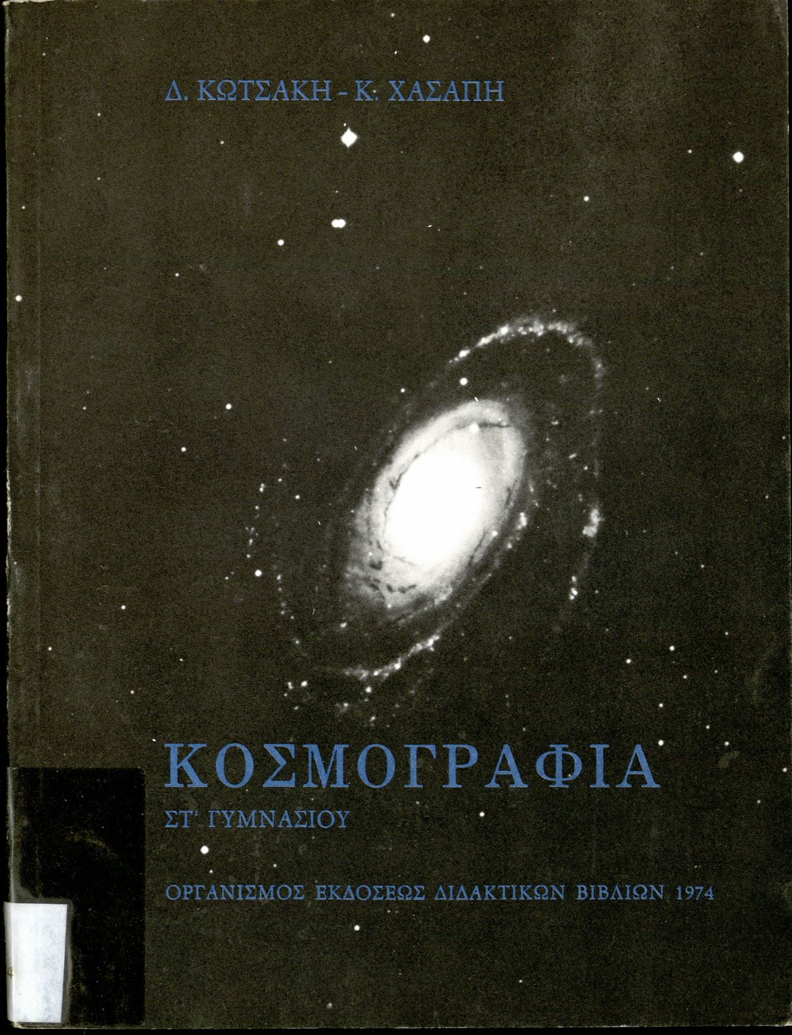 Σχολικό εγχειρίδιο Κοσμογραφίας ΣΤ΄ Γυμνασίου που πραγματεύεται τη μορφή, σύσταση, μέγεθος και κίνηση των γαλαξιών και των πλανητών. Περιέχει στοιχεία αστροναυτικής και πίνακα με 88 αστερισμούς, τα διεθνή ονόματα και τα σύμβολά τους.
